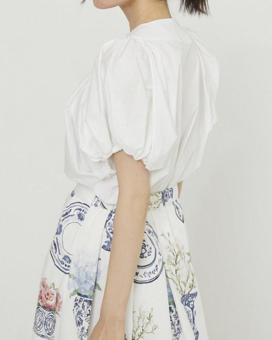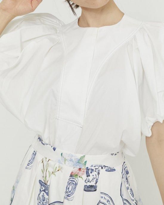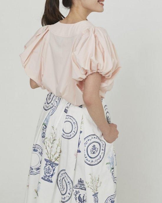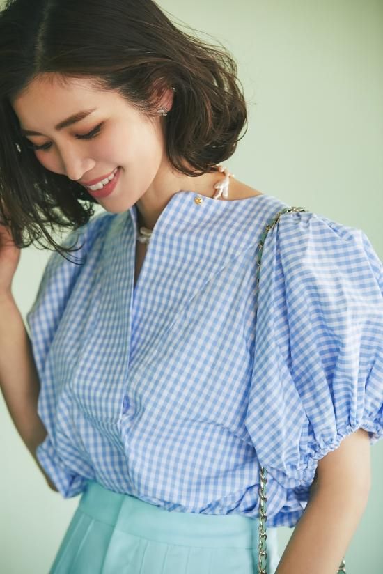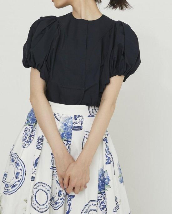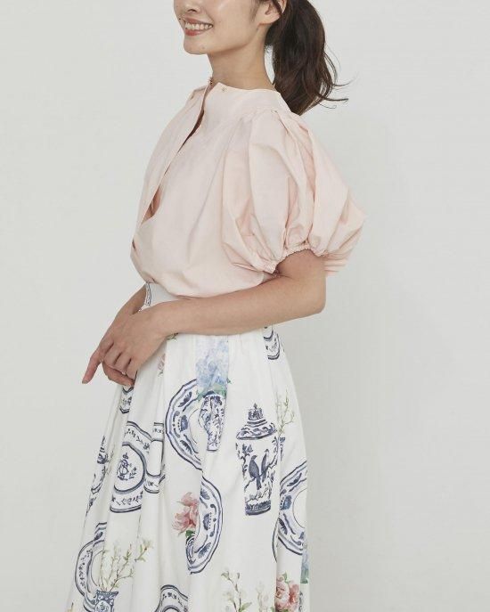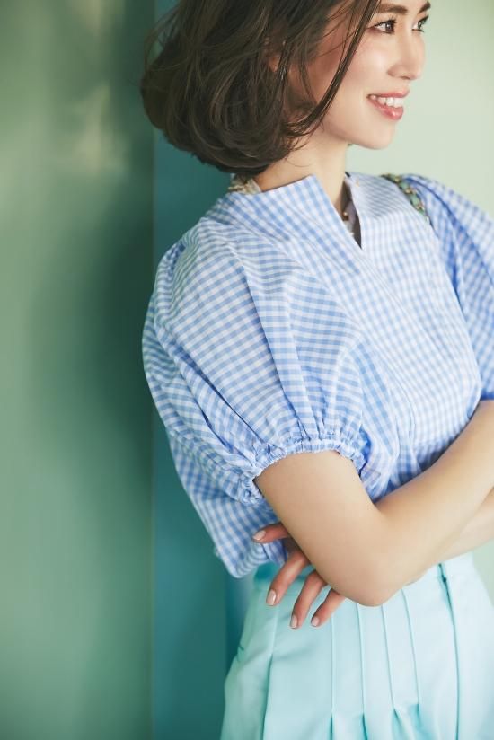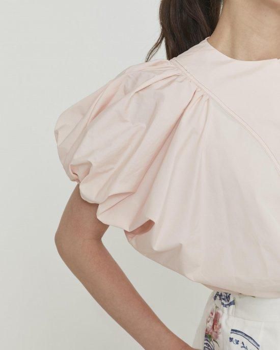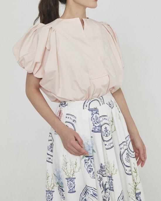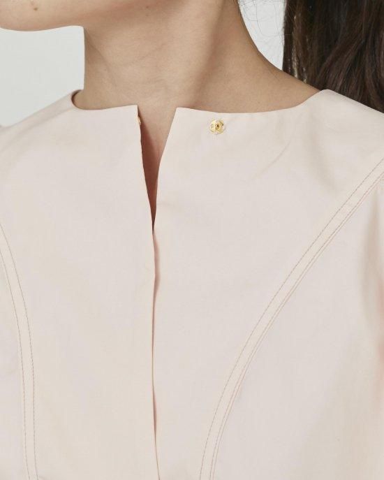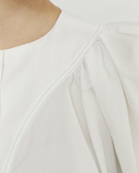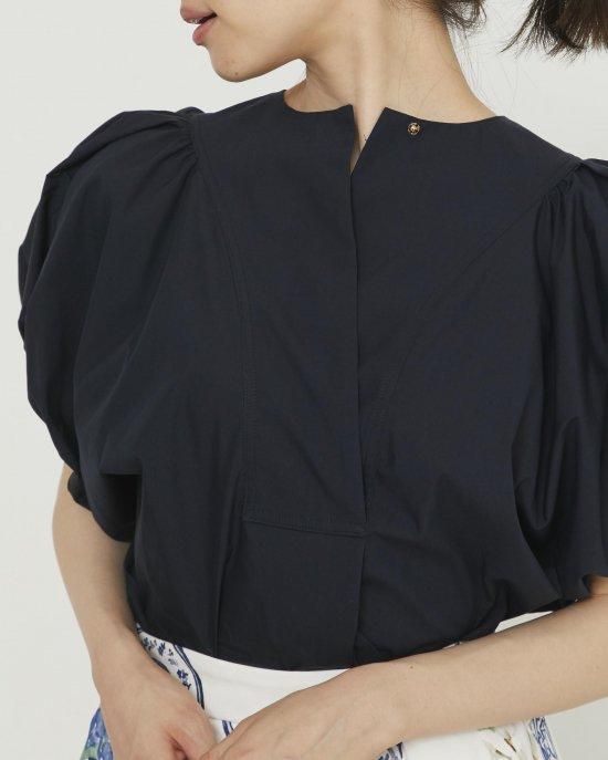 袖口のゴムが贅沢な分量の生地を美しくまとめます。トップのスナップボタンはゴールドでワンポイントに。留めたり外したりと雰囲気を変えて楽しめます。