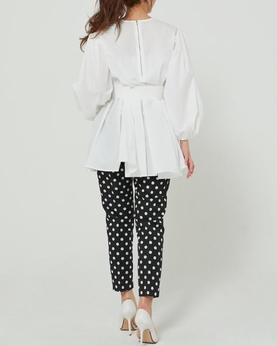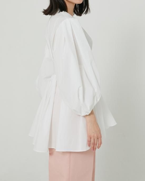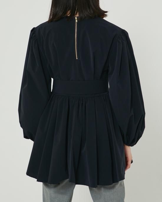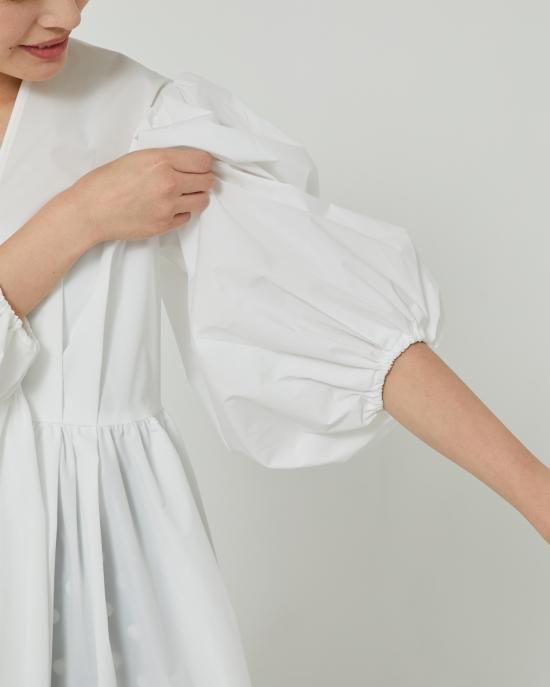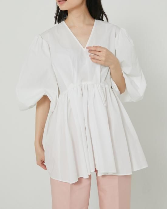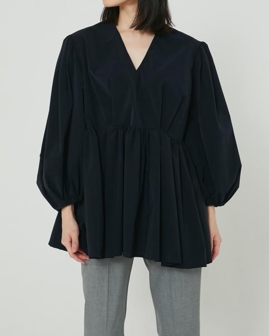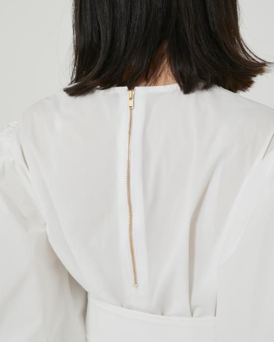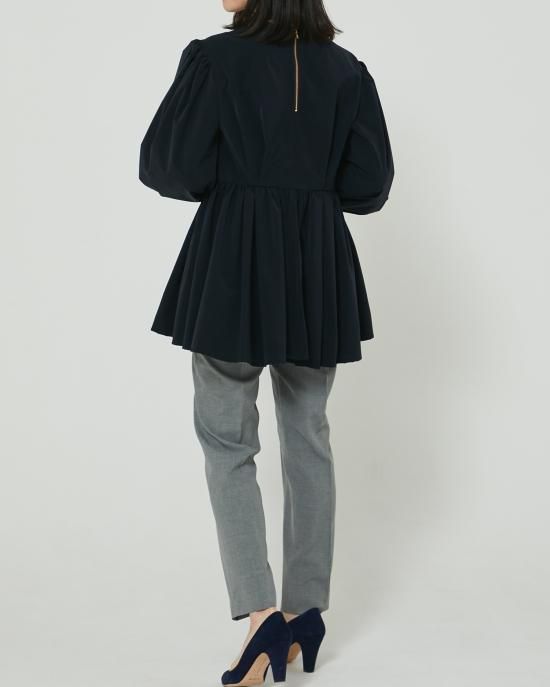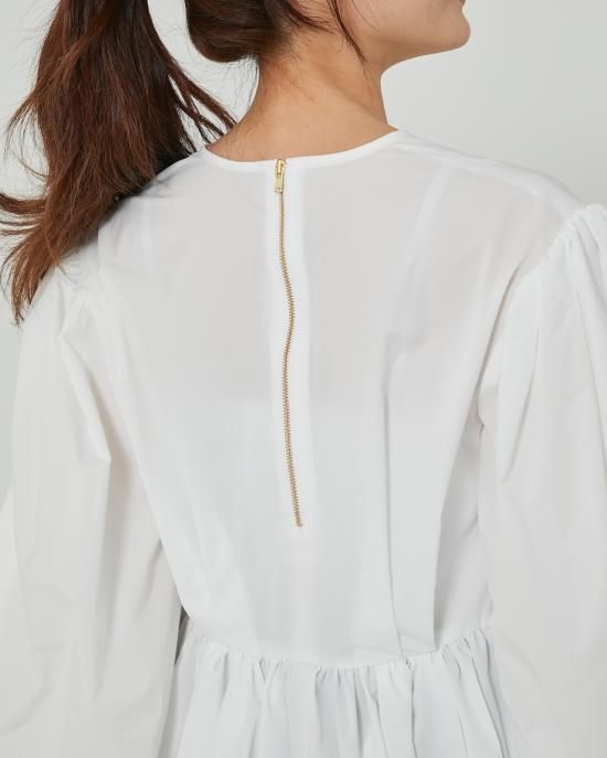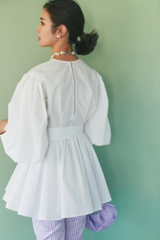 袖のボリューム感とウエストのギャザーで広がりとメリハリのあるシルエットに。