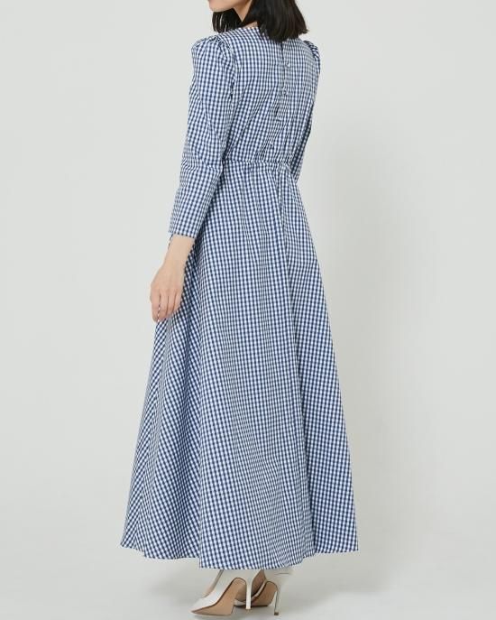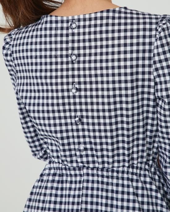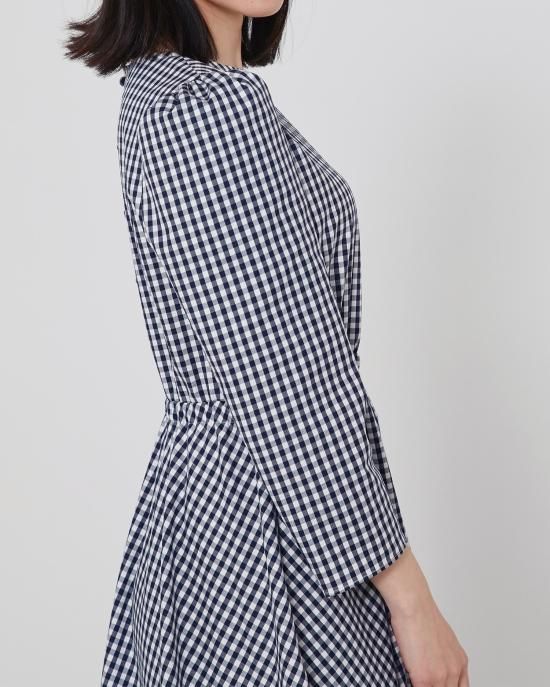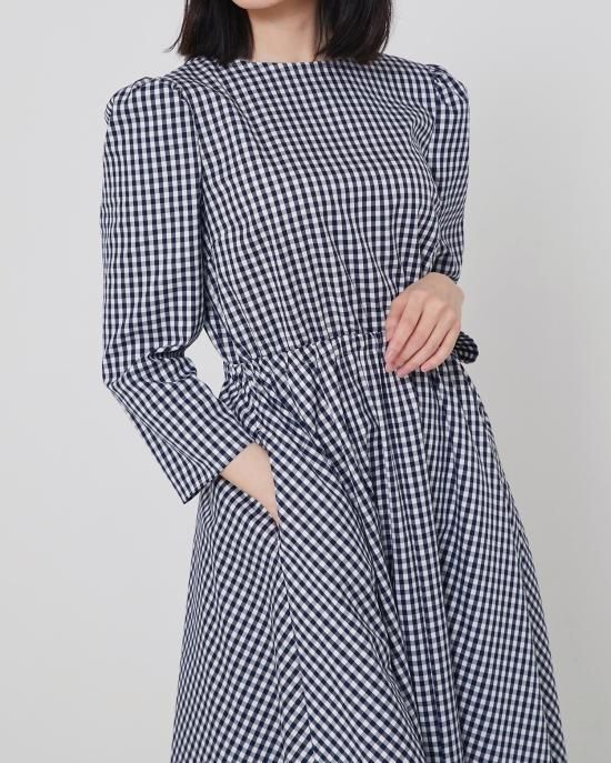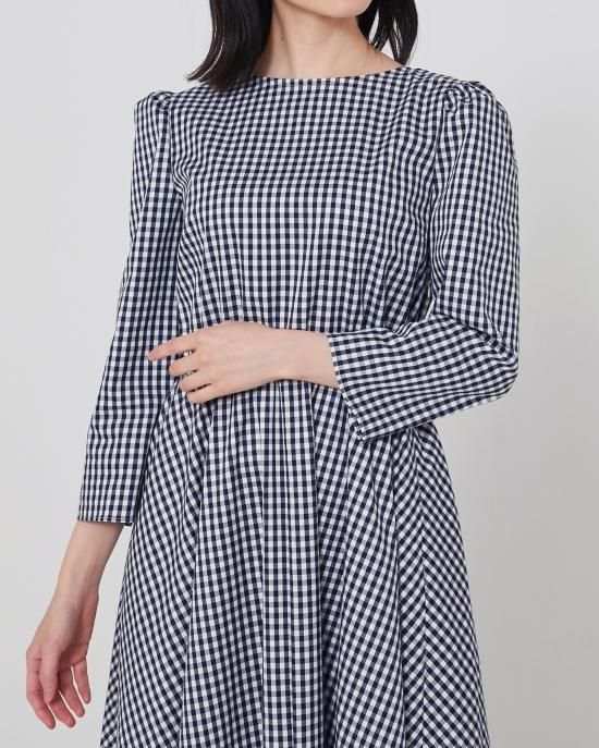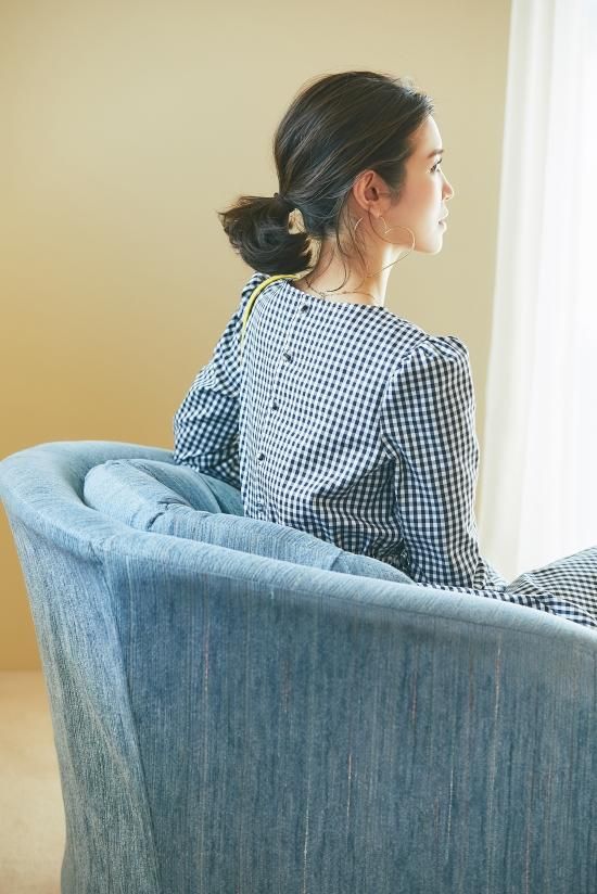 肩はギャザーが入ったパフスリーブ、袖はストレートシルエットで、上半身をシャープに見せてくれます。