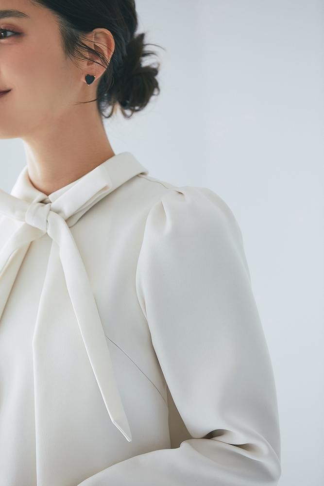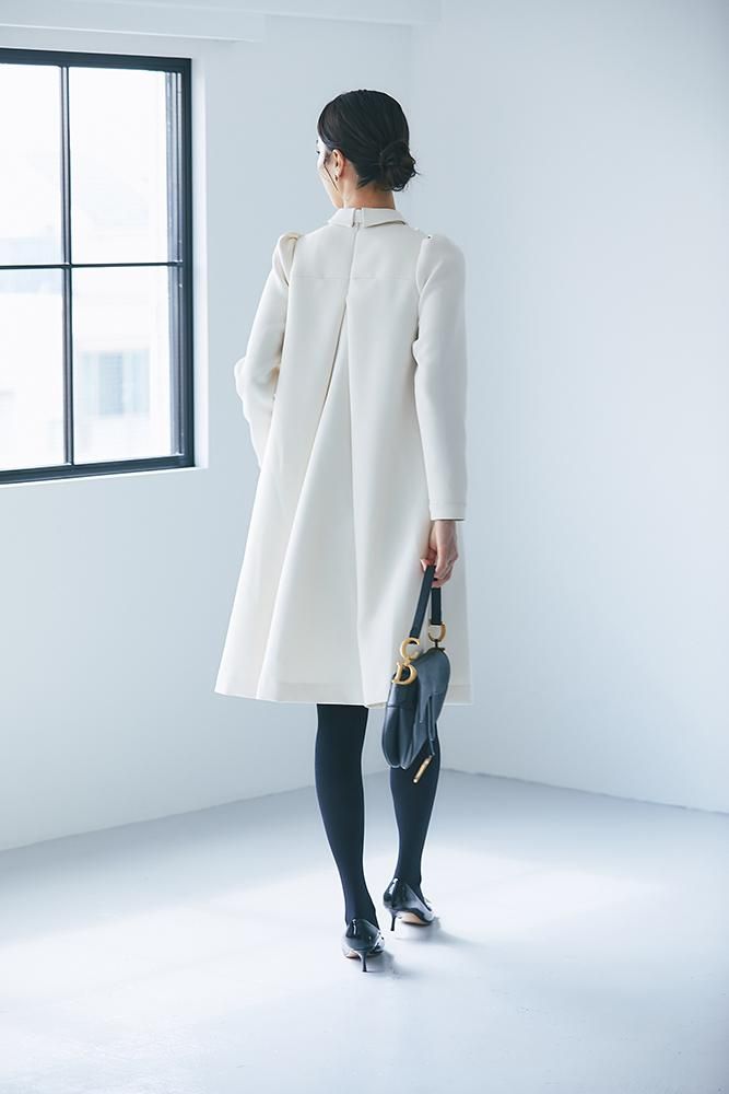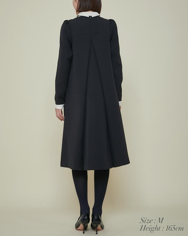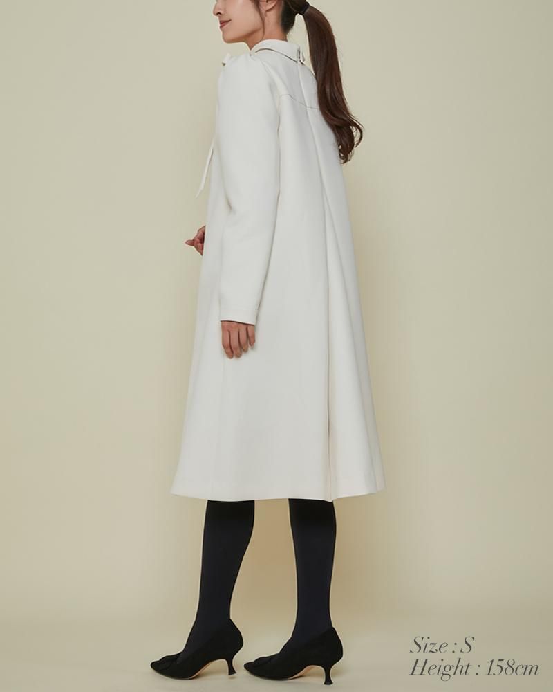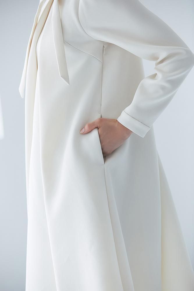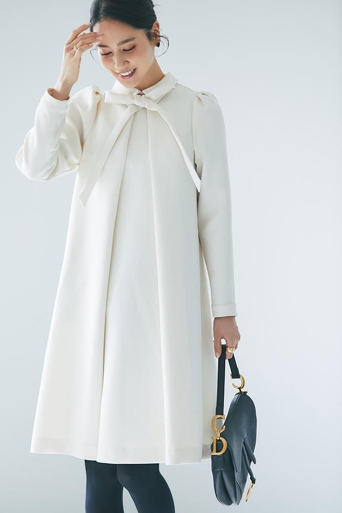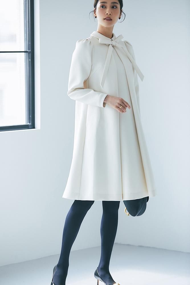 エレガントなAラインシルエットをタックとハリのある素材でモードに昇華させたボウタイワンピース。