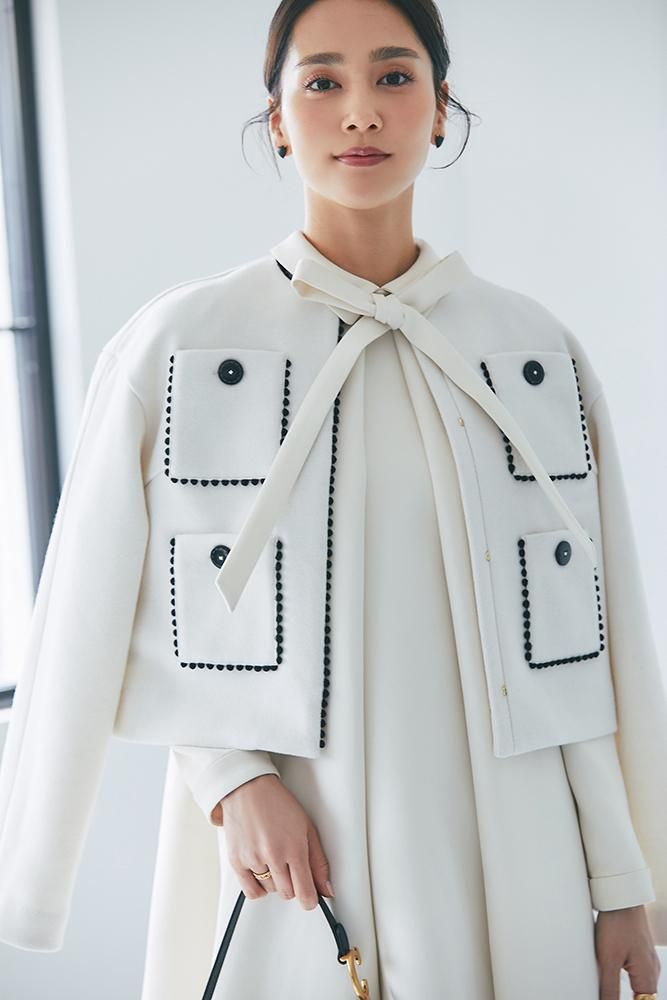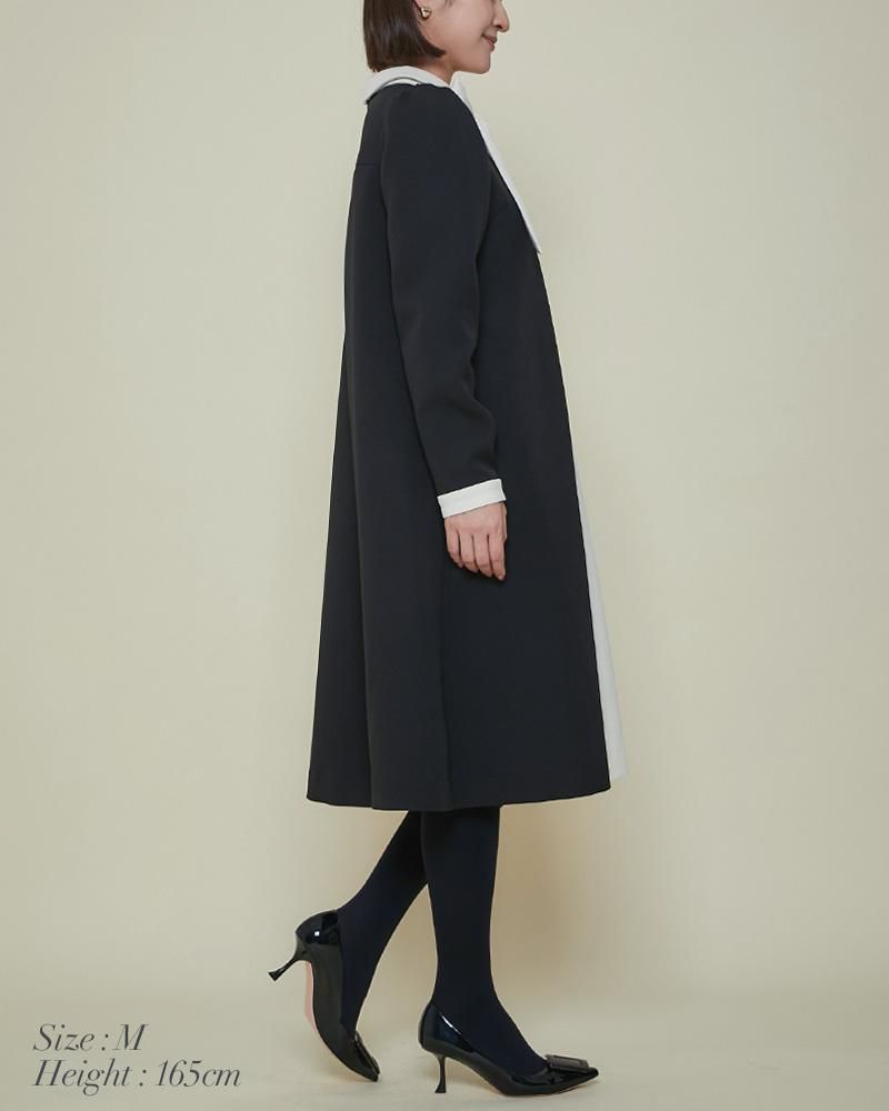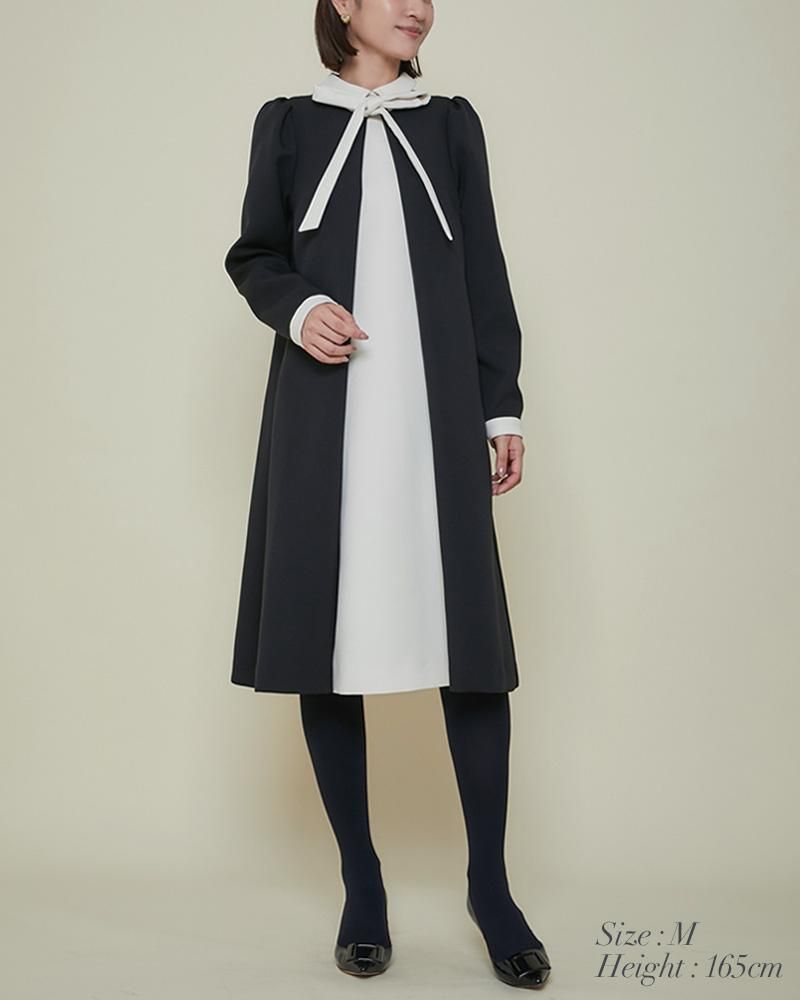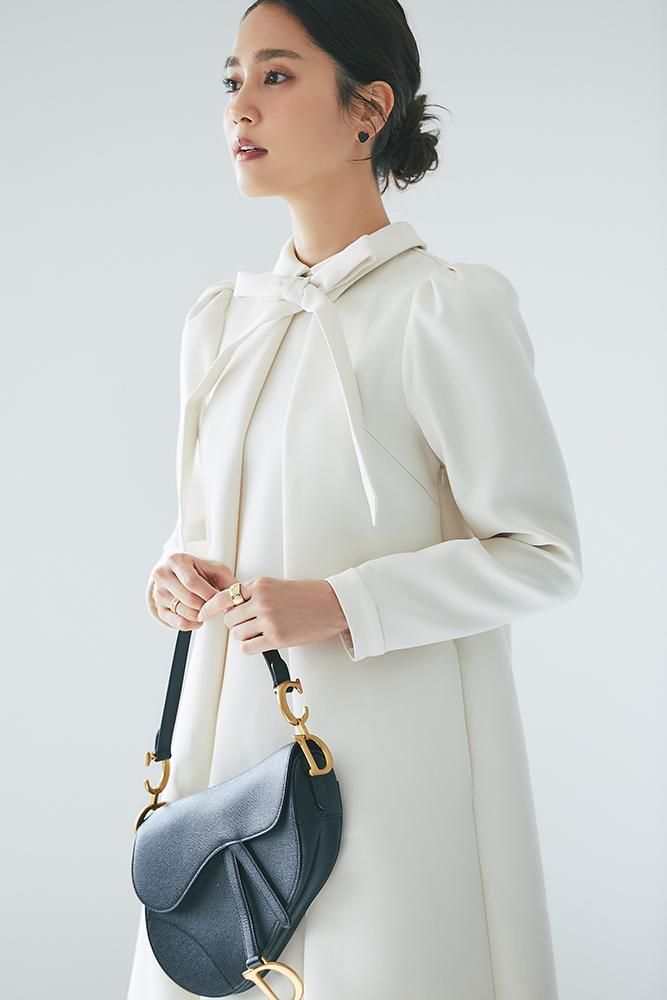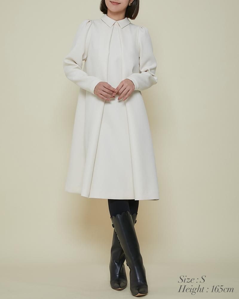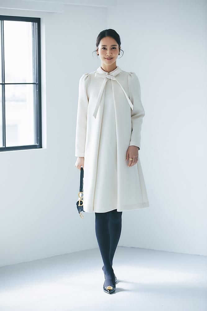 エレガントなAラインシルエットをタックとハリのある素材でモードに昇華させたボウタイワンピース。