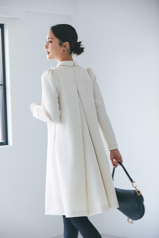 フロントとバックに大きくタックをいれ、立体的で動きのある、どの角度からも着映えするデザイン。