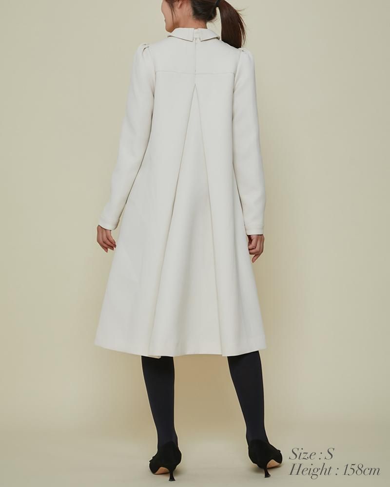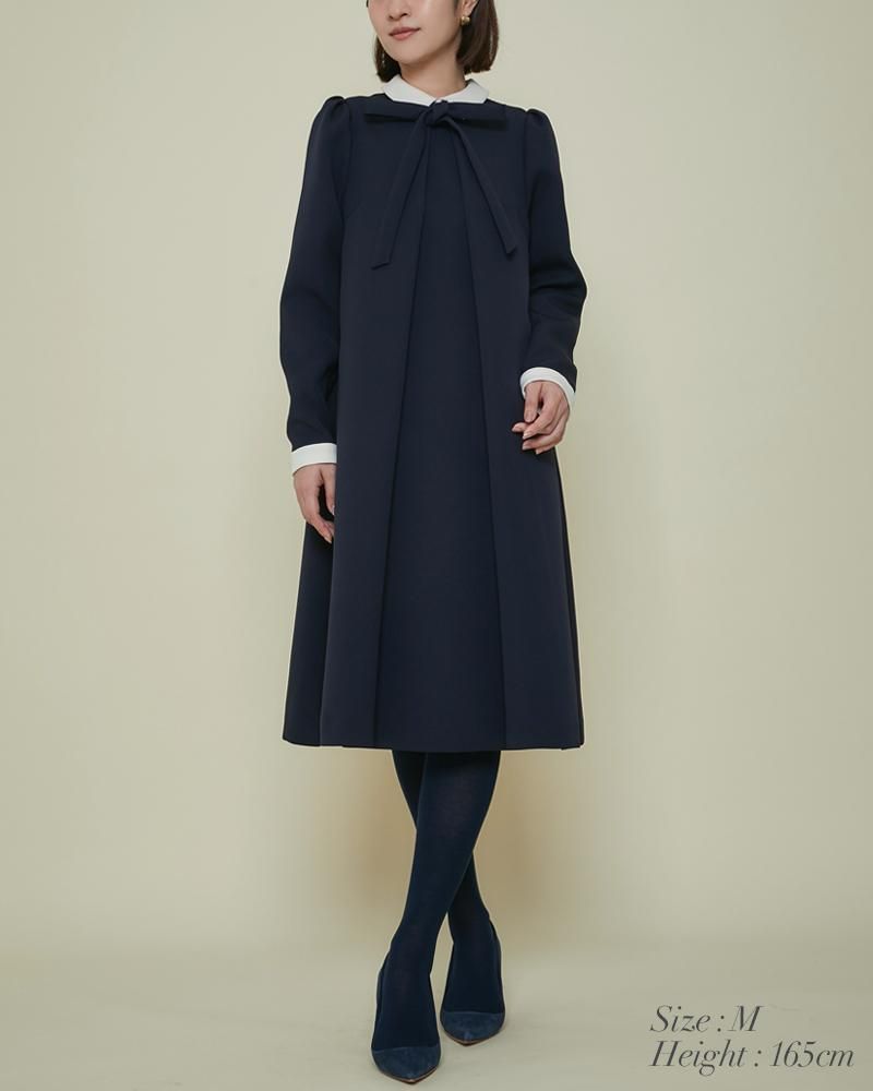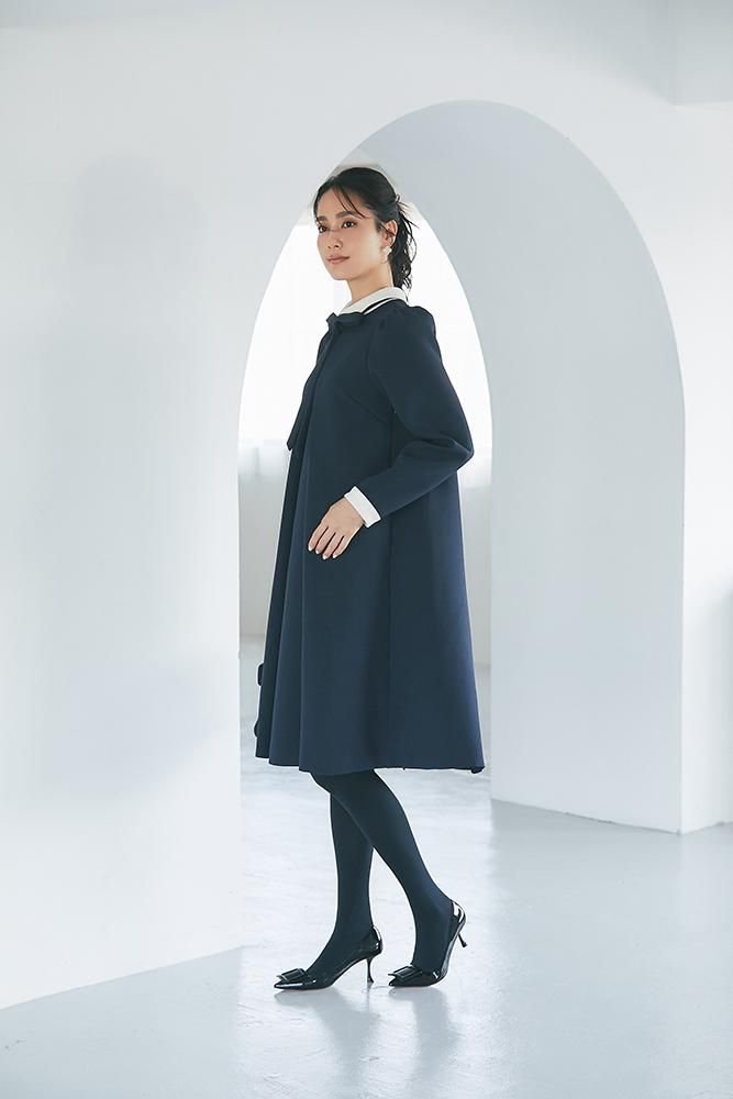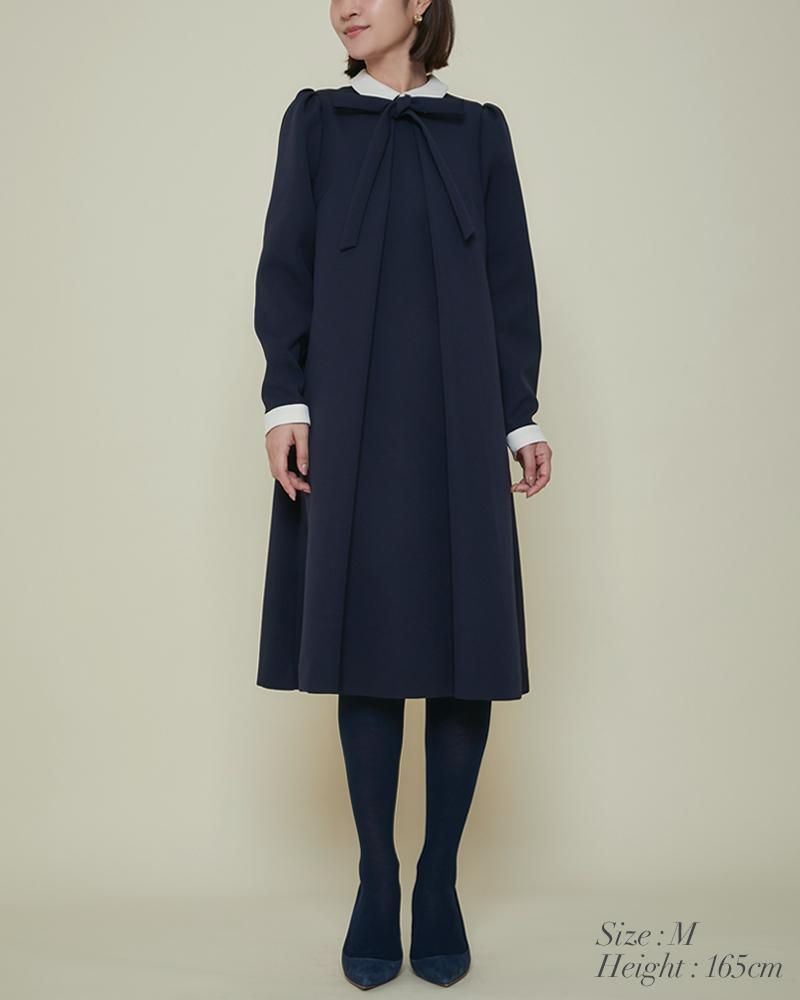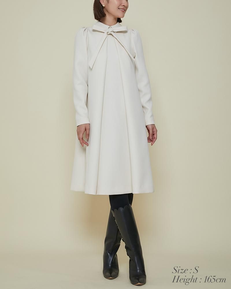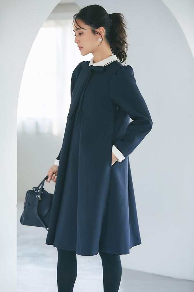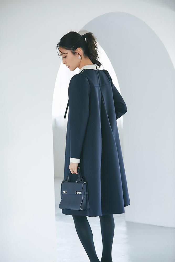 エレガントなAラインシルエットをタックとハリのある素材でモードに昇華させたボウタイワンピース。