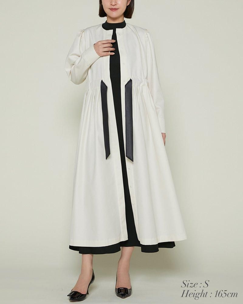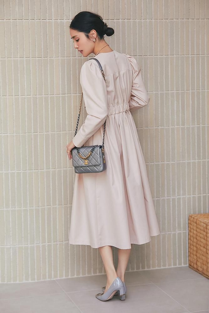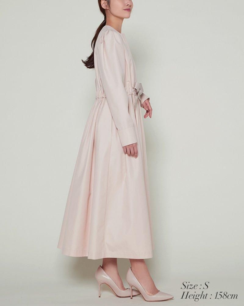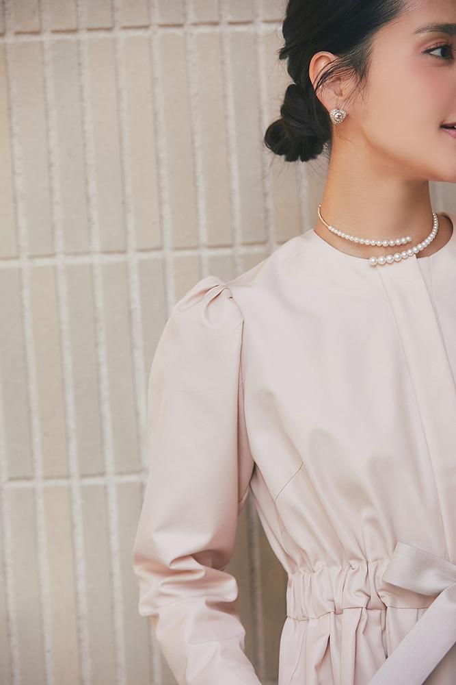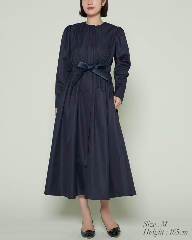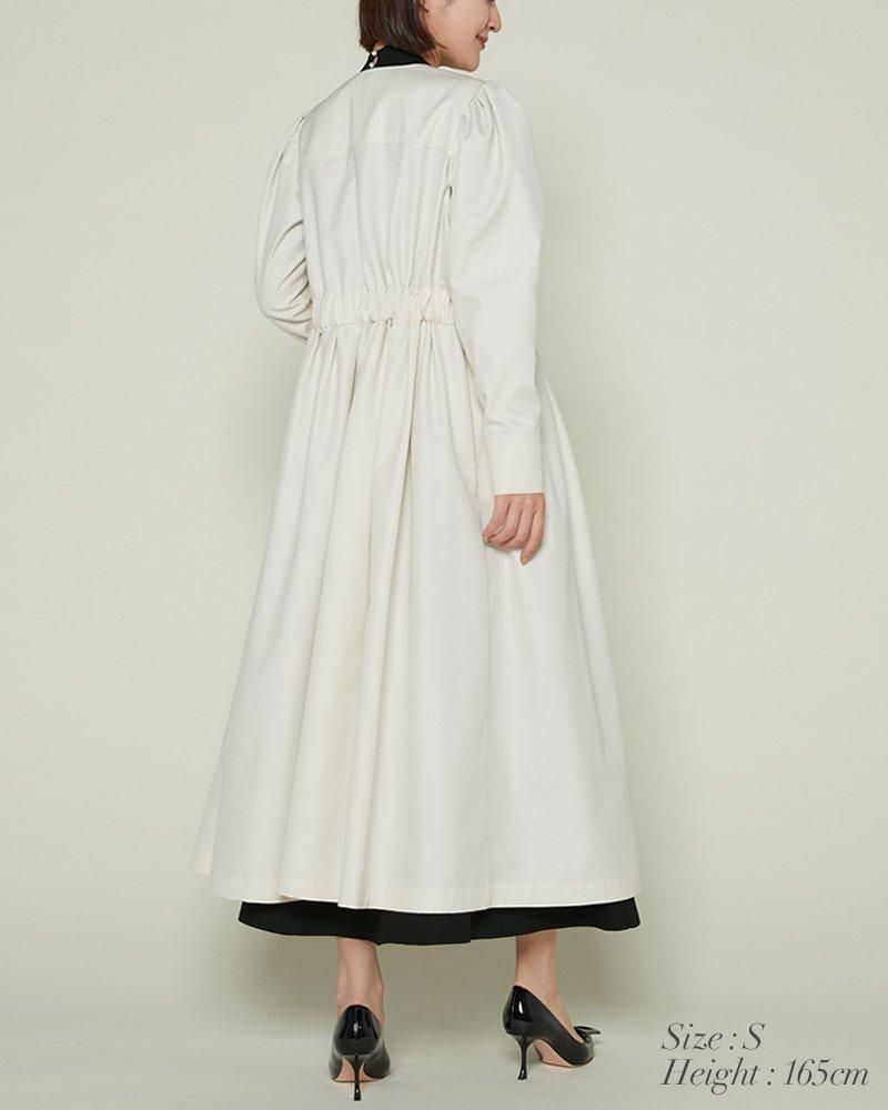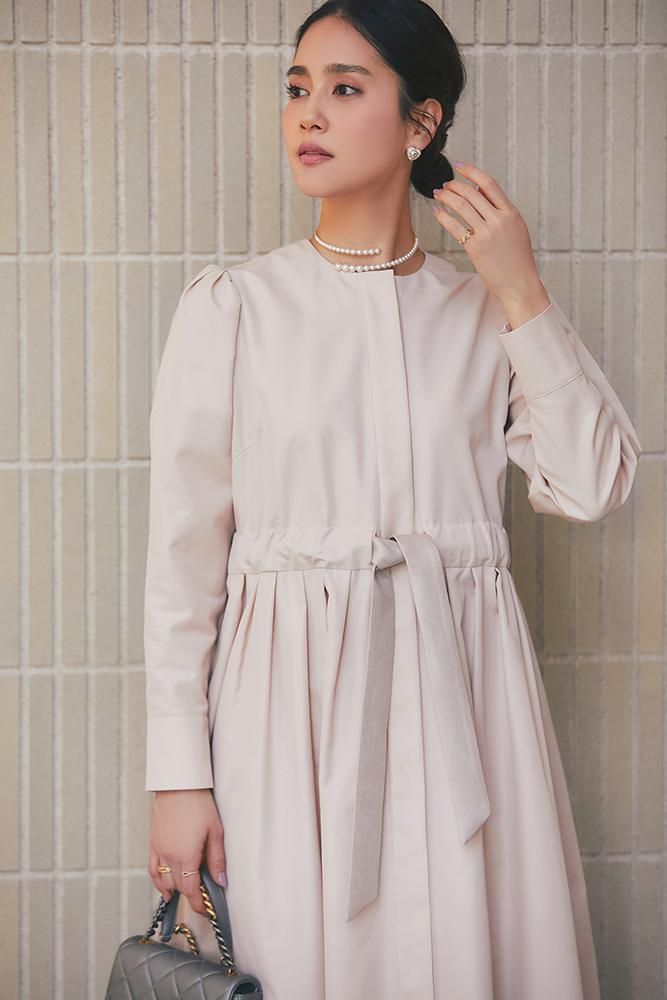 ノーカラーで装飾レスの飽きのこないシンプルさと、ふんわりした肩のシルエットやたっぷりとしたスカートで一枚で様になる華やかさを兼備しています。