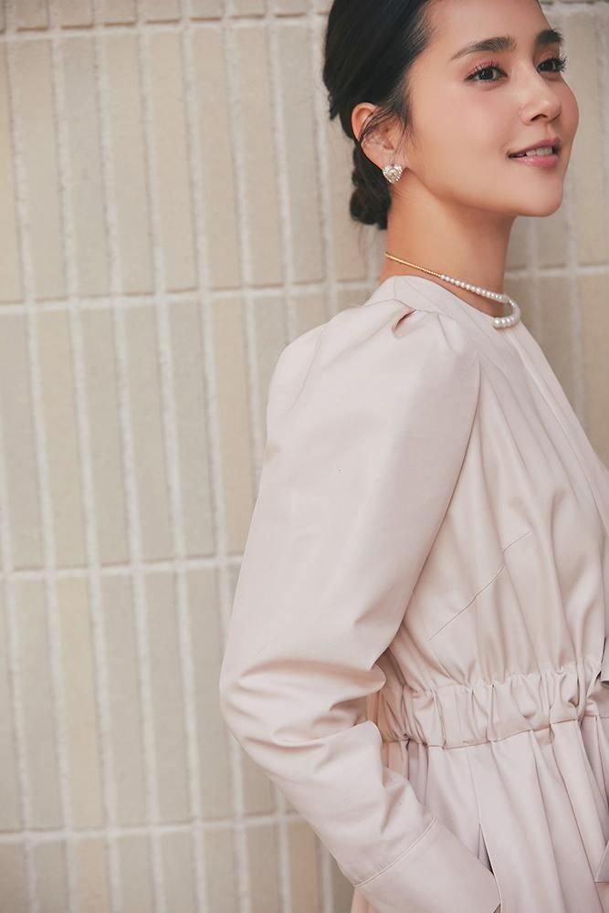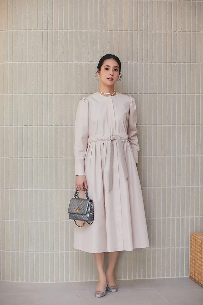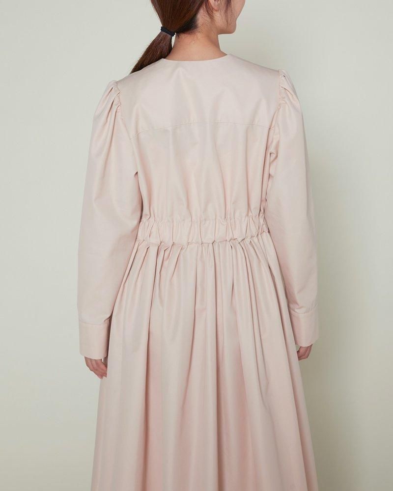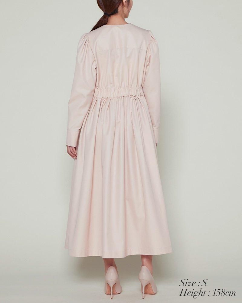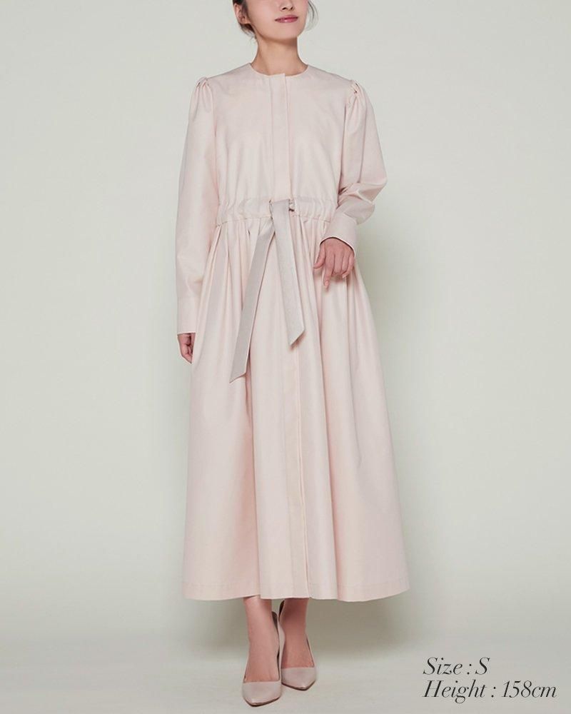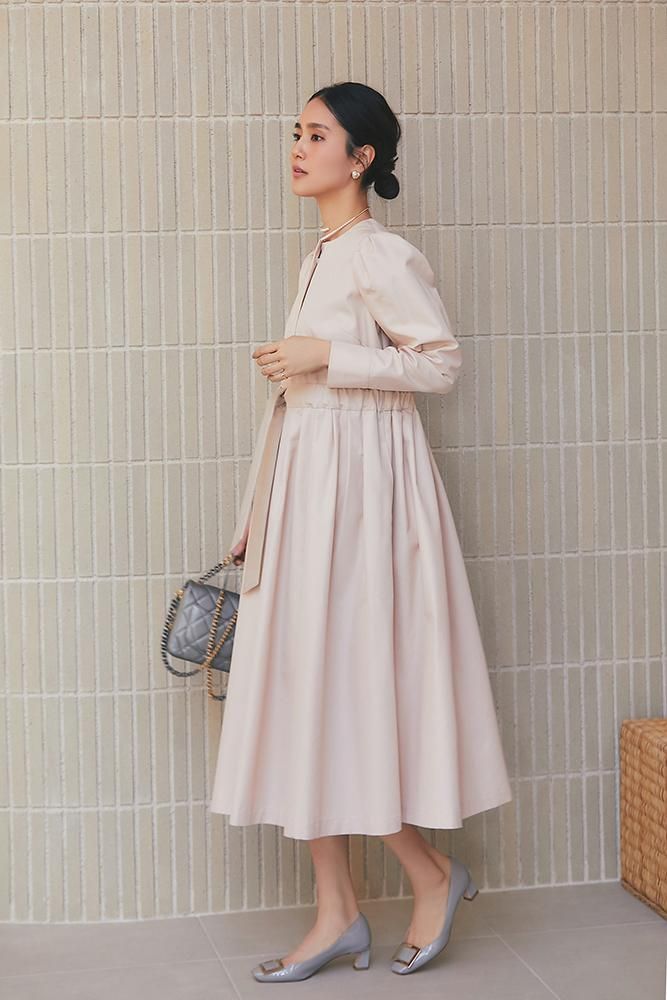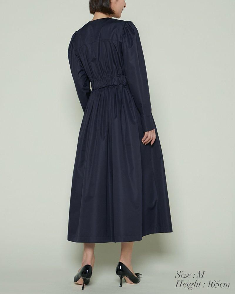 ノーカラーで装飾レスの飽きのこないシンプルさと、ふんわりした肩のシルエットやたっぷりとしたスカートで一枚で様になる華やかさを兼備しています。