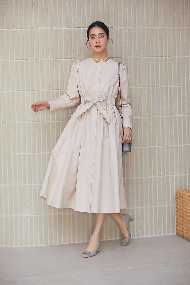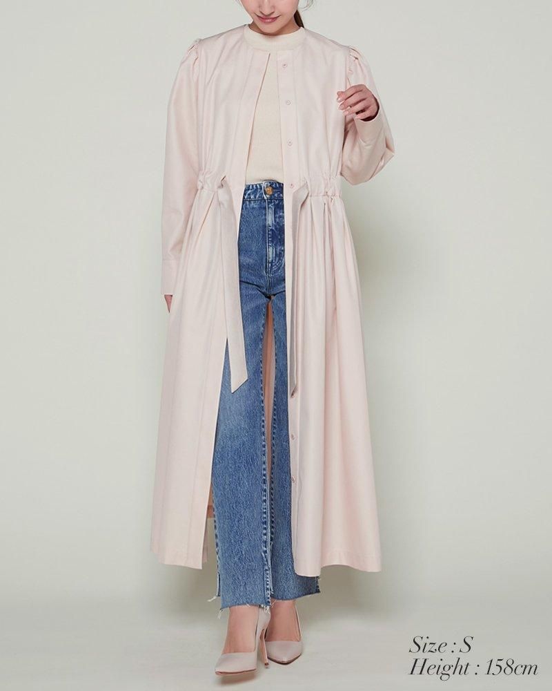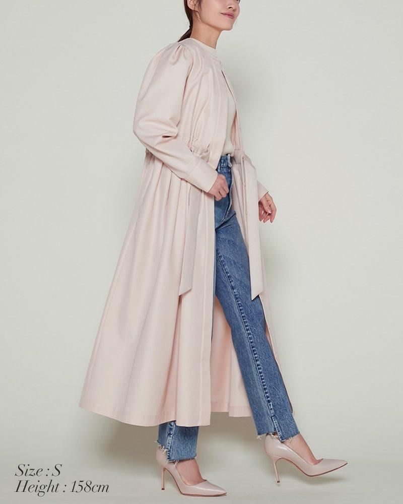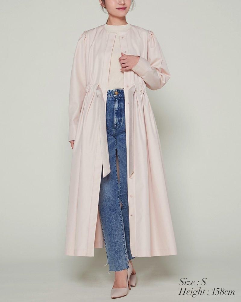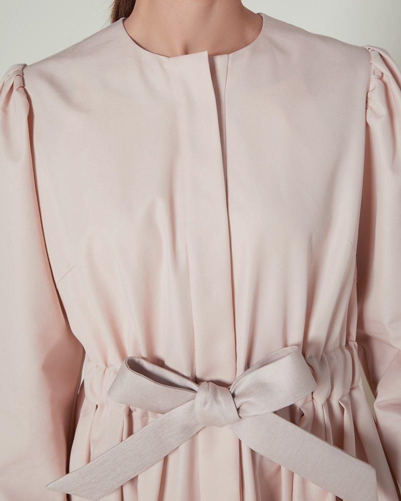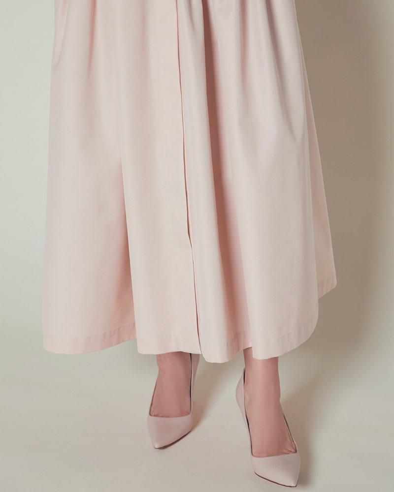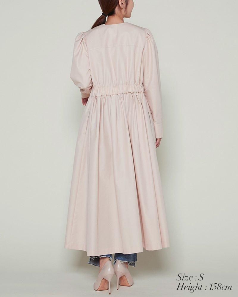 ノーカラーで装飾レスの飽きのこないシンプルさと、ふんわりした肩のシルエットやたっぷりとしたスカートで一枚で様になる華やかさを兼備しています。