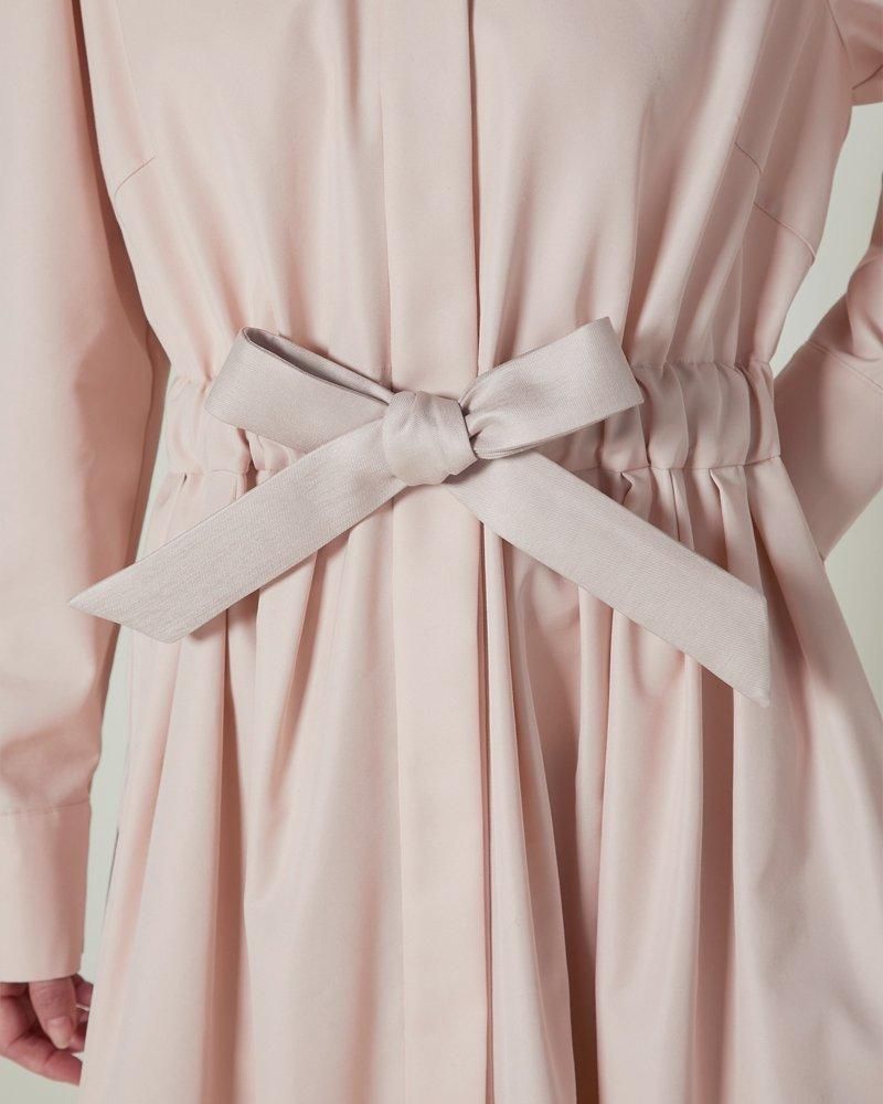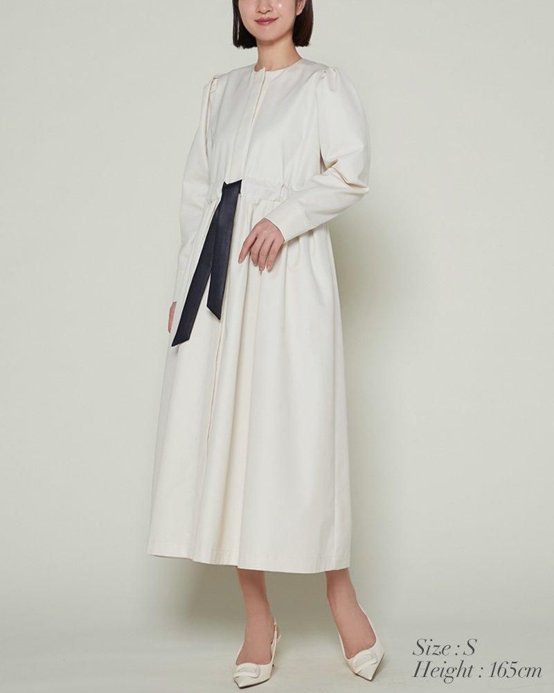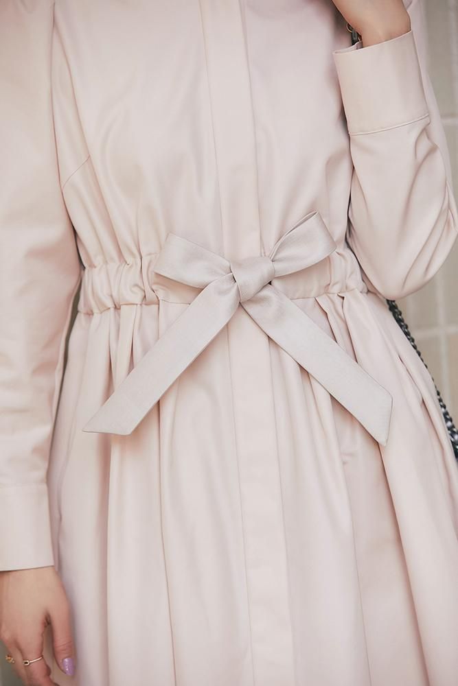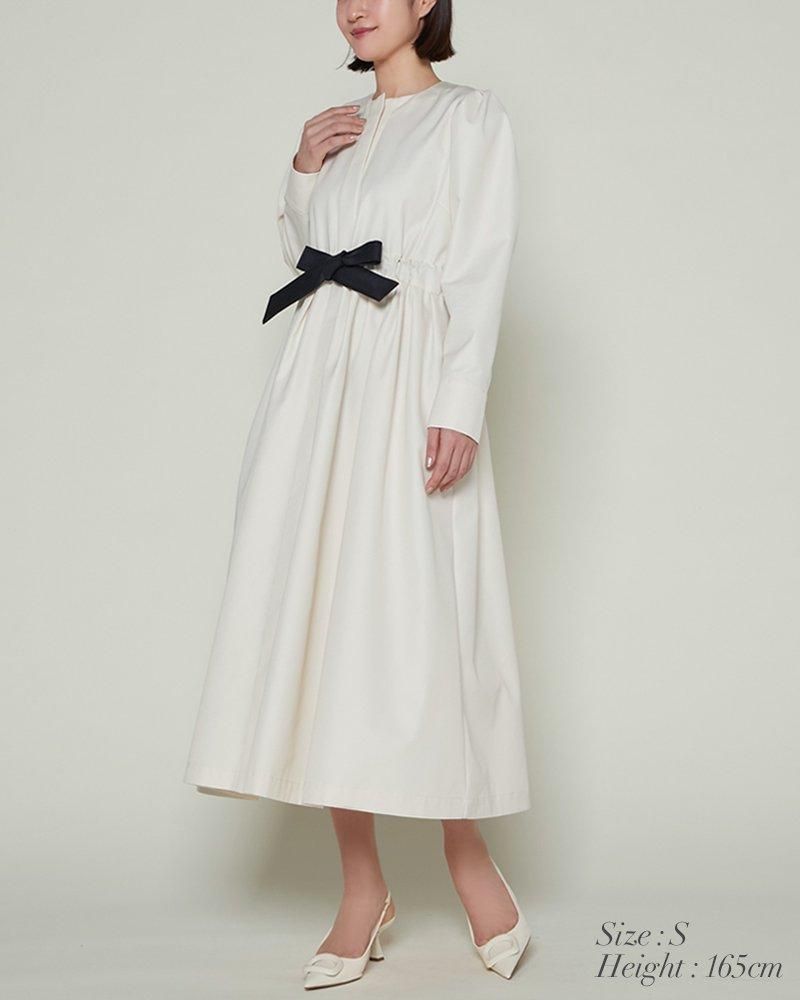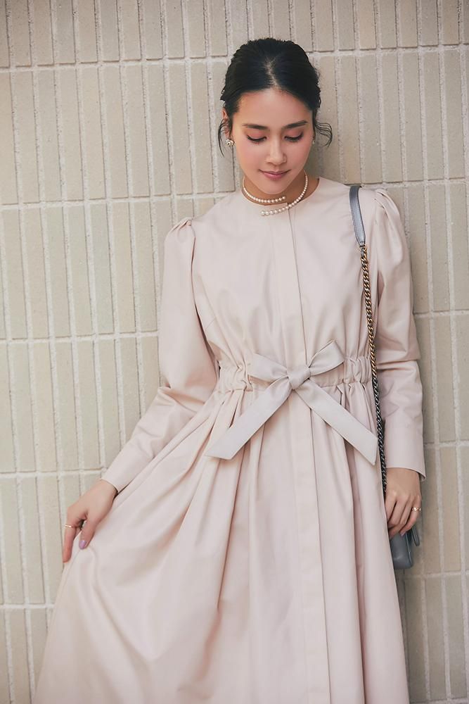 芯を入れハリをもたせたベルトは、ウエストをしっかりとマークするのでスタイルアップも叶い、結んだときのピンと張るリボンのシルエットもポイントです。