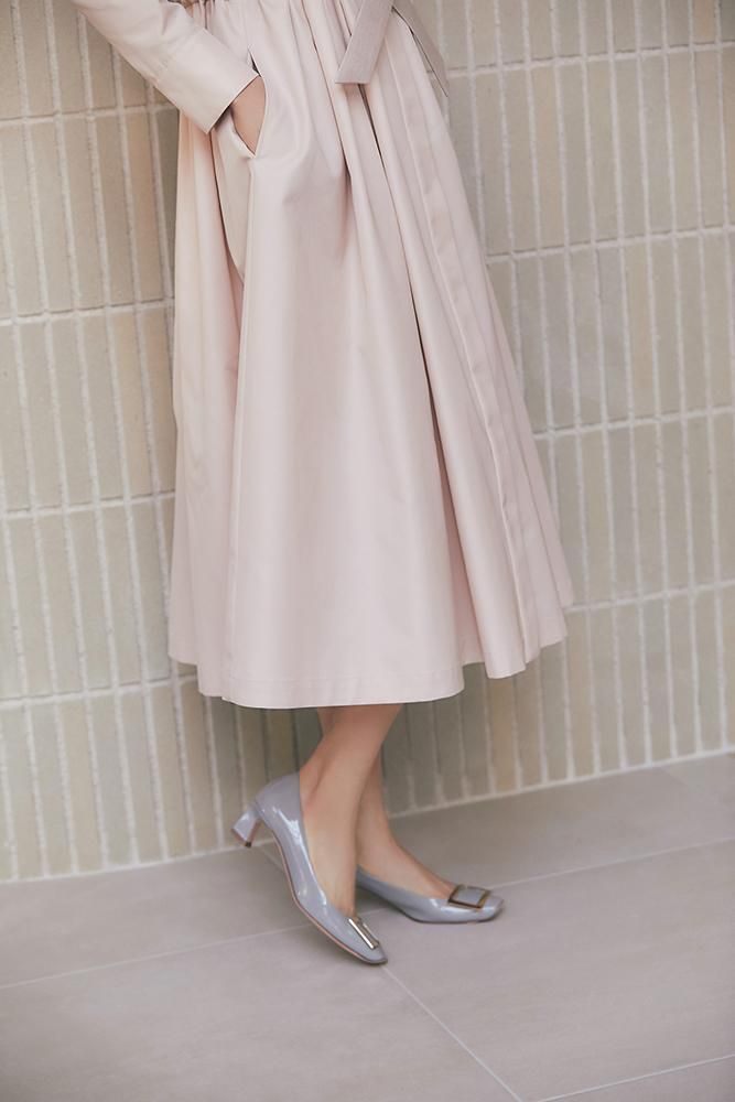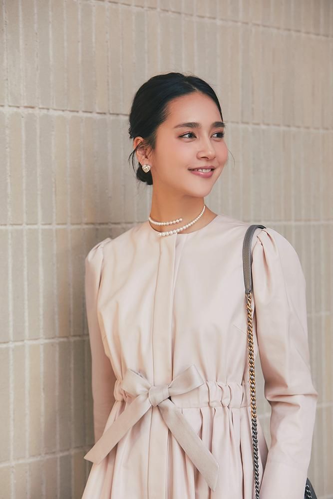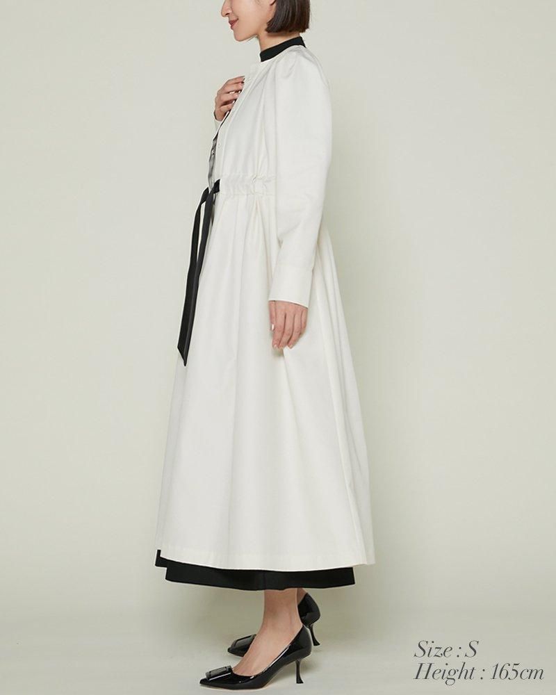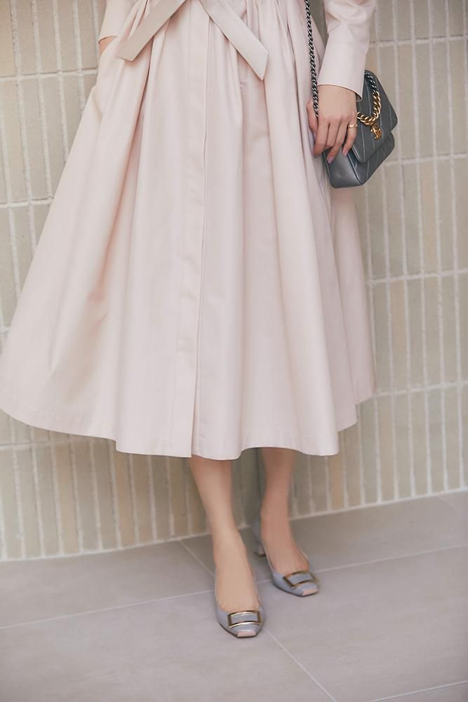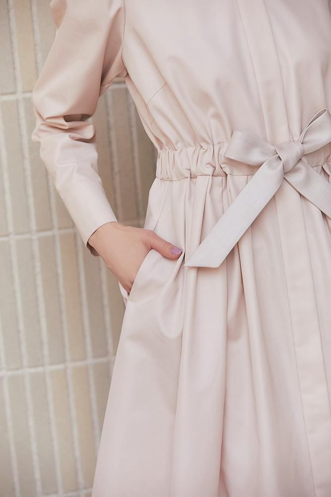 芯を入れハリをもたせたベルトは、ウエストをしっかりとマークするのでスタイルアップも叶い、結んだときのピンと張るリボンのシルエットもポイントです。