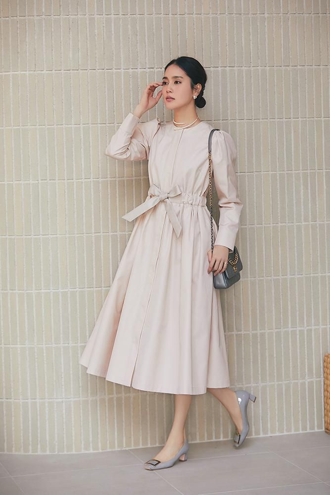 ウエストは幅広のベルトで調整でき、きゅっと締めるとフィットフレアに、ベルトを緩めストレートラインを活かした着方もトレンド感を楽しめます。