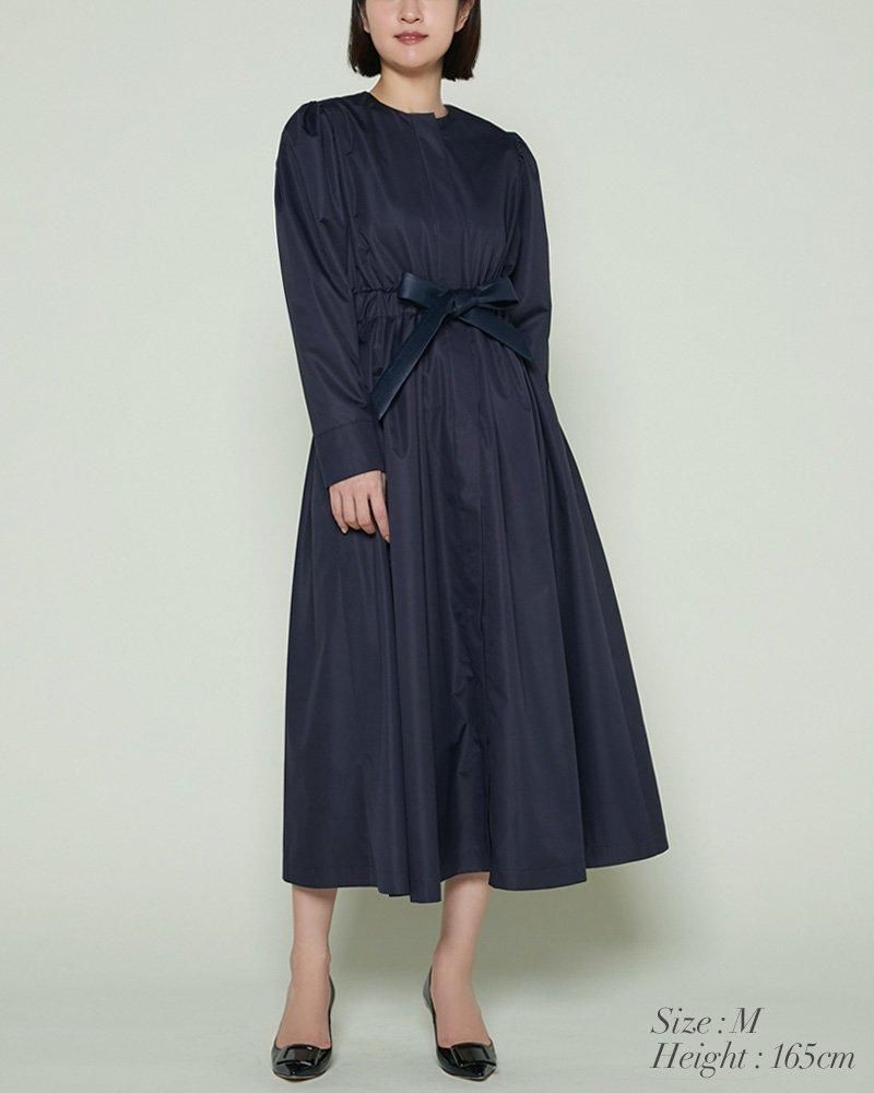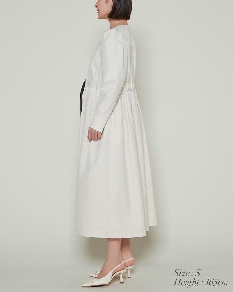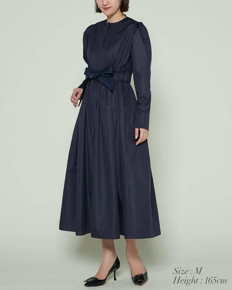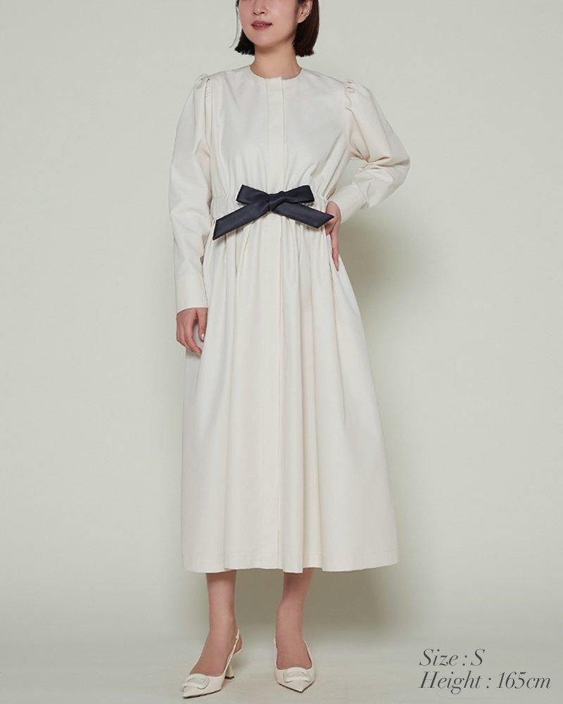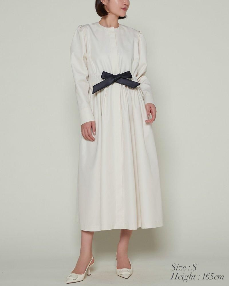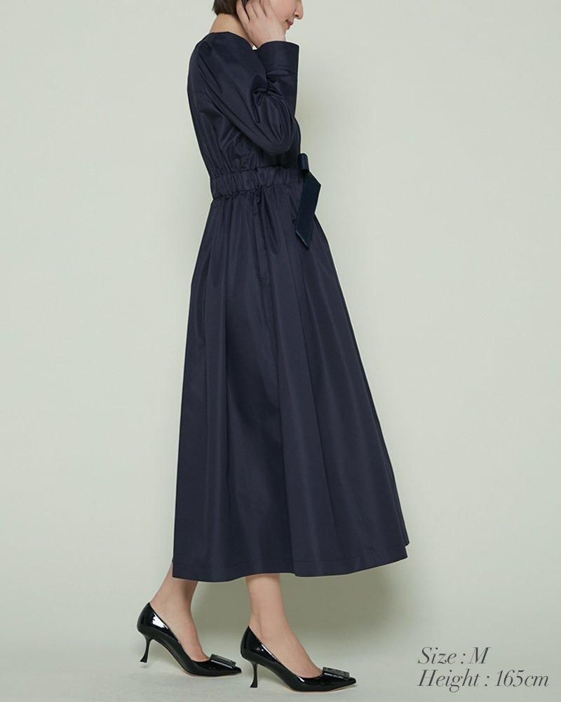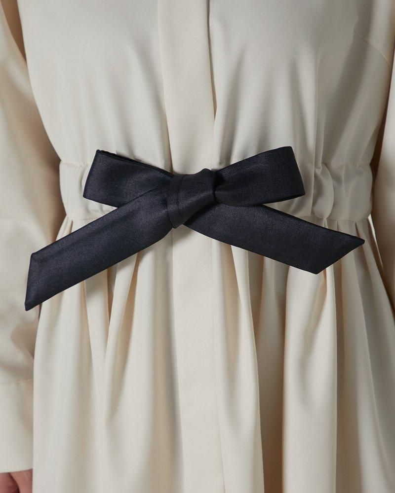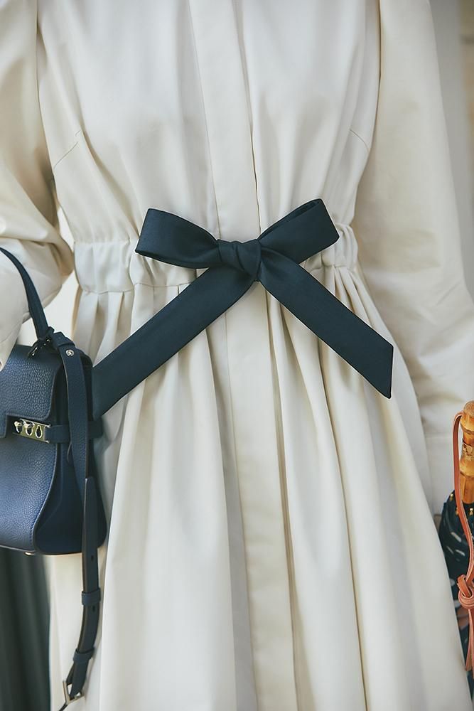 芯を入れハリをもたせたベルトは、ウエストをしっかりとマークするのでスタイルアップも叶い、結んだときのピンと張るリボンのシルエットもポイントです。