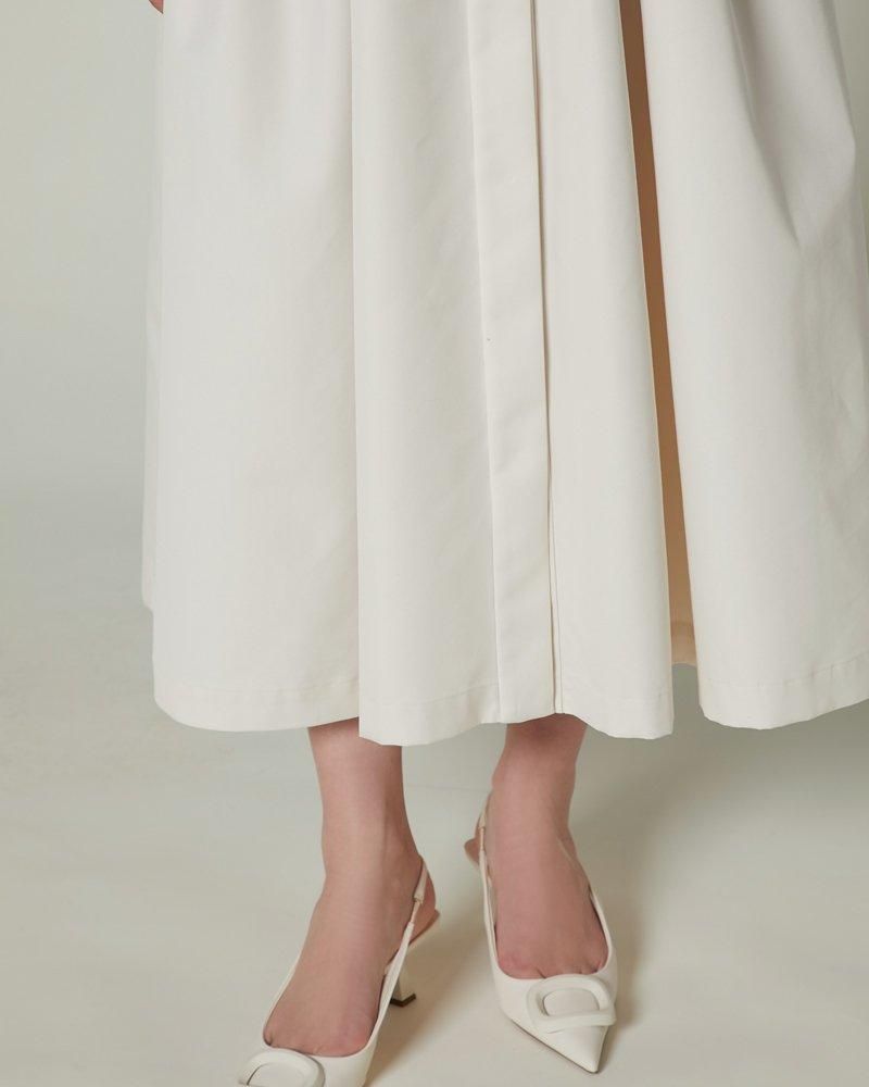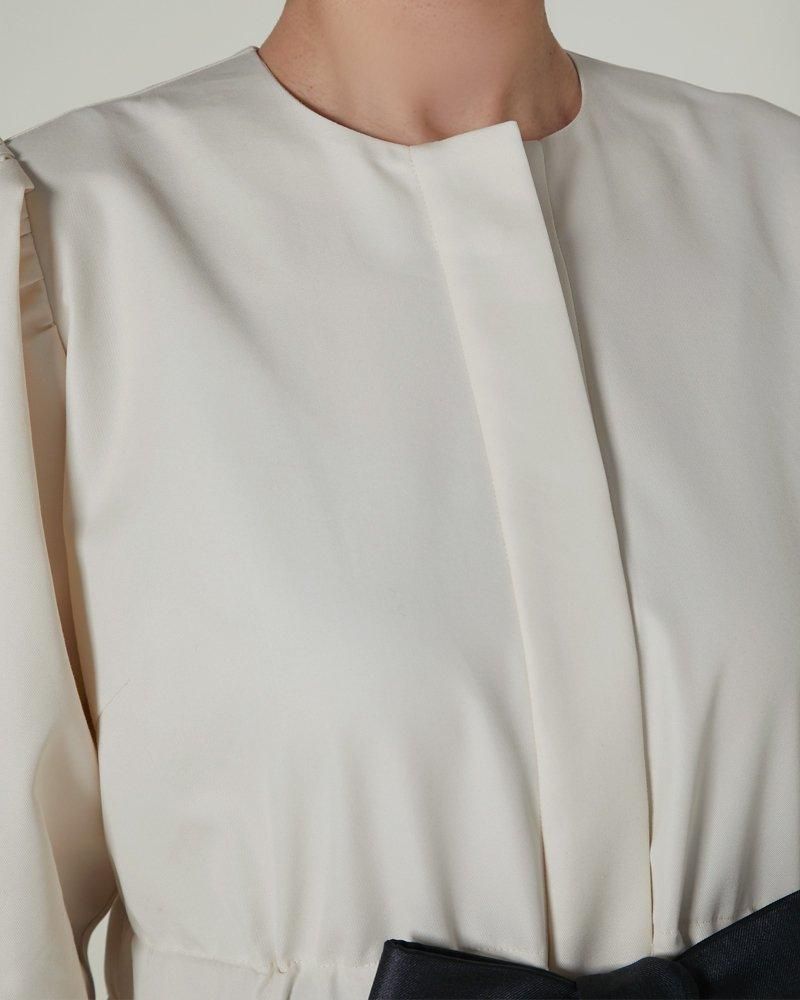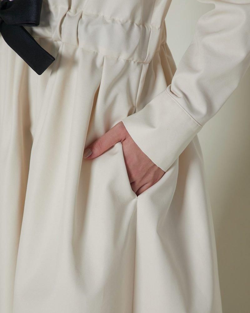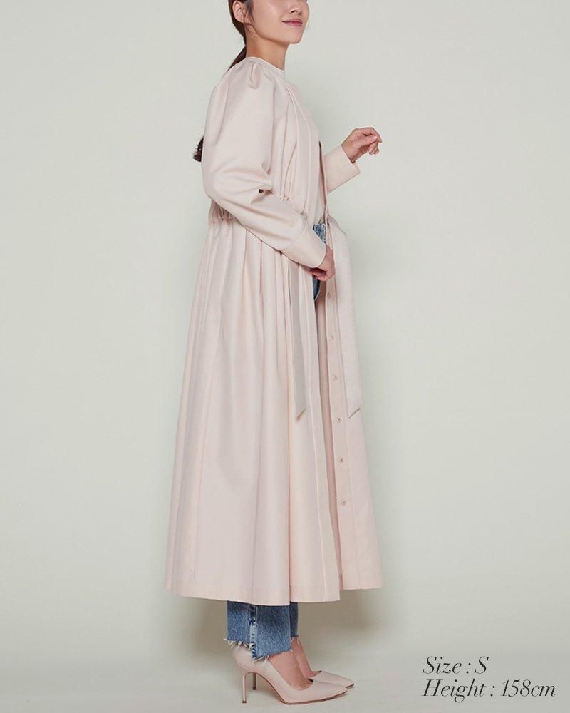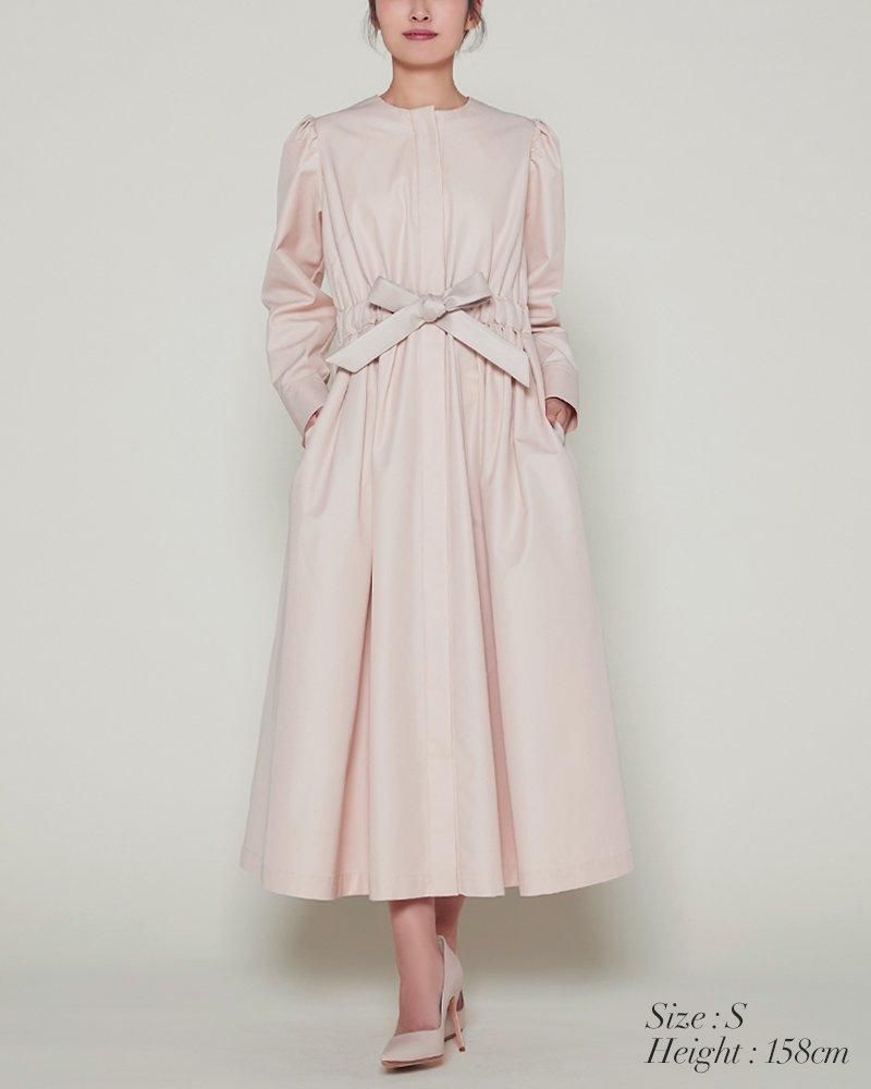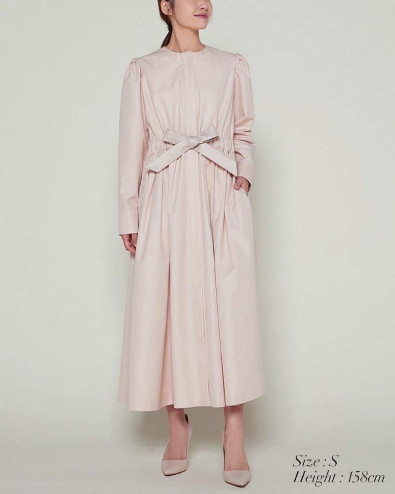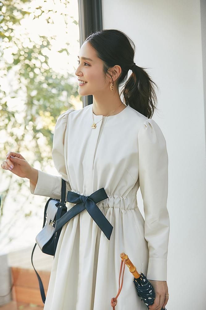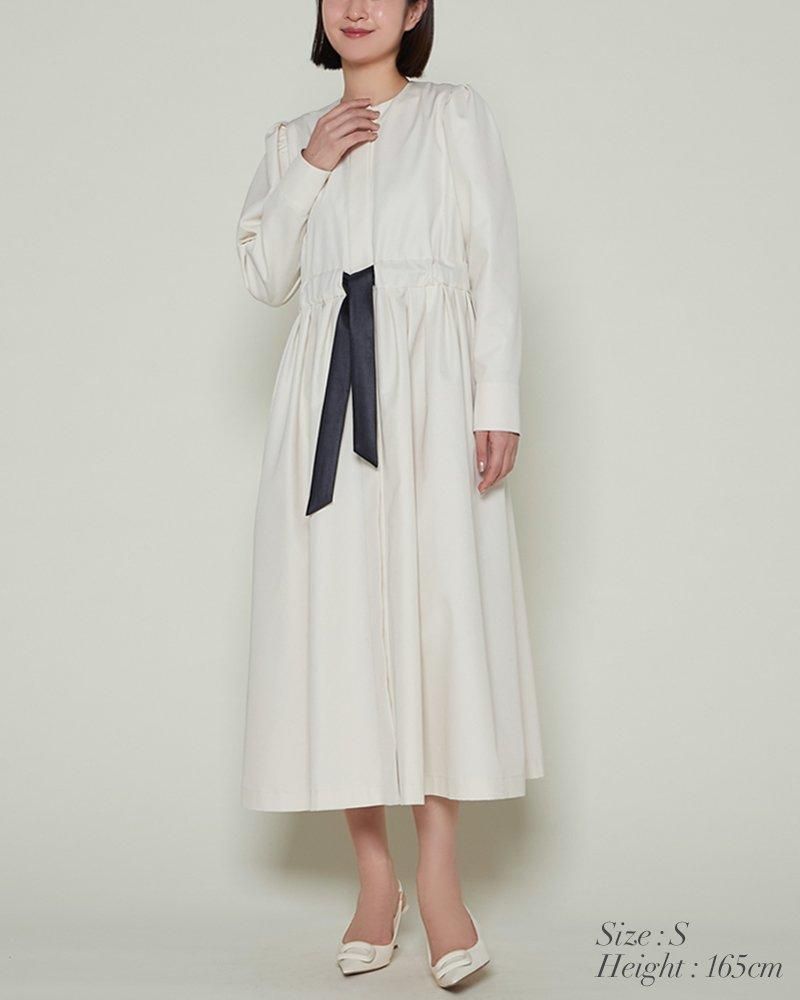 芯を入れハリをもたせたベルトは、ウエストをしっかりとマークするのでスタイルアップも叶い、結んだときのピンと張るリボンのシルエットもポイントです。