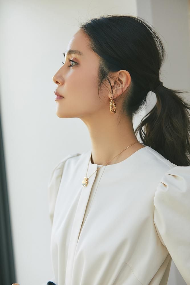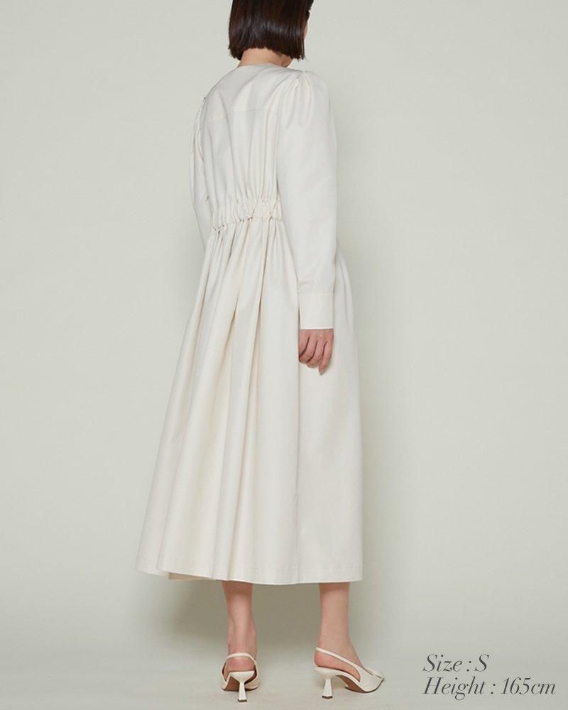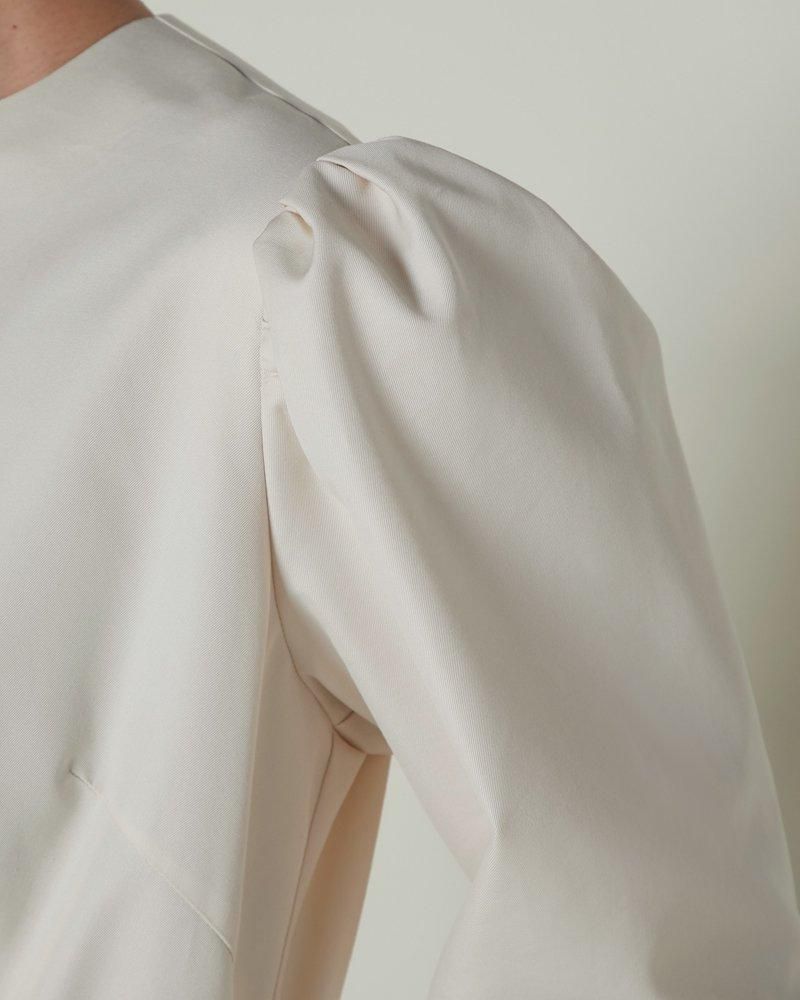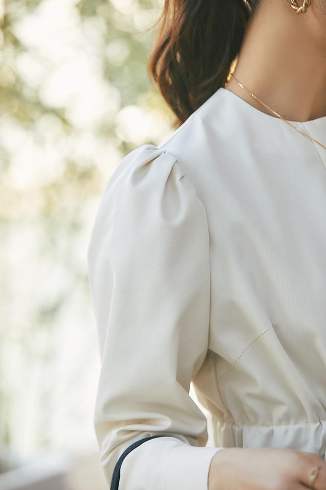 ノーカラーで装飾レスの飽きのこないシンプルさと、ふんわりした肩のシルエットやたっぷりとしたスカートで一枚で様になる華やかさを兼備しています。