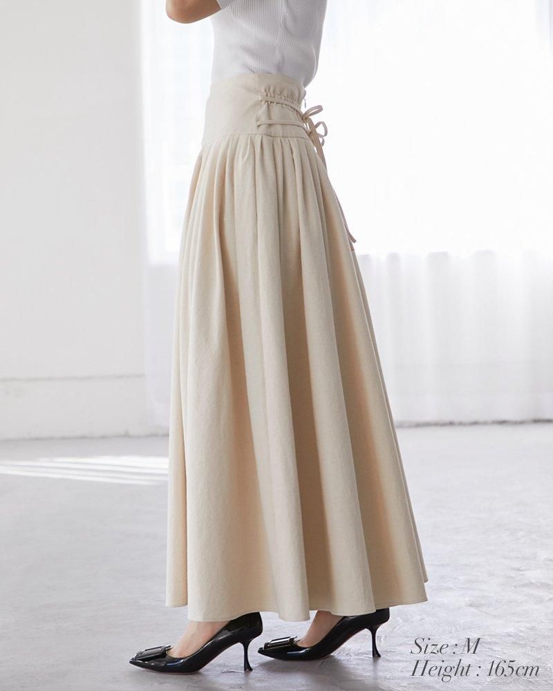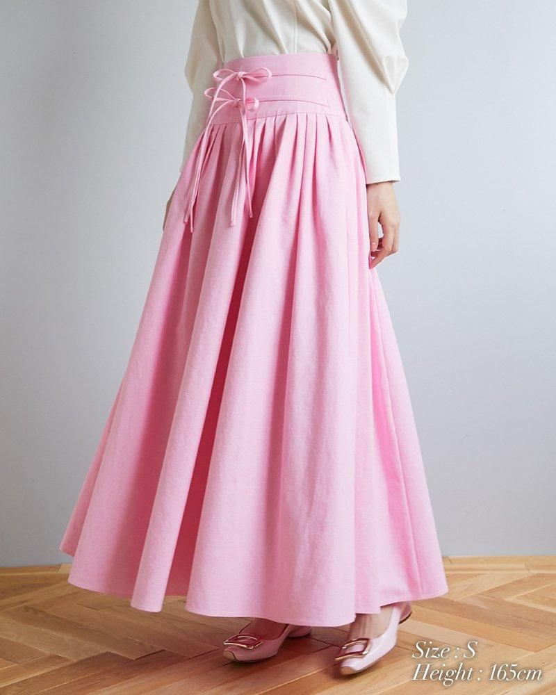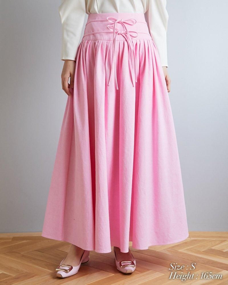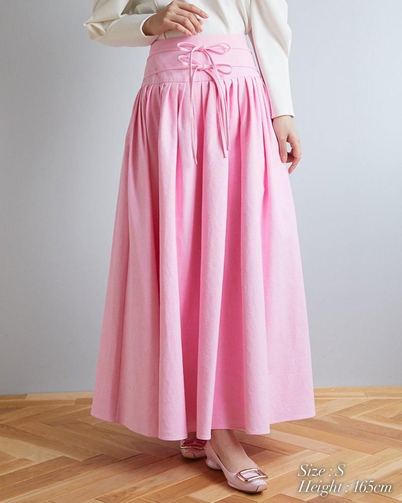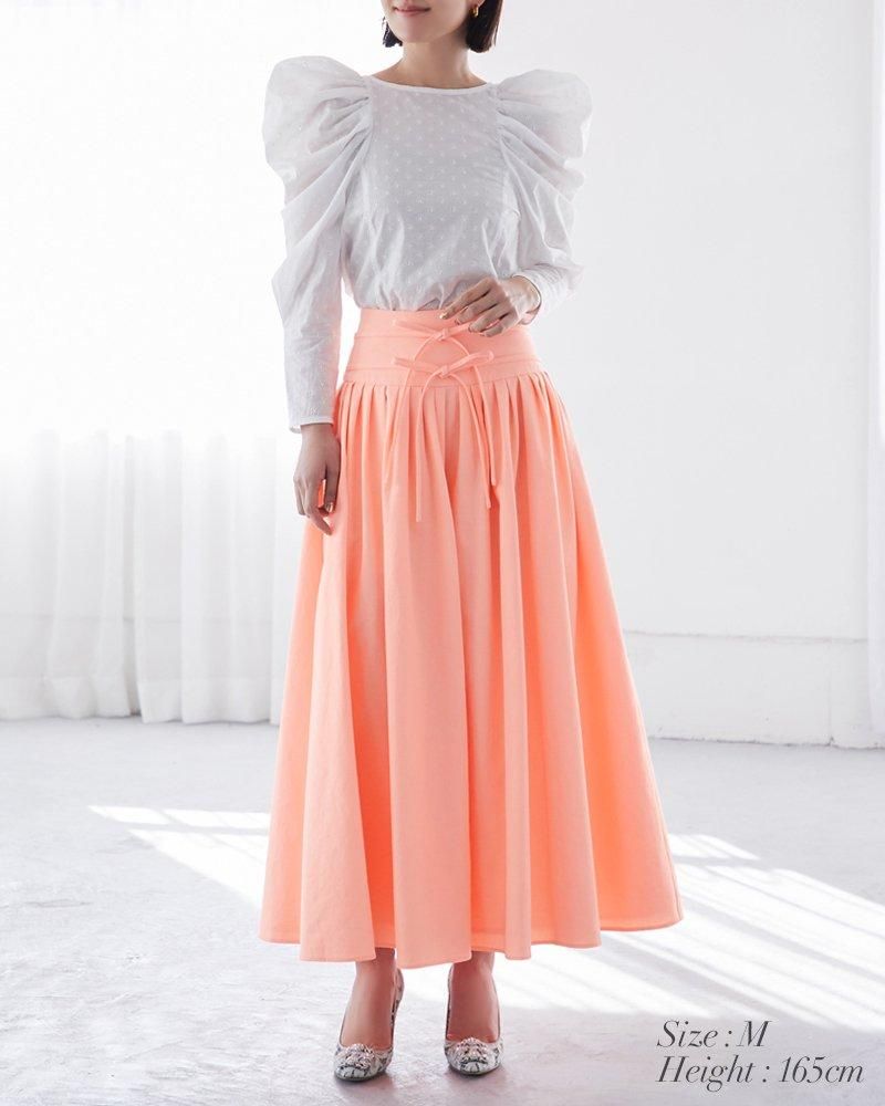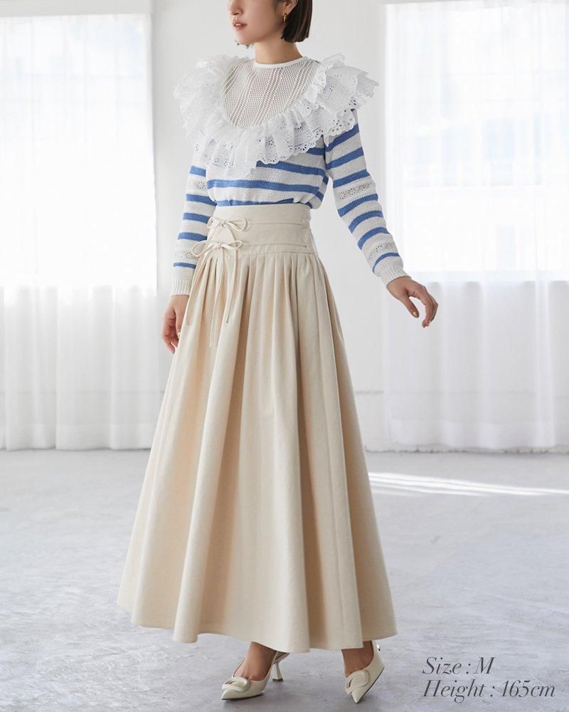 ウエスト部分のリボンは前後のどちらでも結べてコーディネートに合わせて印象を変えていただけます。