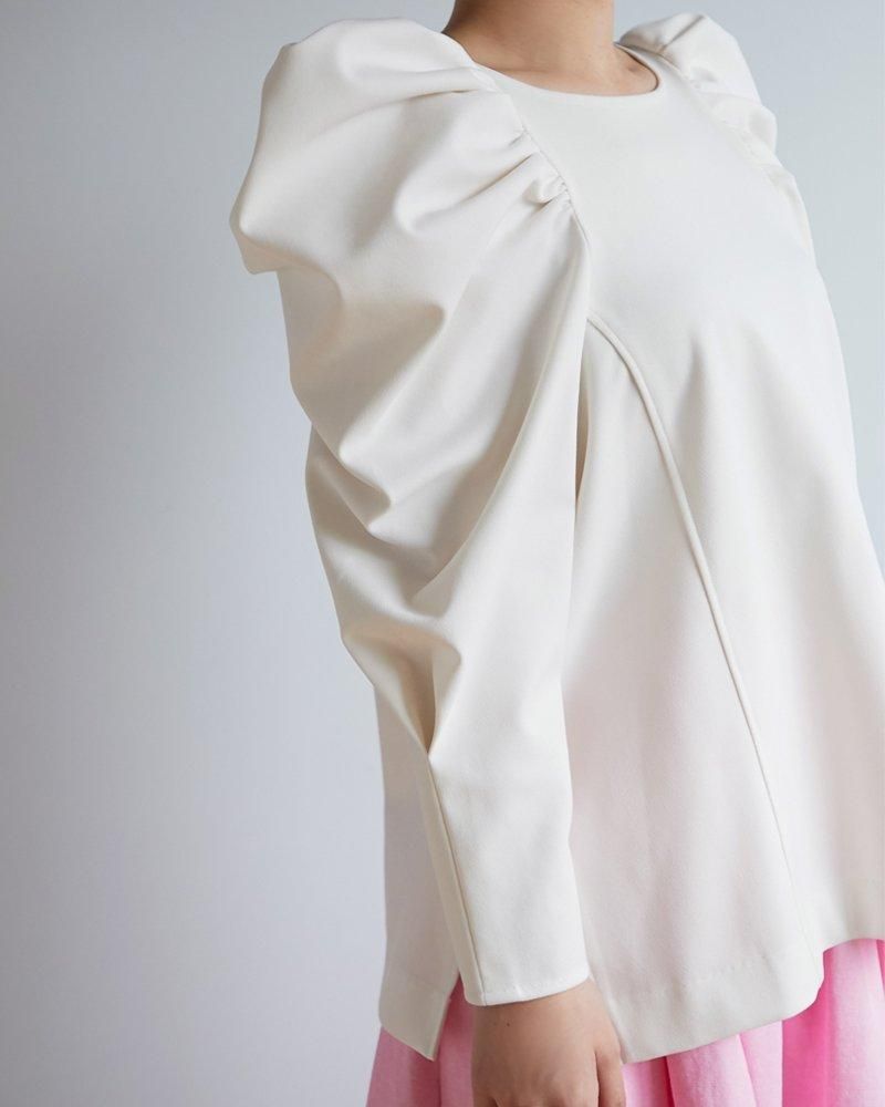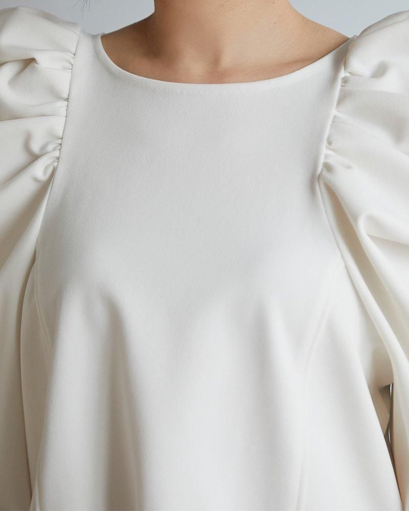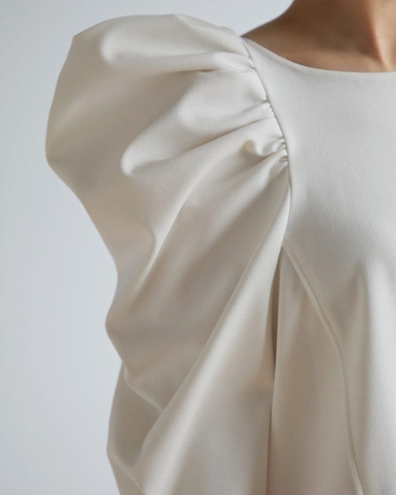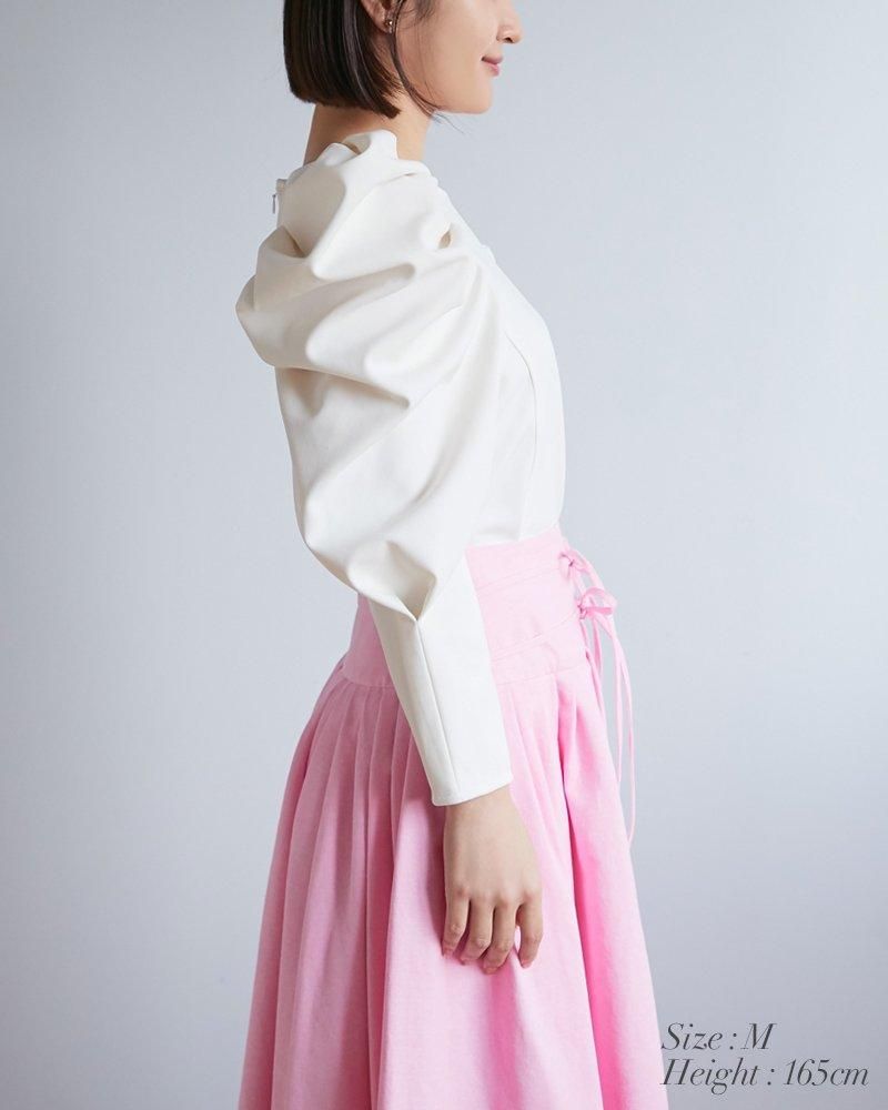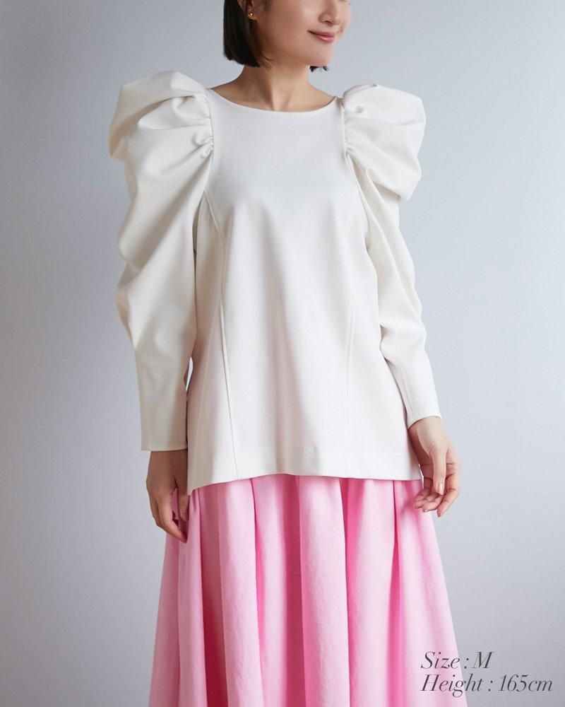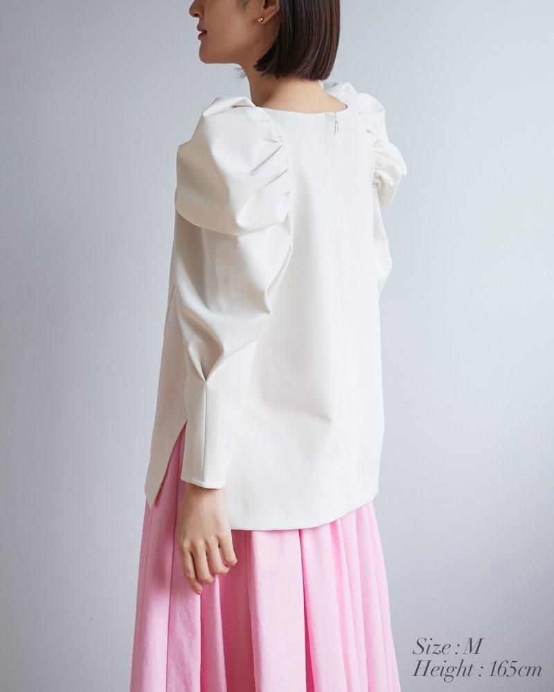 ショルダーラインを内側に入れ、ギャザーを寄せることで肩先が立ち、甘さの中にモード感も漂います。