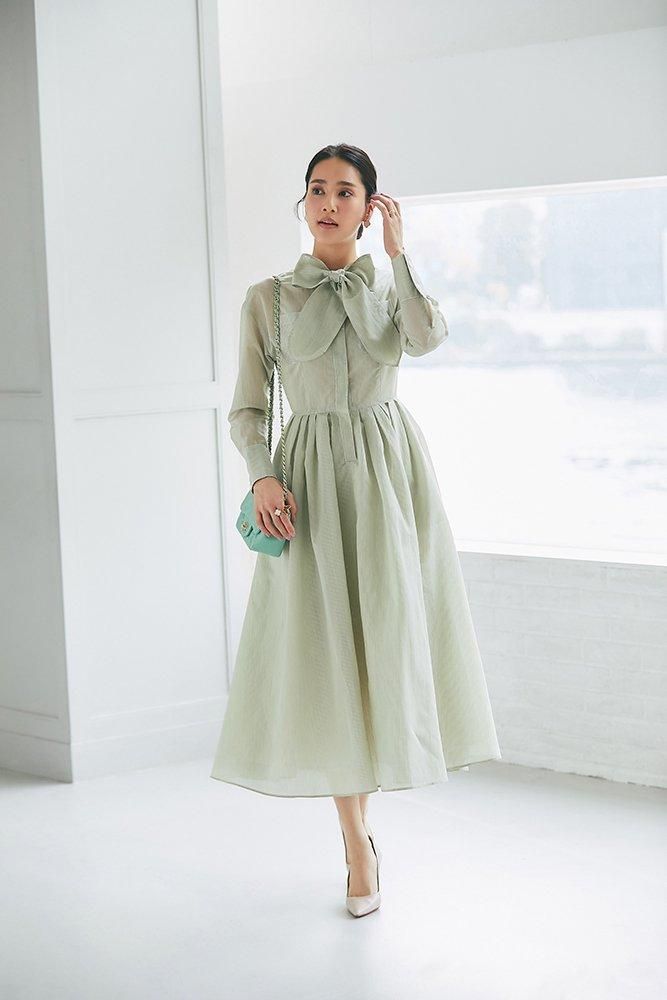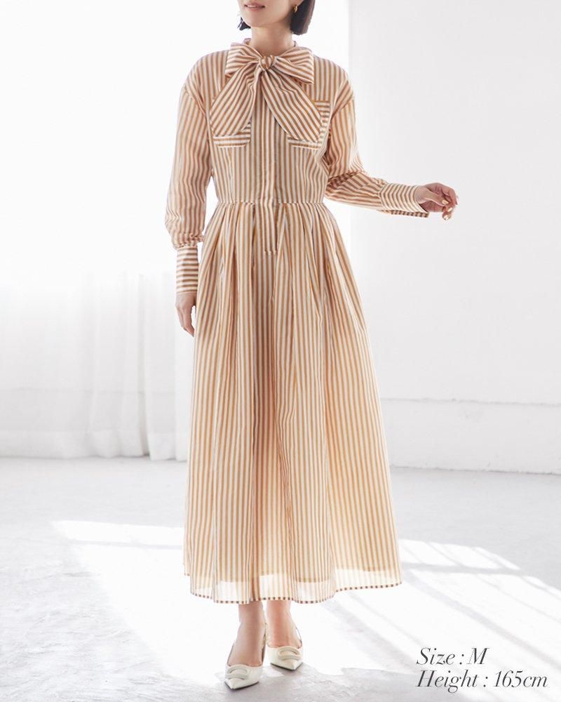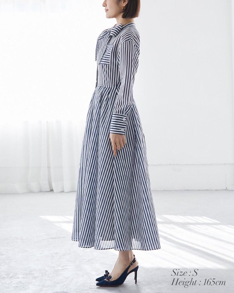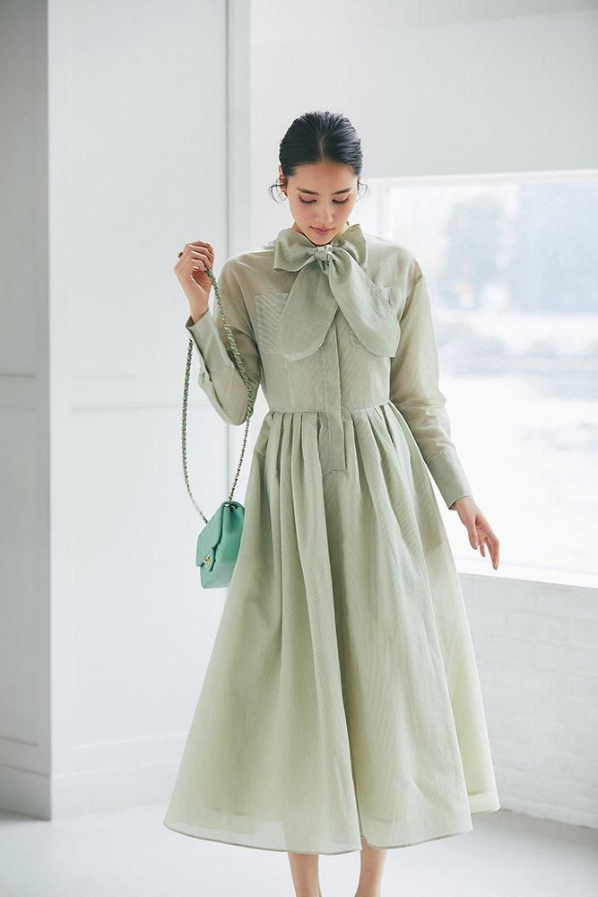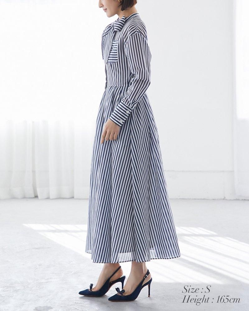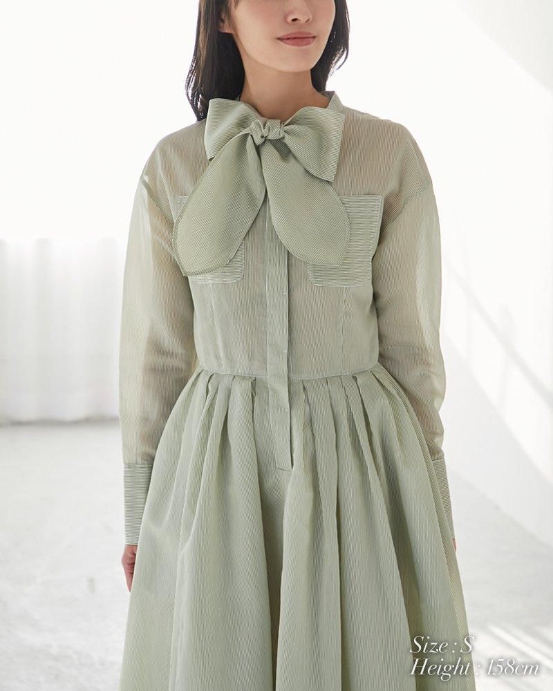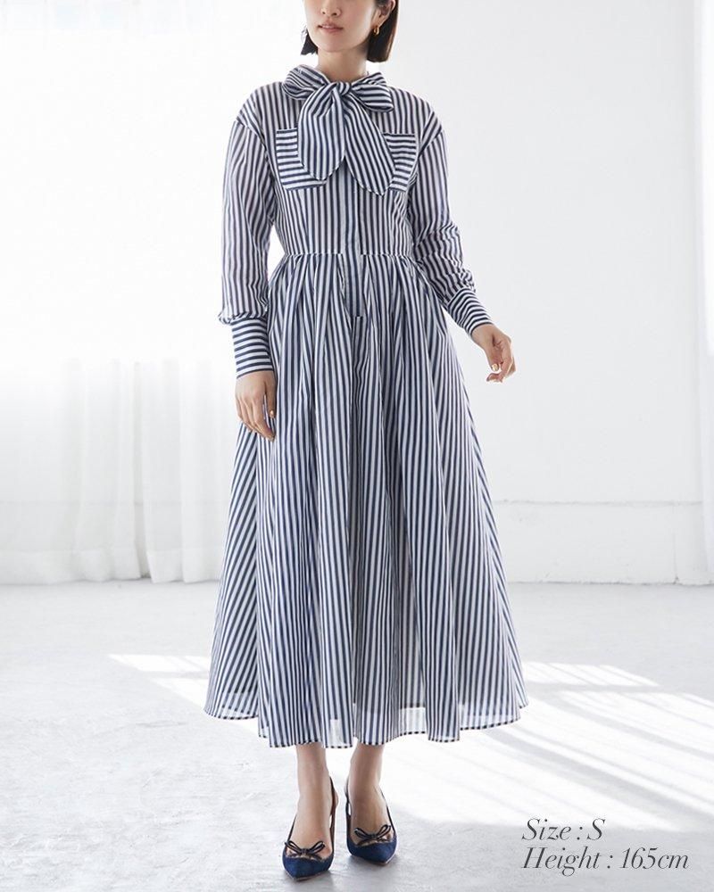 シアーな透け感とストライプで知的なエレガンスが香るボウタイワンピース。