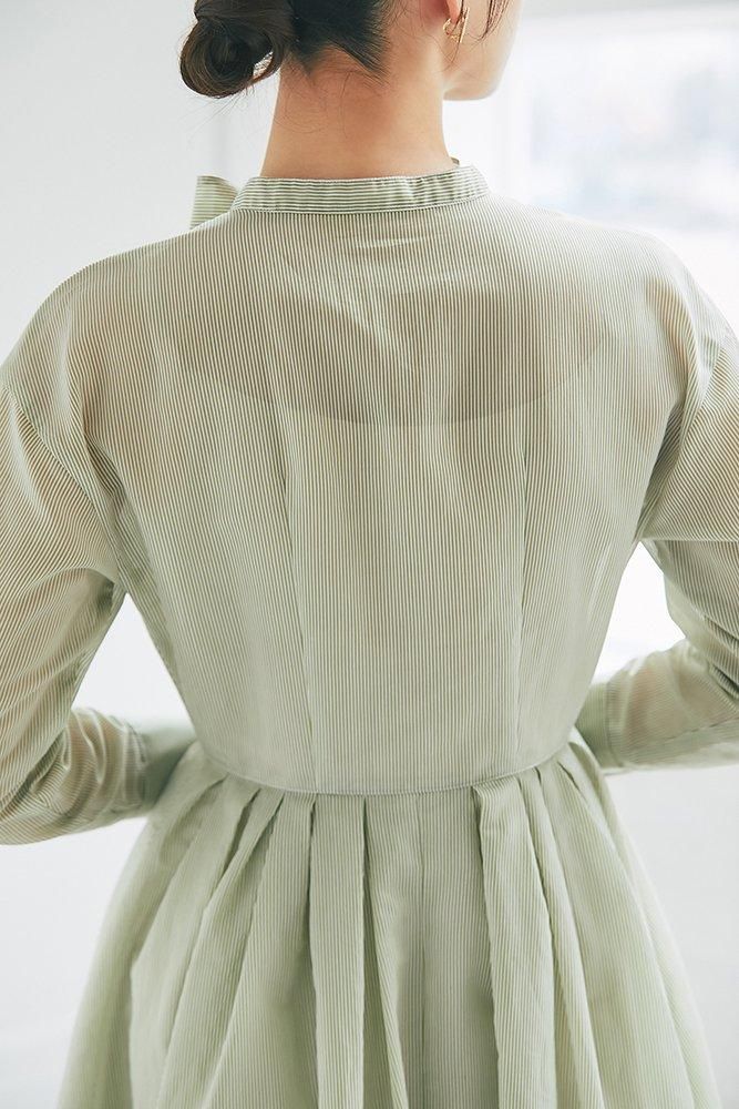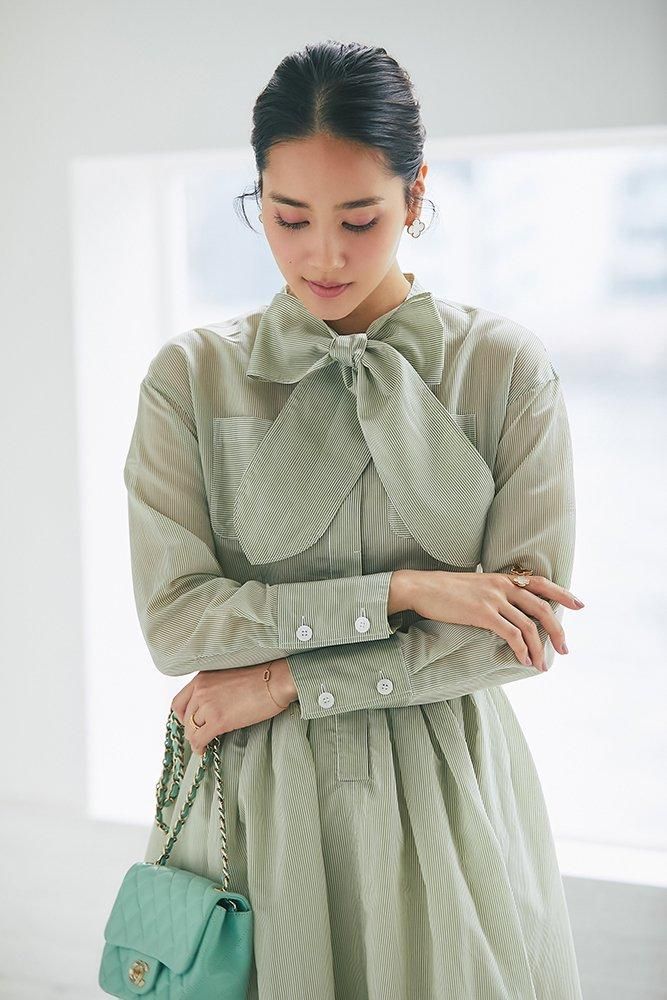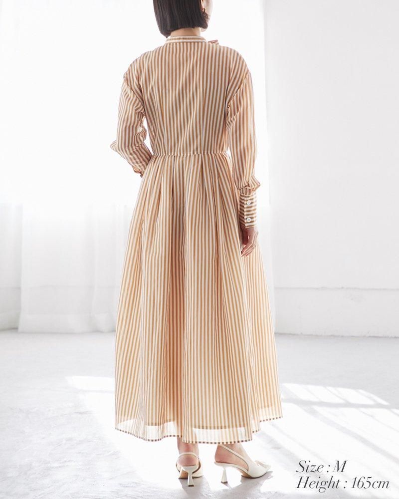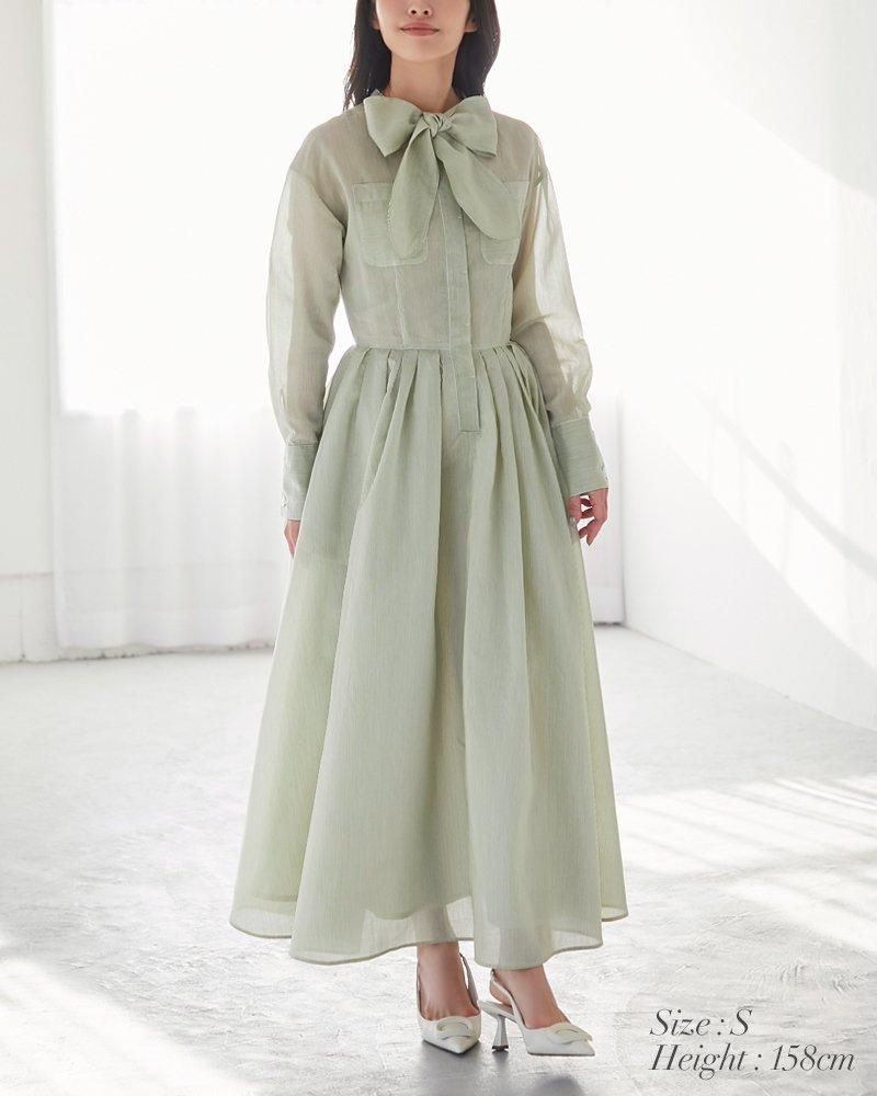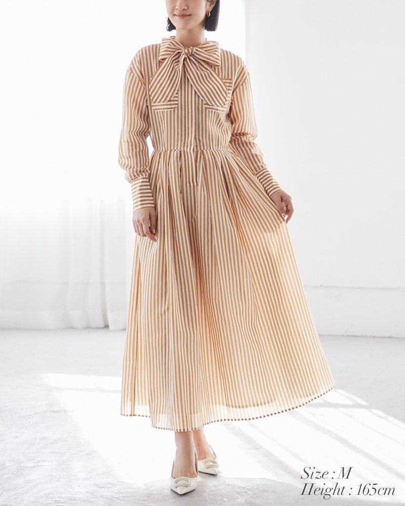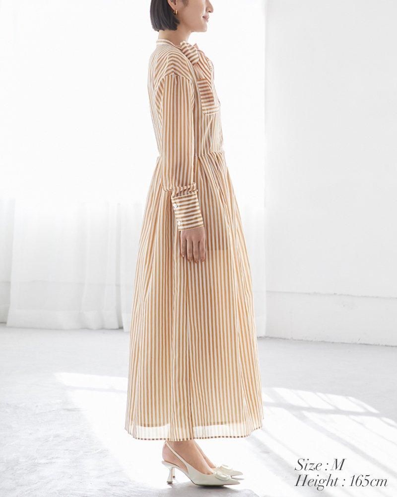 シアーな透け感とストライプで知的なエレガンスが香るボウタイワンピース。