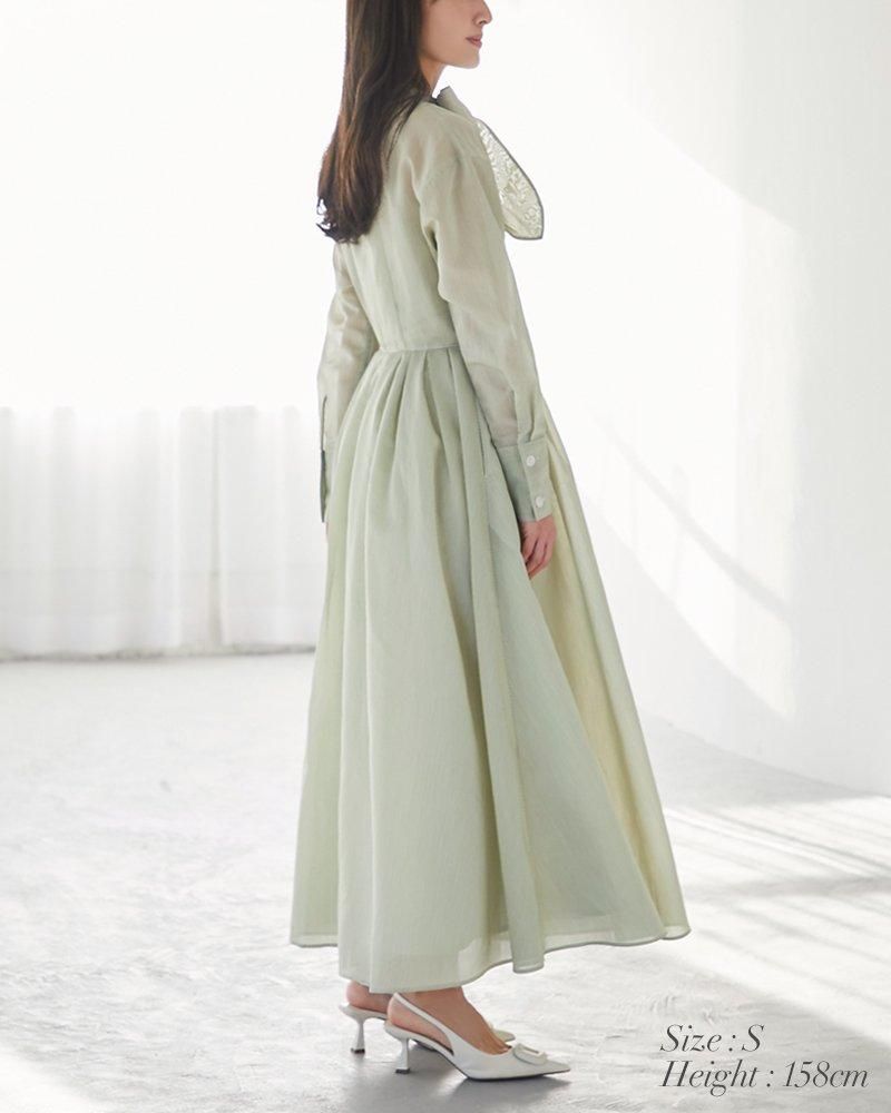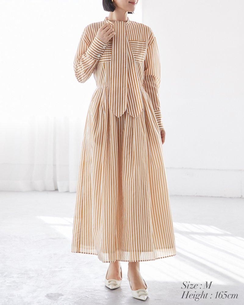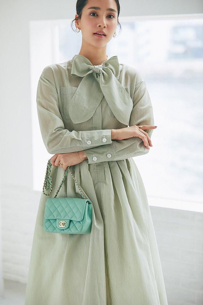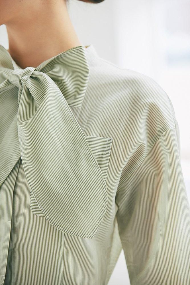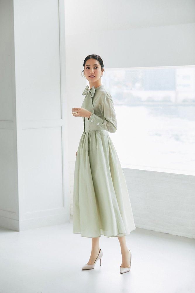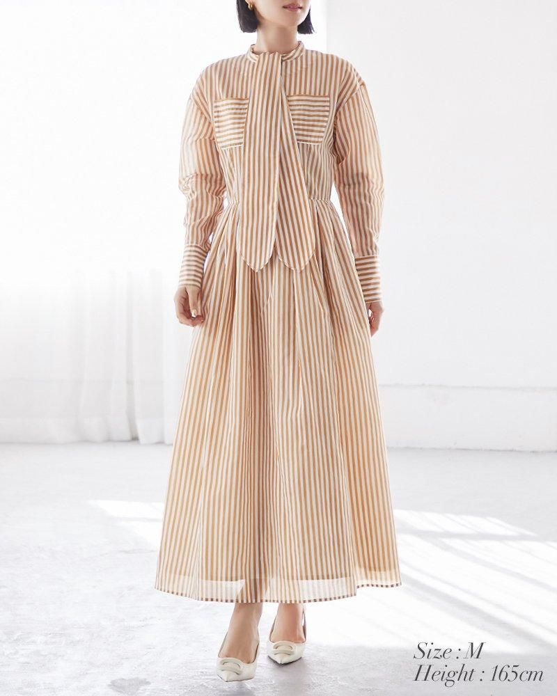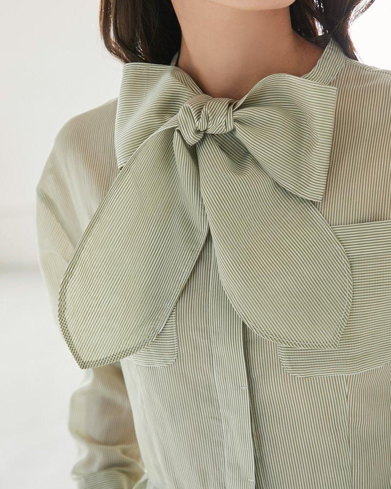 シアーな透け感とストライプで知的なエレガンスが香るボウタイワンピース。
