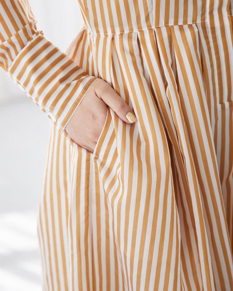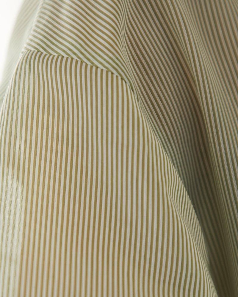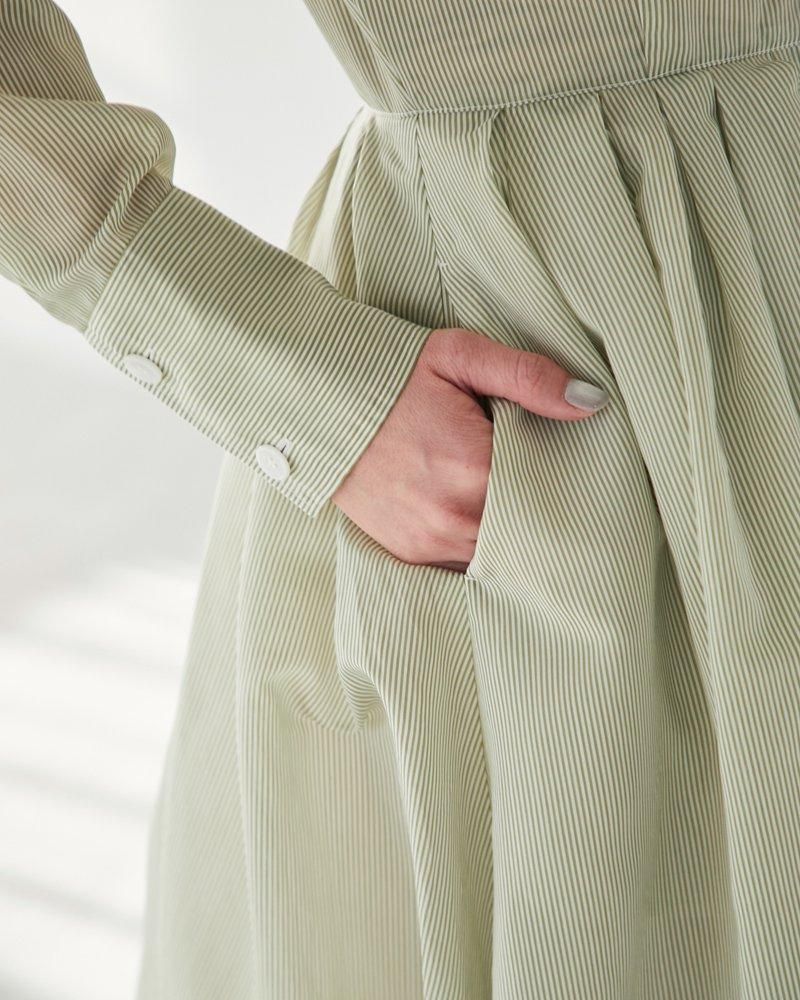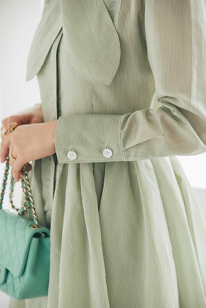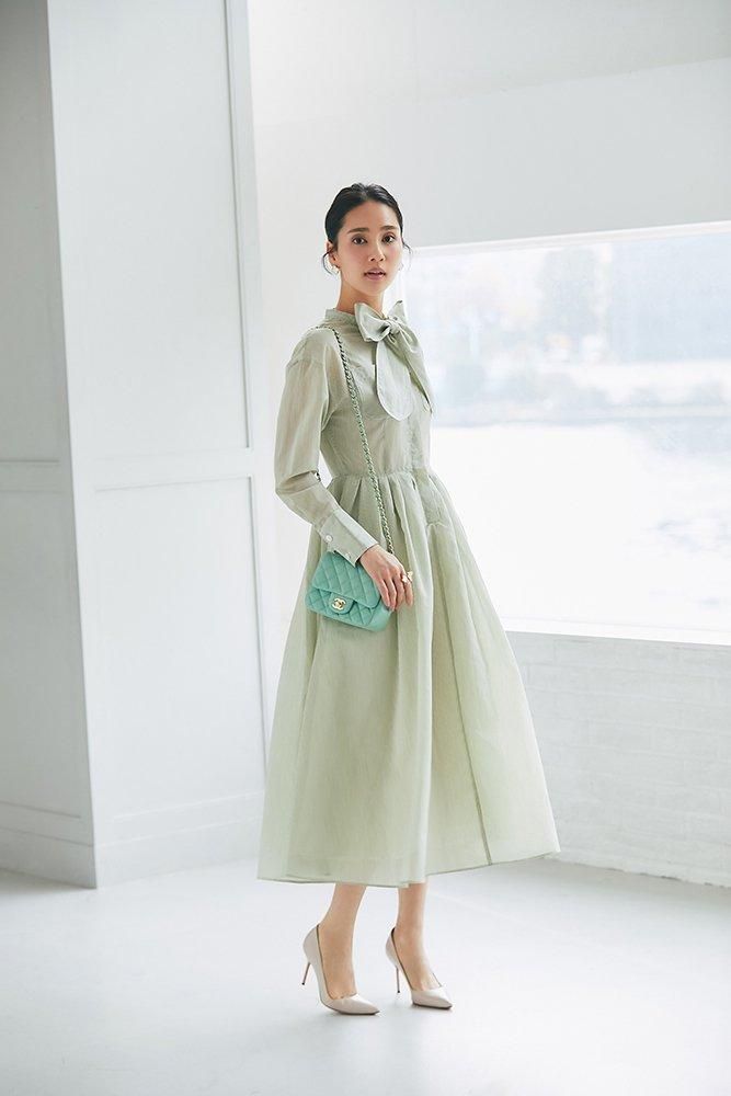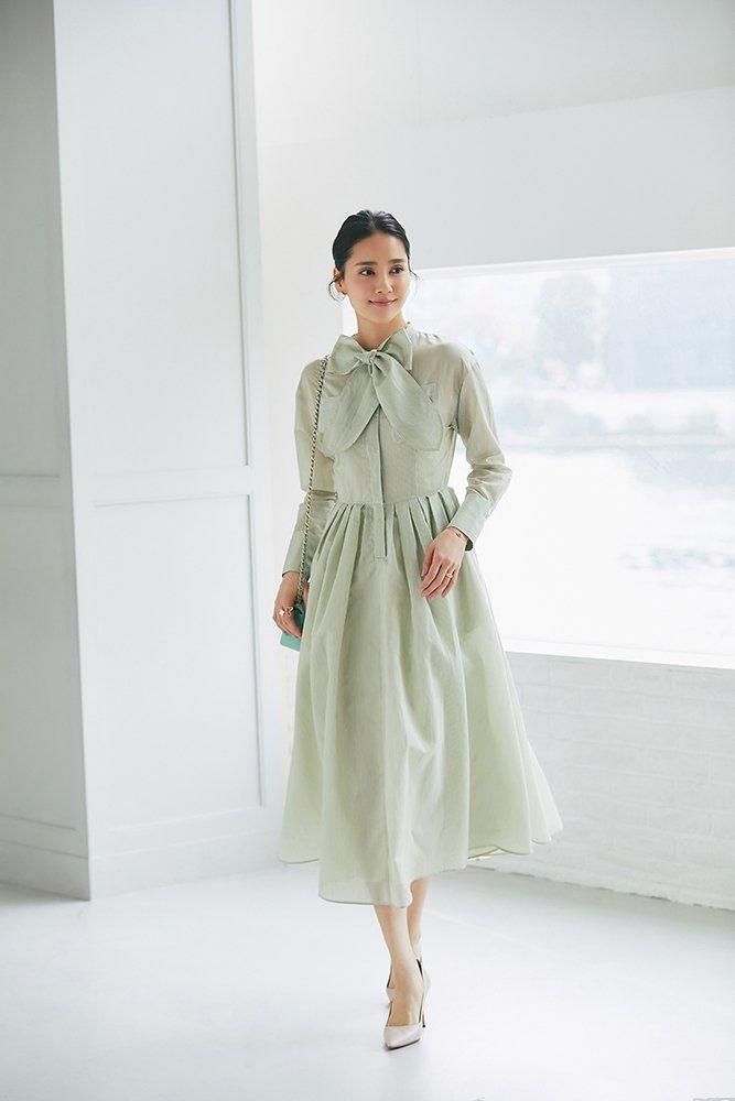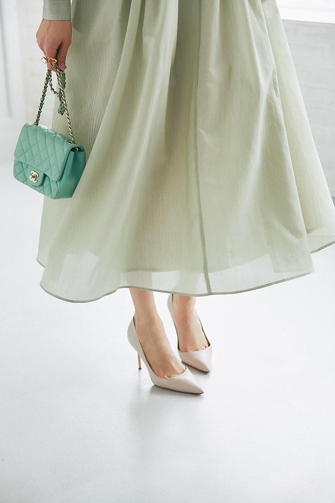 シアーな透け感とストライプで知的なエレガンスが香るボウタイワンピース。