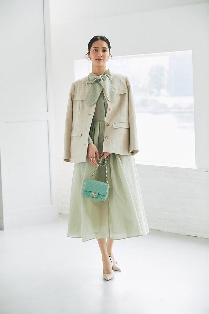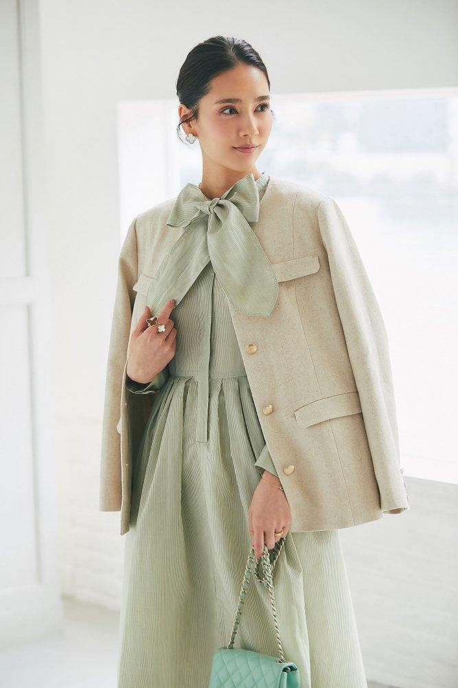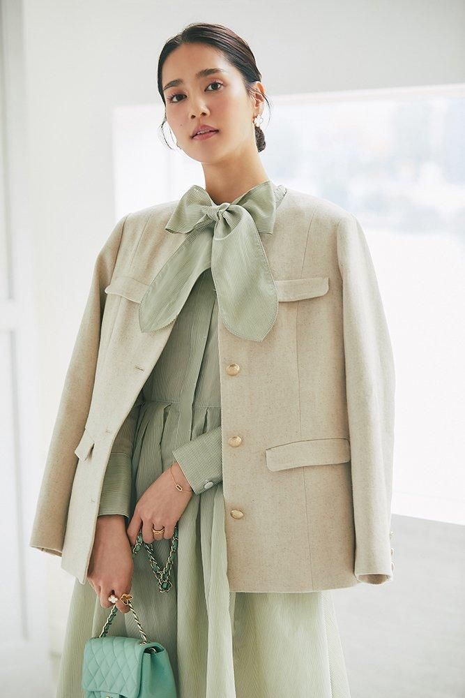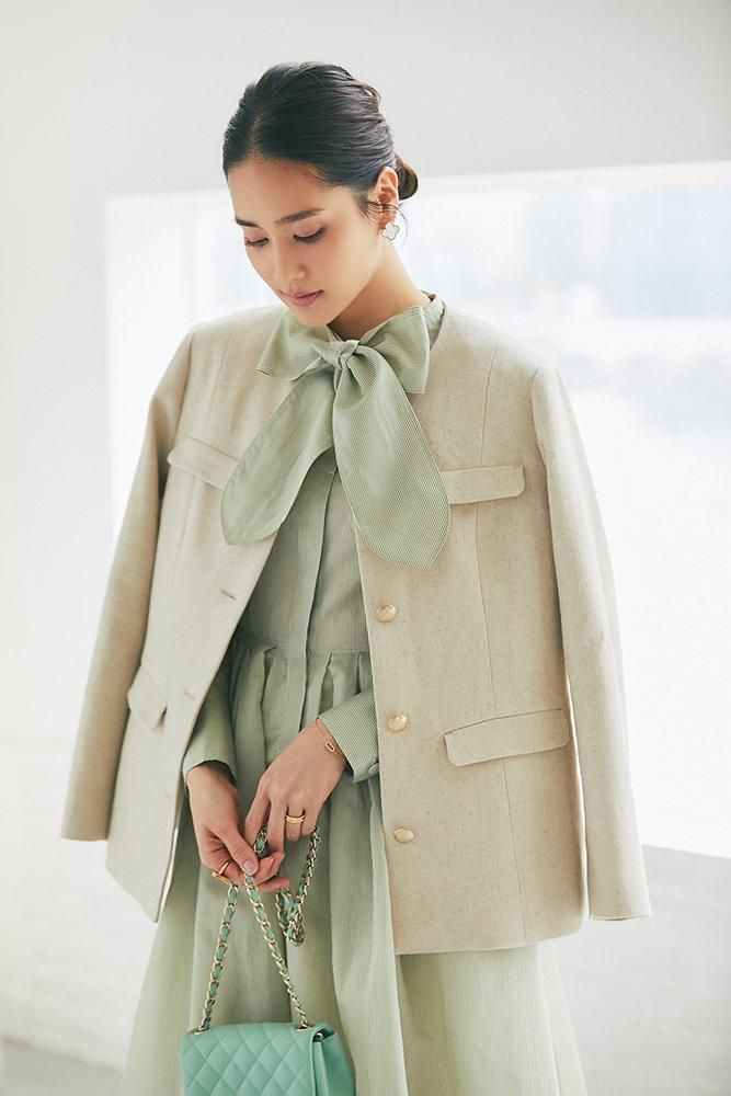 ジャケットやニット、スウェットと合わせてリボンを覗かせる着こなしもオススメです。