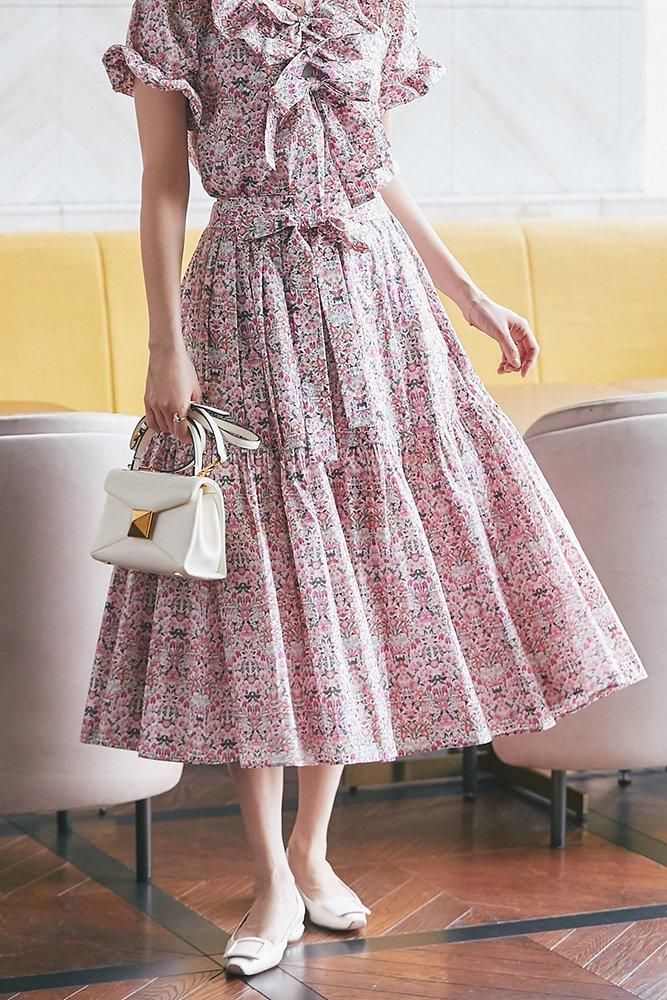 華やかなプリント柄をさらに引き立てるデザイン性を加えたスカート。