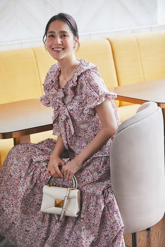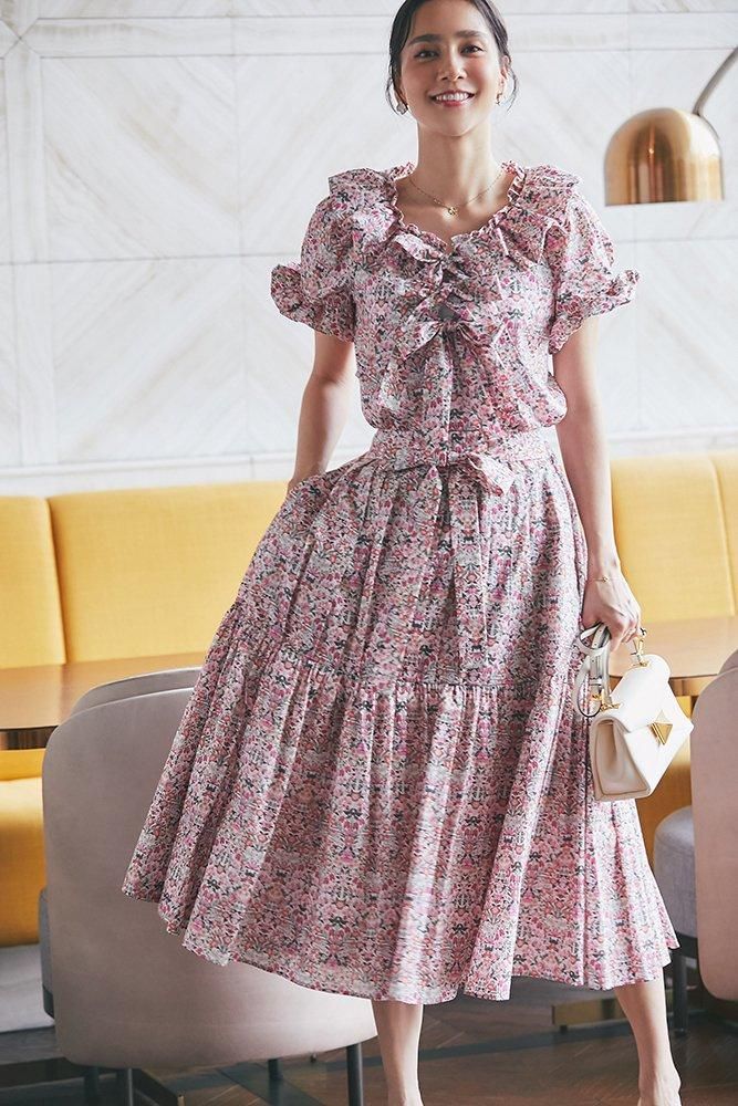 同生地のブラウスとのセットアップも華やかです。