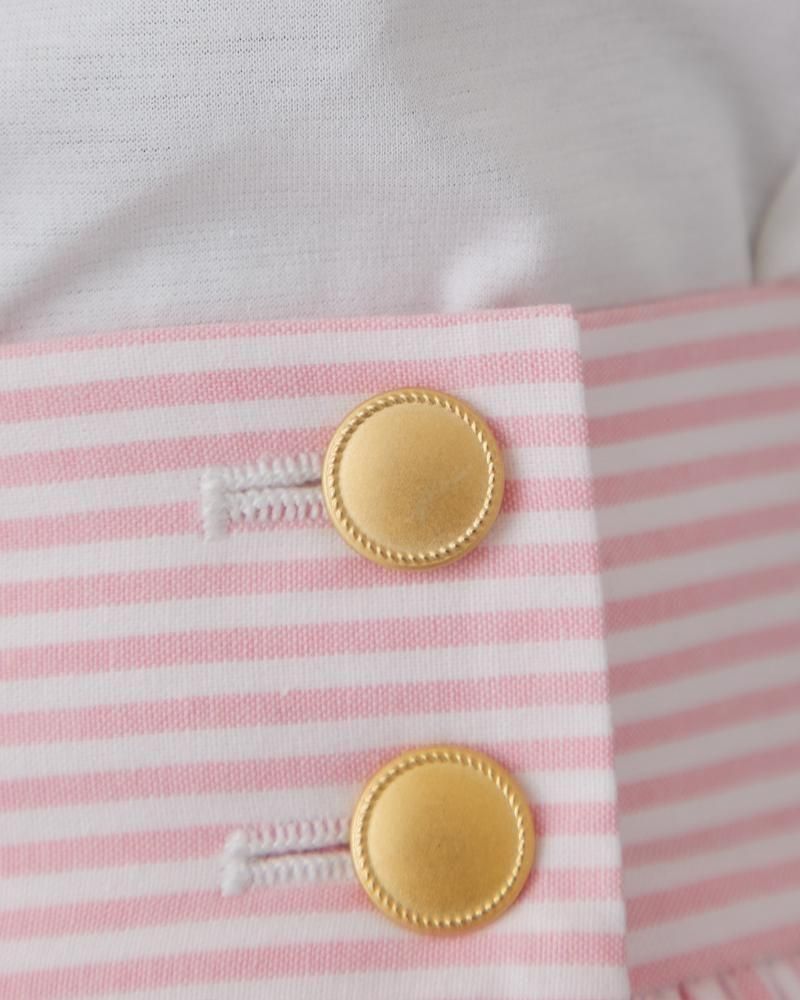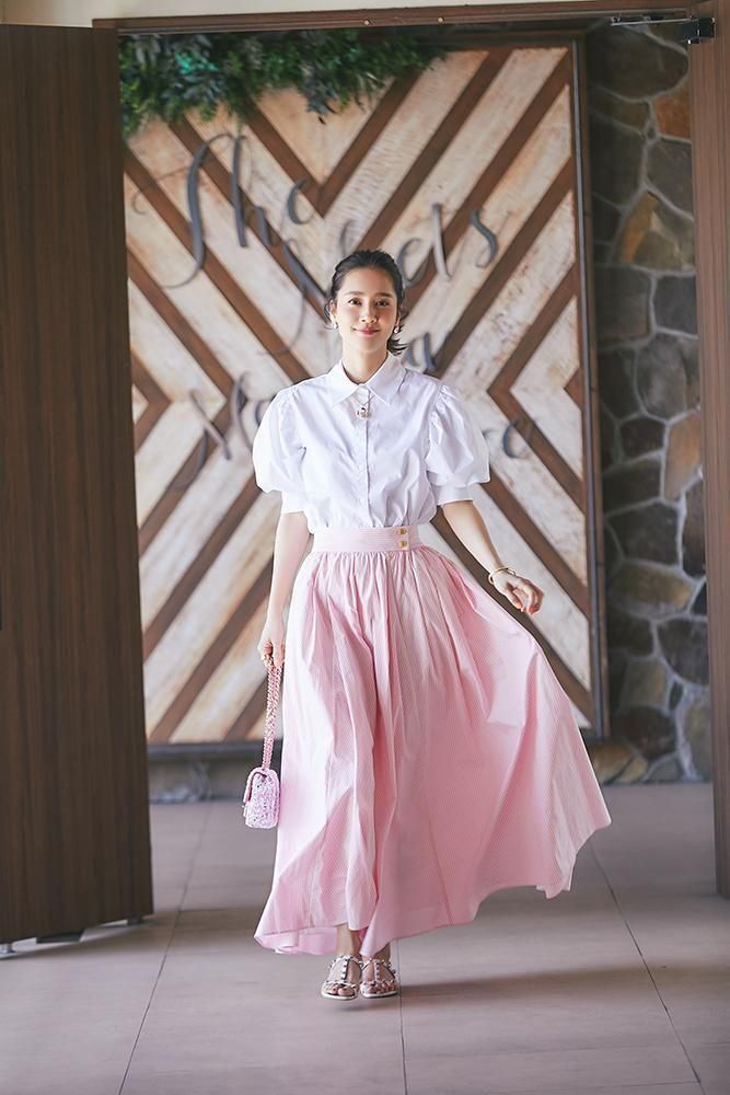 ハイウエストの切り替えデザインで腰回りをすっきり見せてくれ、ゴールドボタンのアクセントが華やかさをプラス。