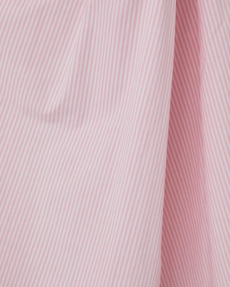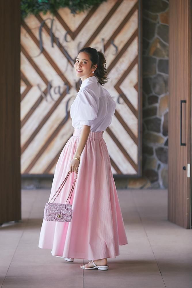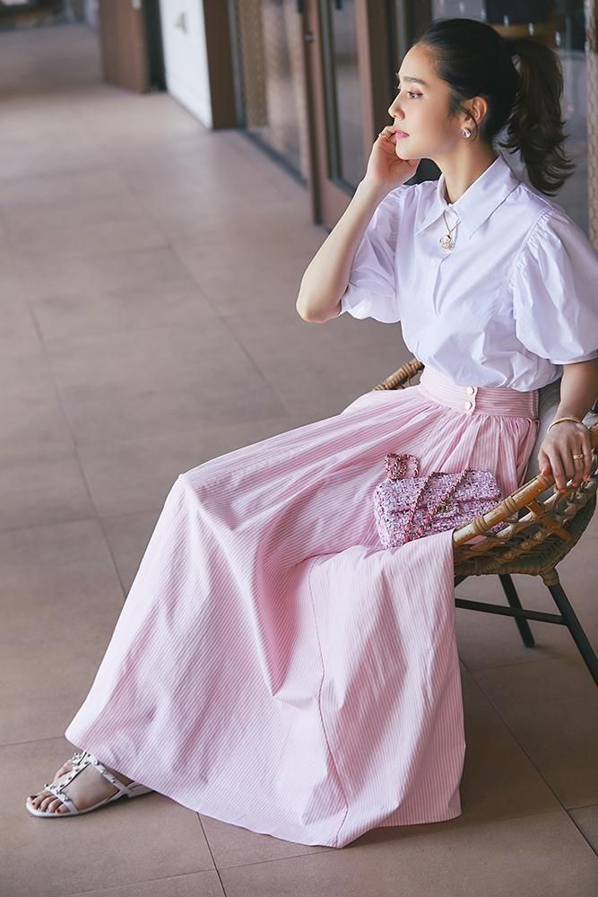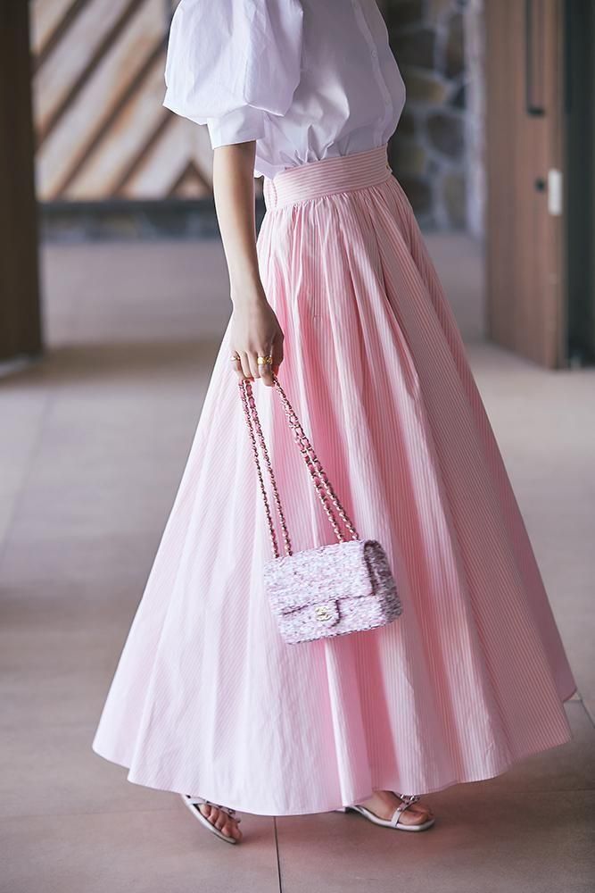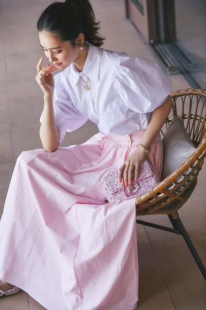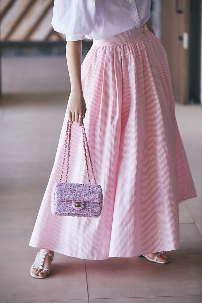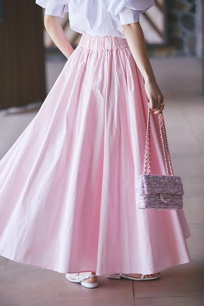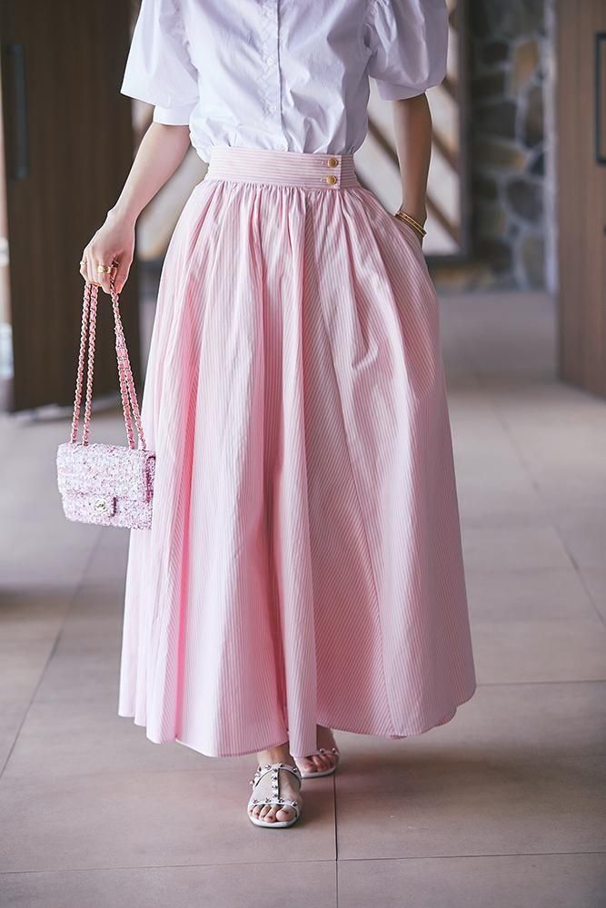 生地を一部バイアス使いすることで、動いた際のストライプの表情が一層美しくなり、単調なストライプスカートには出せないクラス感を演出。