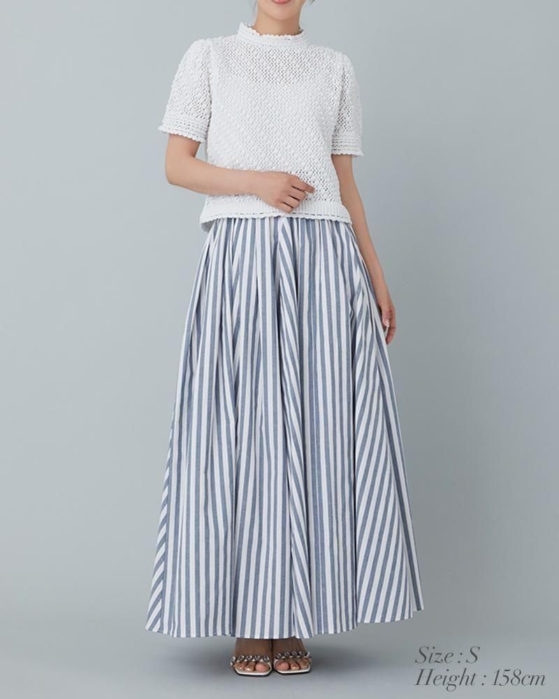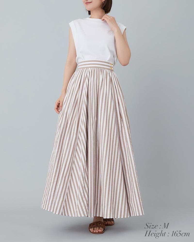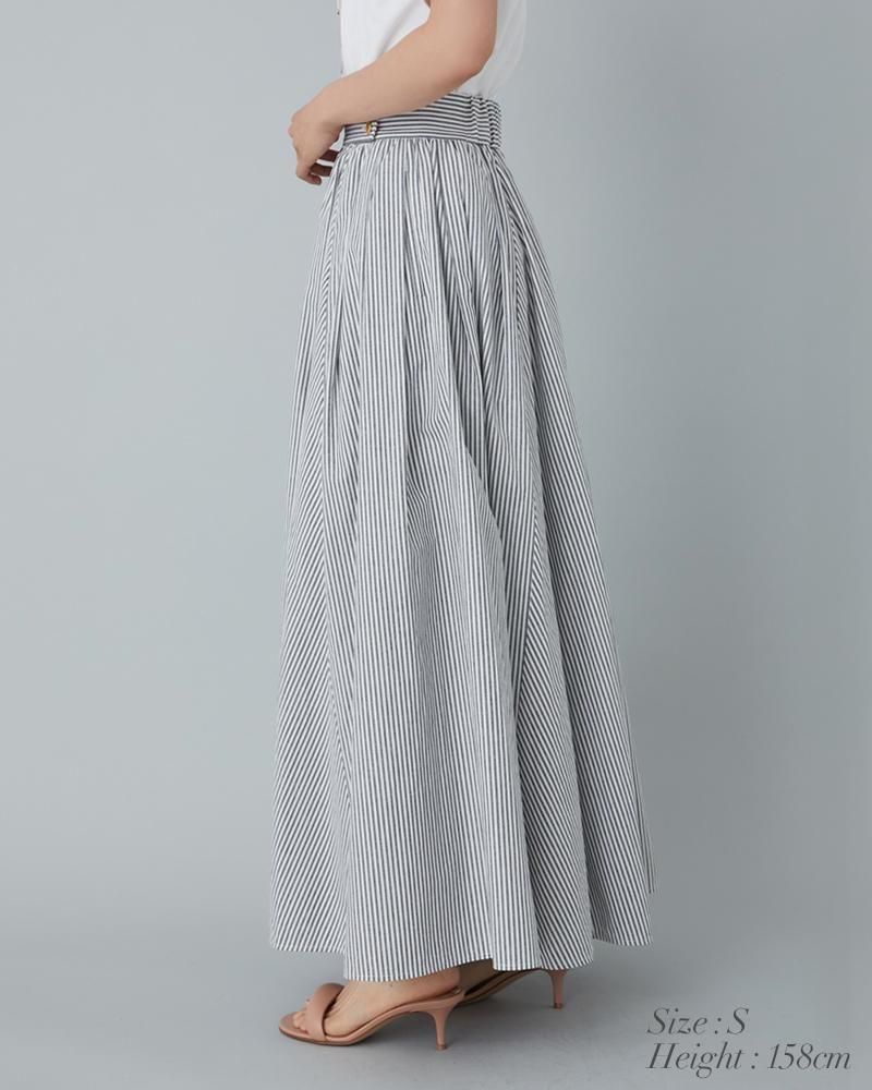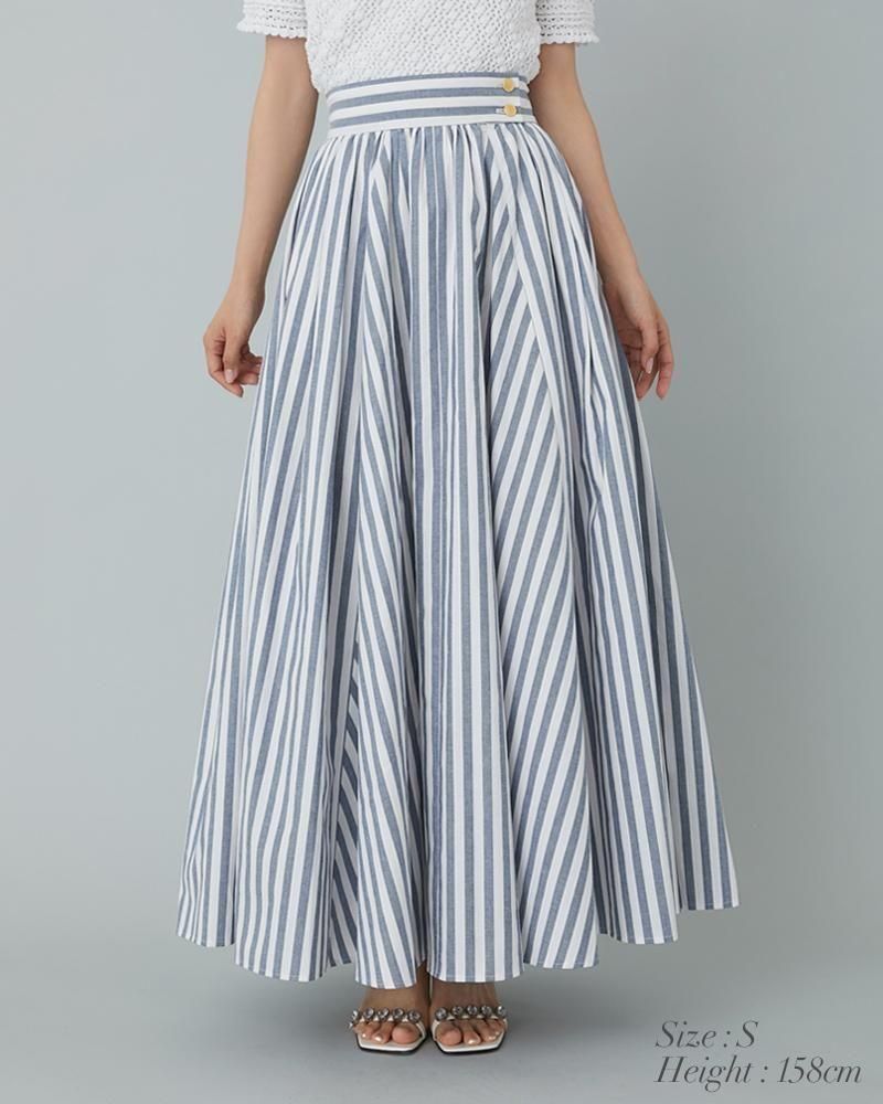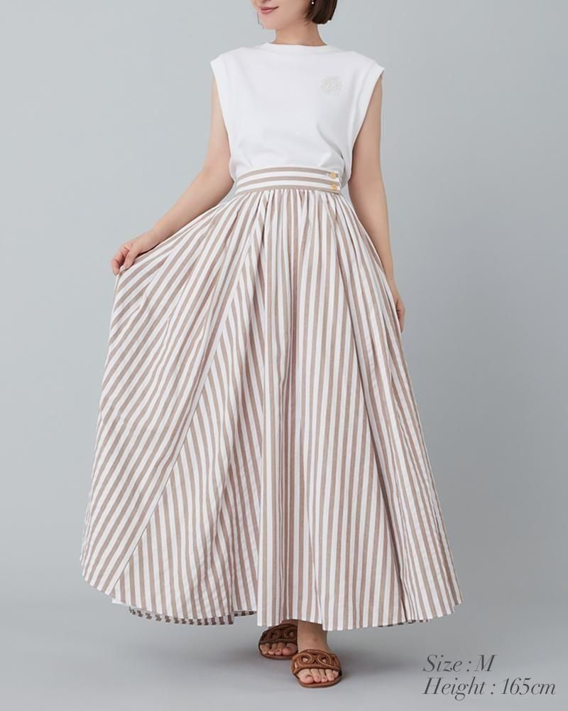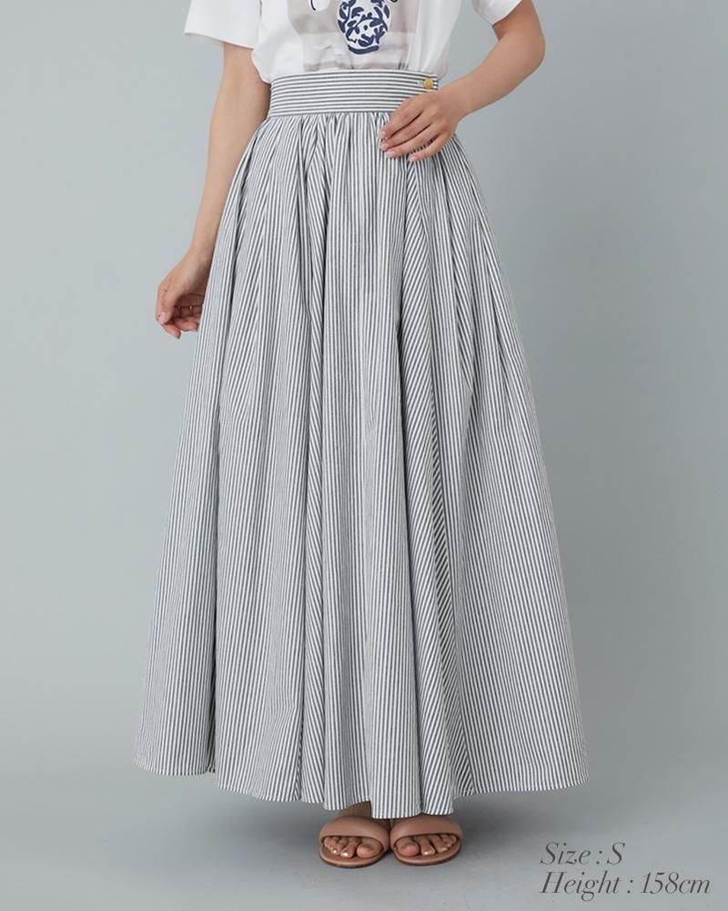 爽やかなストライプ柄に、贅沢な分量感のフレアシルエットが魅力の一枚。