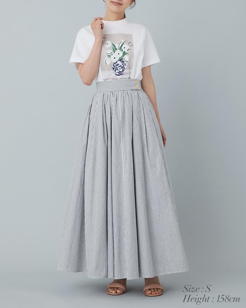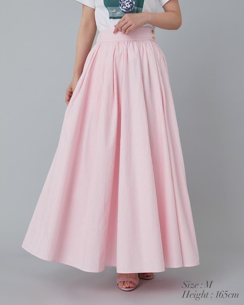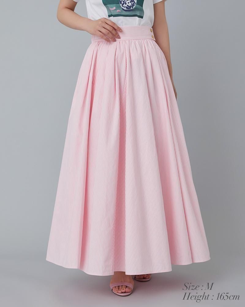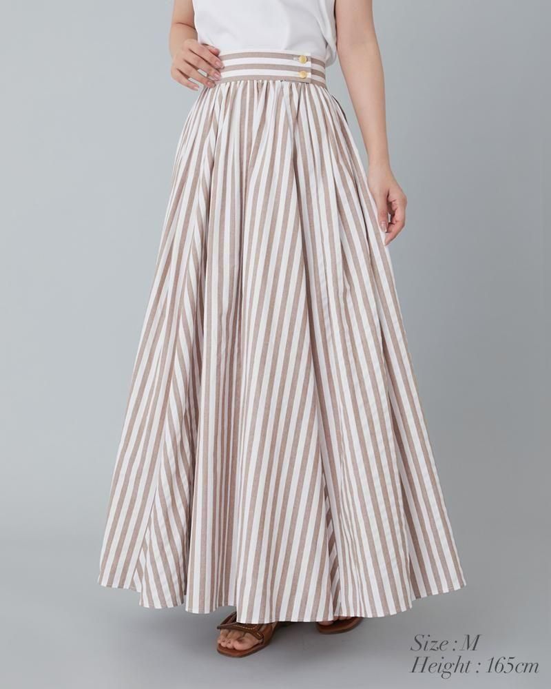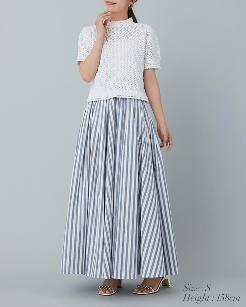 爽やかなストライプ柄に、贅沢な分量感のフレアシルエットが魅力の一枚。