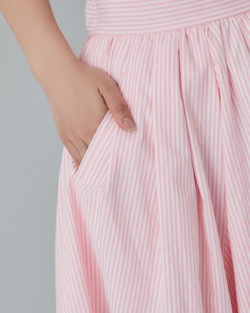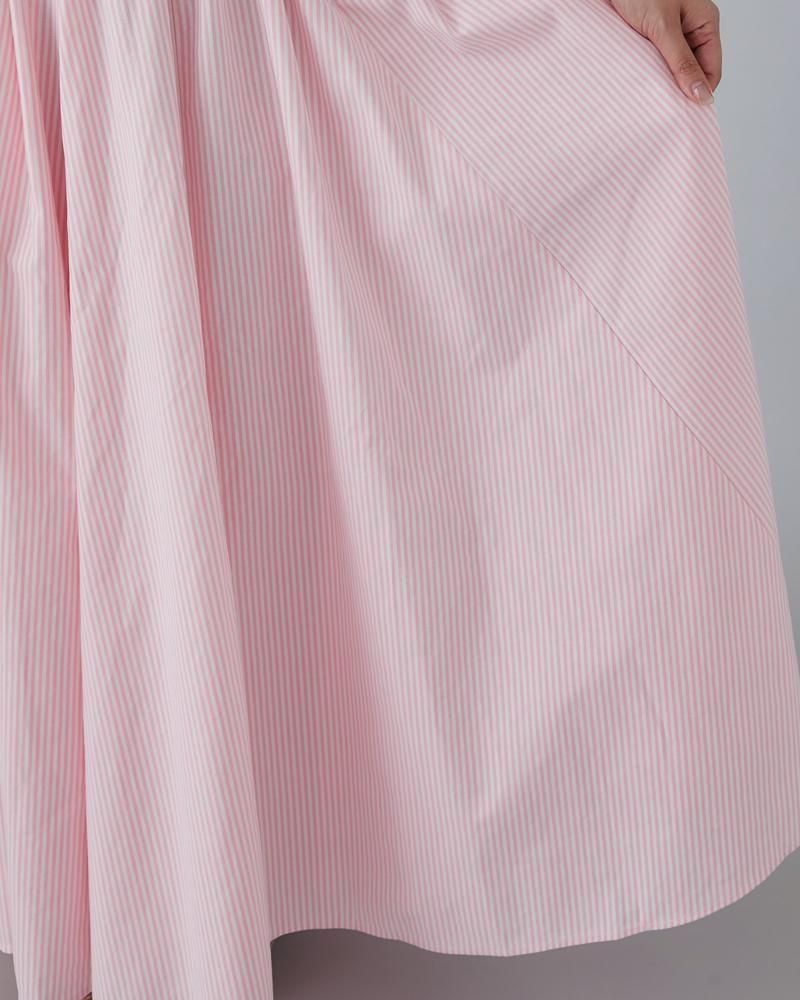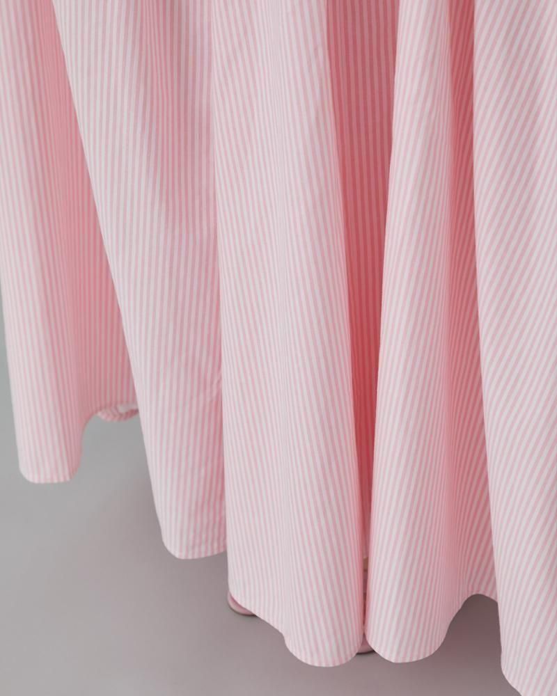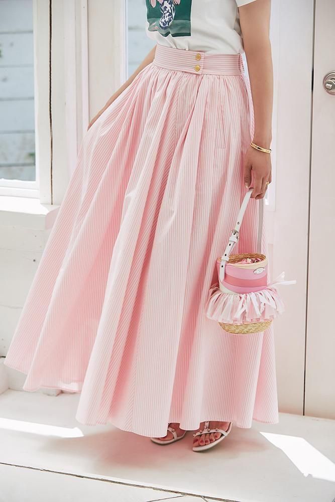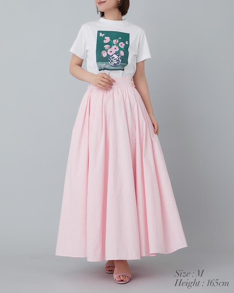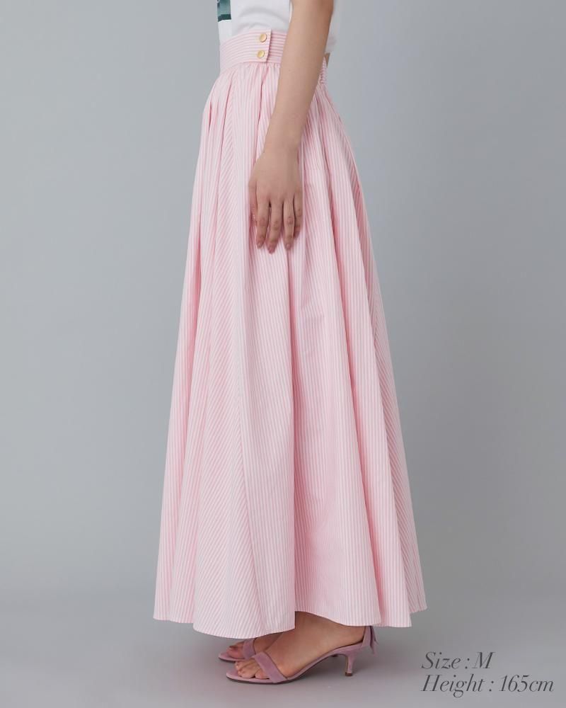 爽やかなストライプ柄に、贅沢な分量感のフレアシルエットが魅力の一枚。