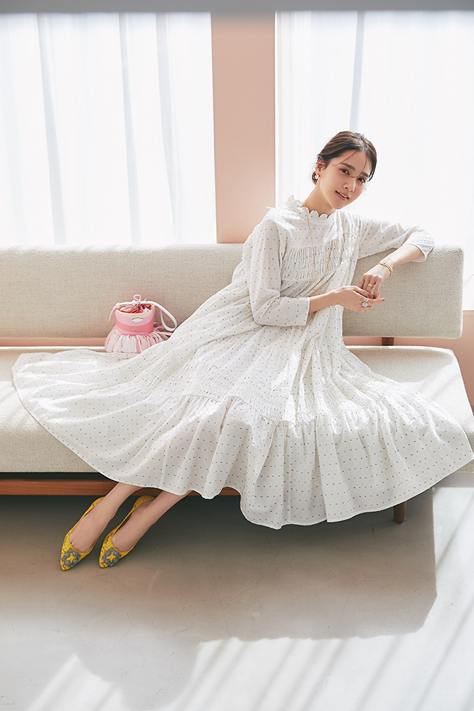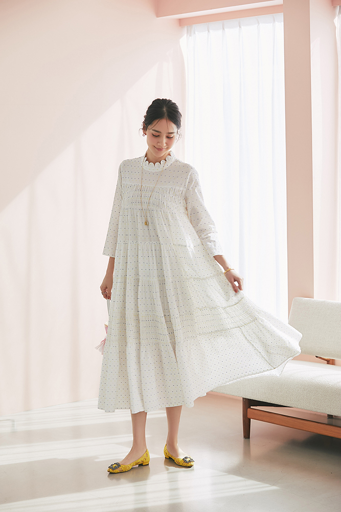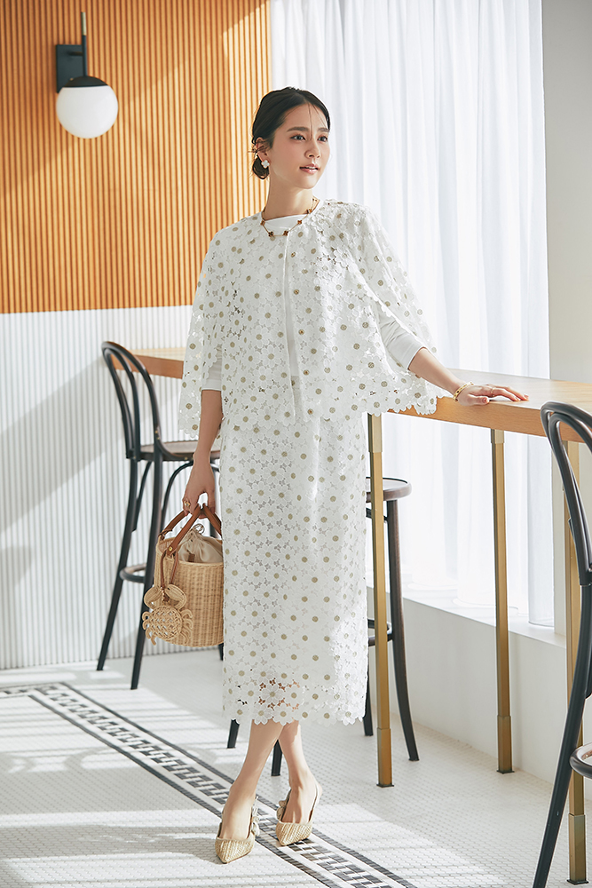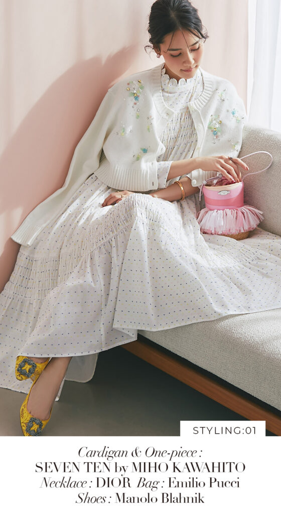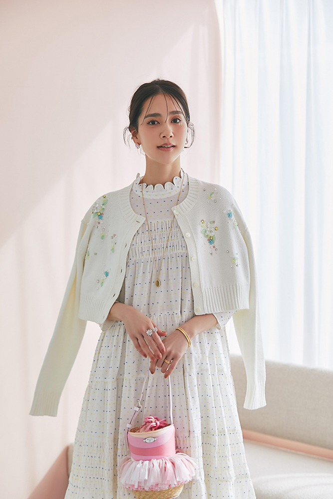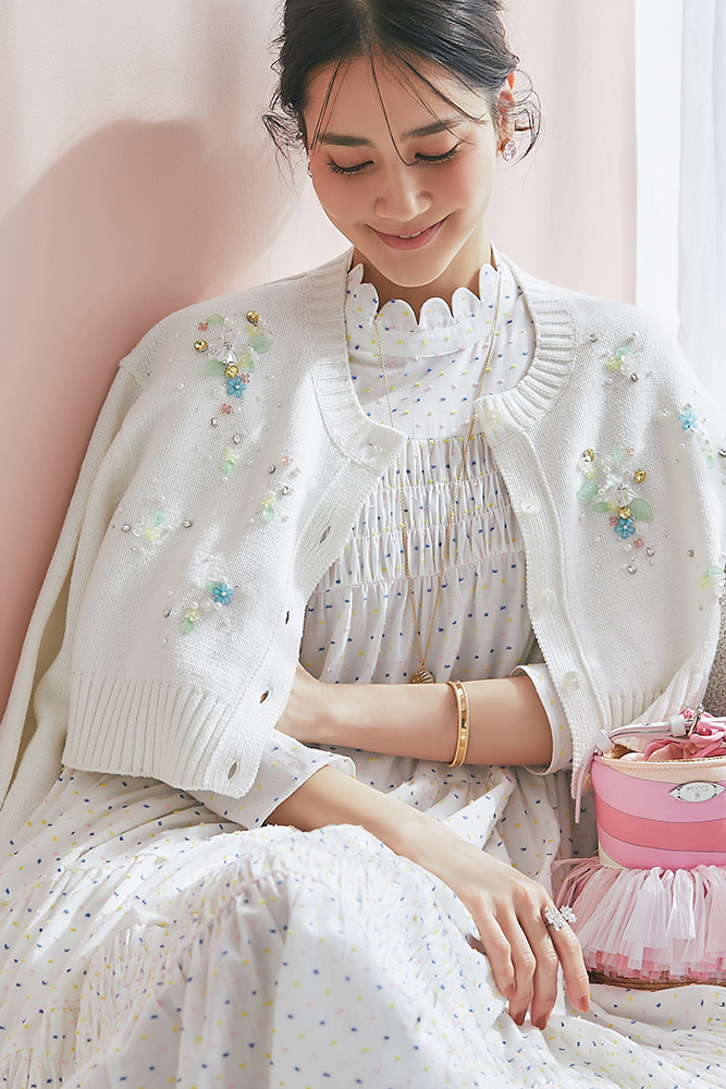 1 ビジューショートカーディガン(ホワイト) ¥39,600 / ドビーティアードロングワンピース(パステル) ¥48,400