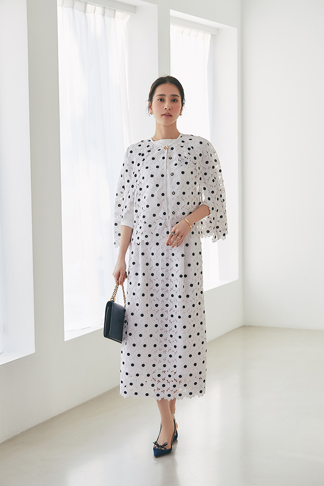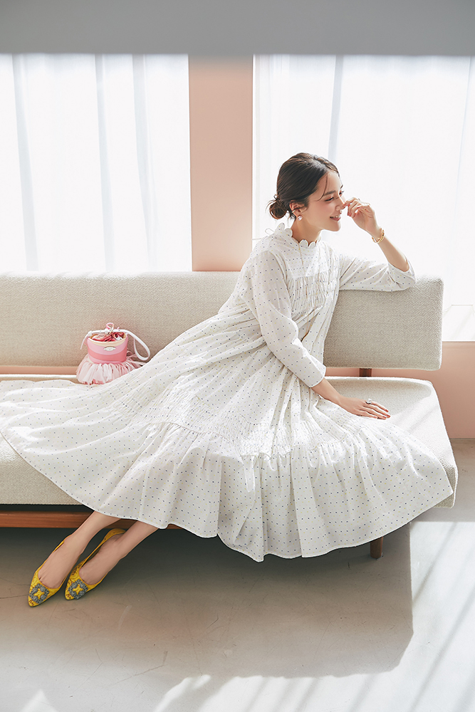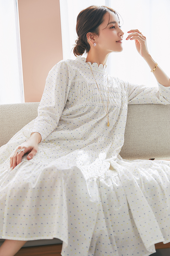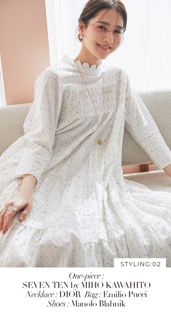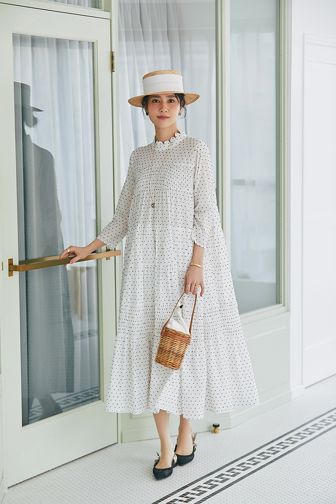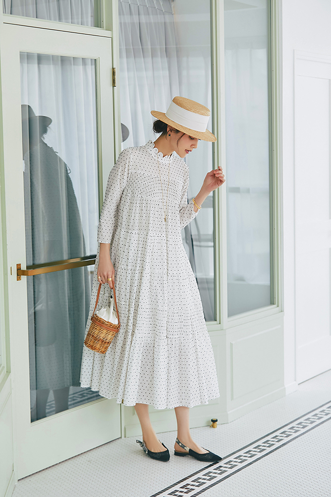 1 ビジューショートカーディガン(ホワイト) ¥39,600 / ドビーティアードロングワンピース(パステル) ¥48,400