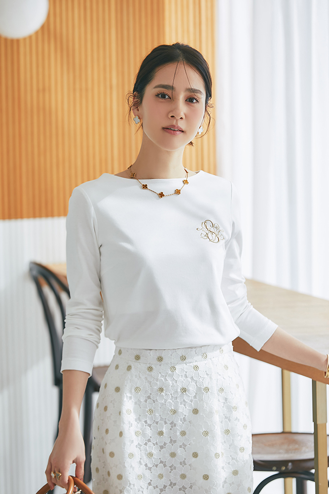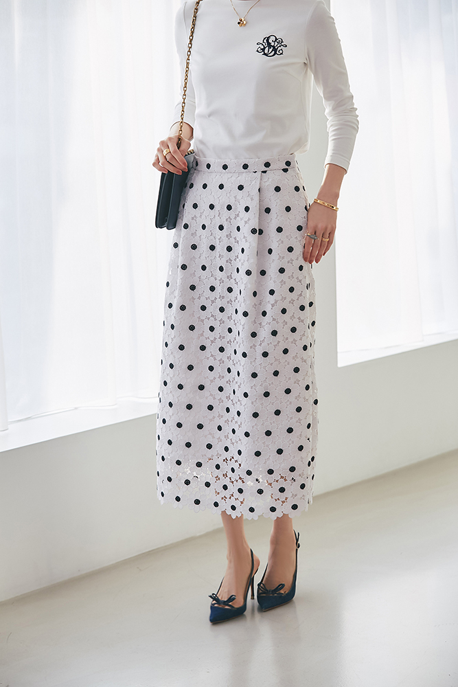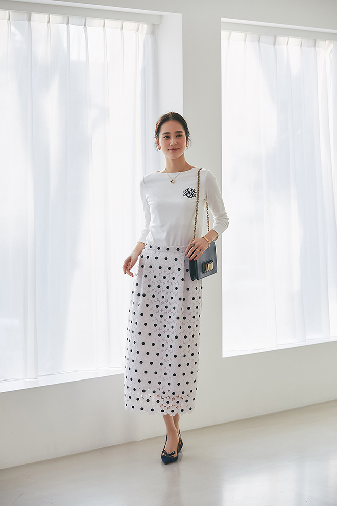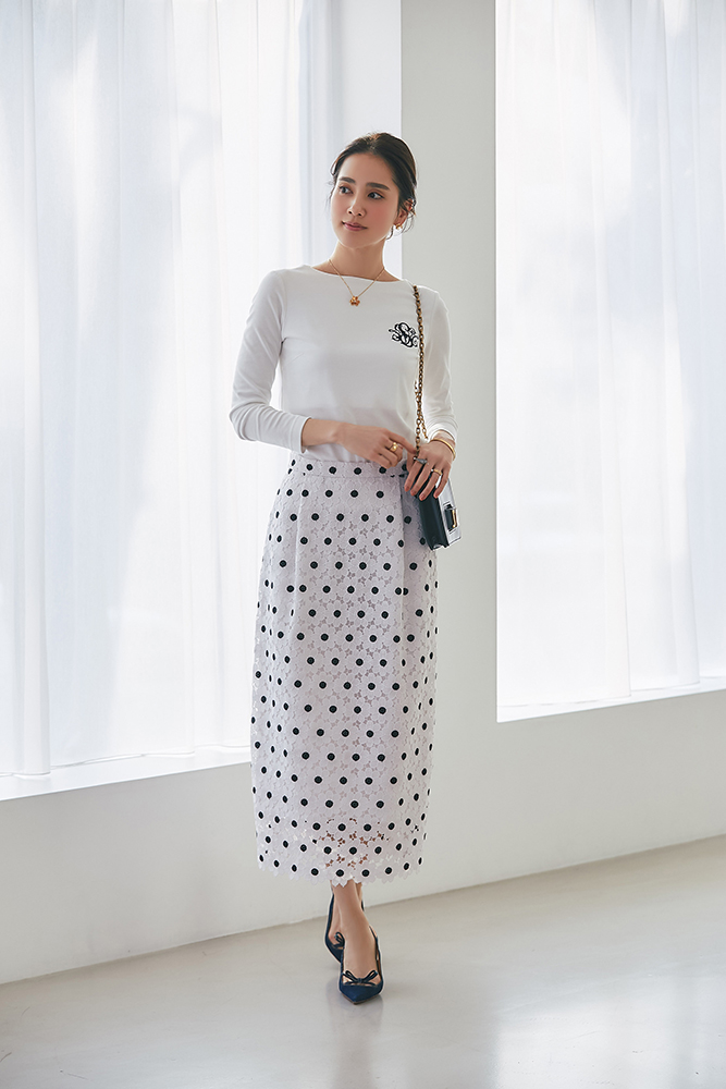 11 SVT刺繍ロンT(ホワイト×ネイビー) ¥20,900 / マーガレットレースタイトスカート(ネイビー) ¥34,100