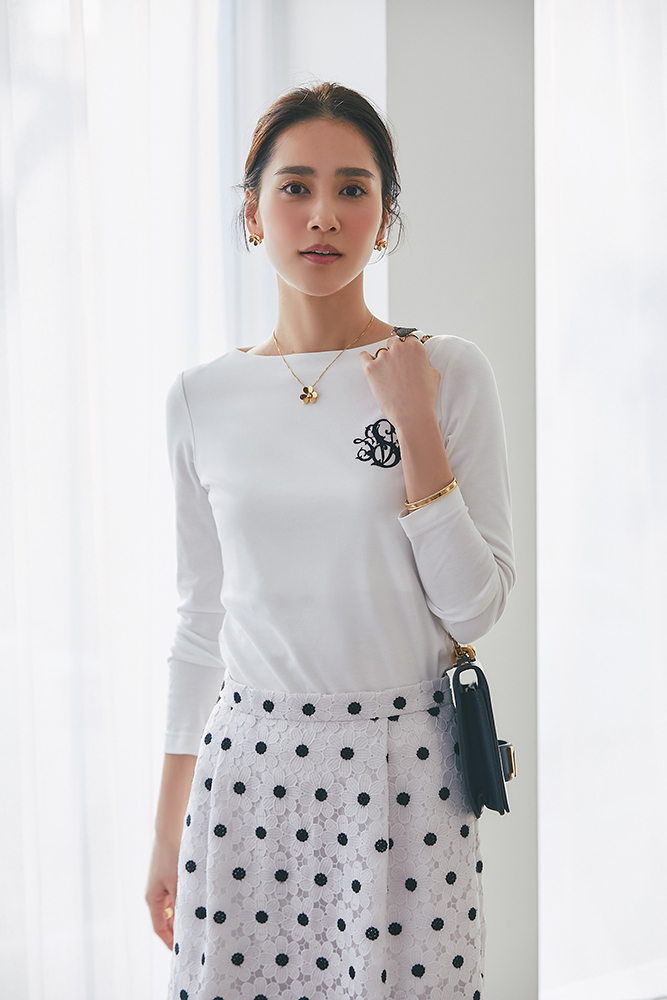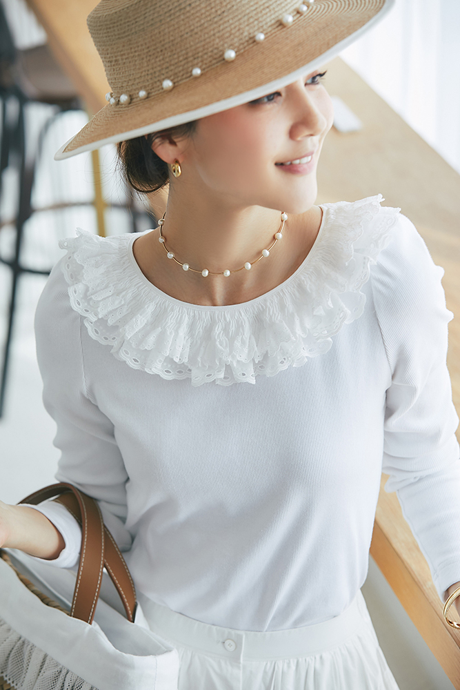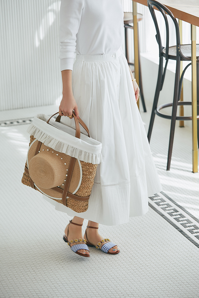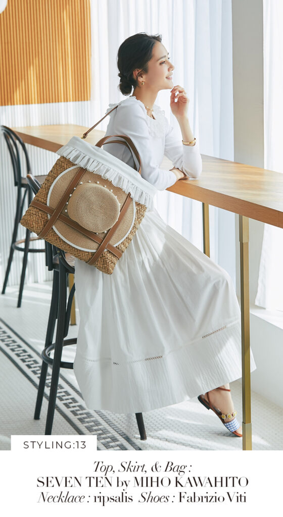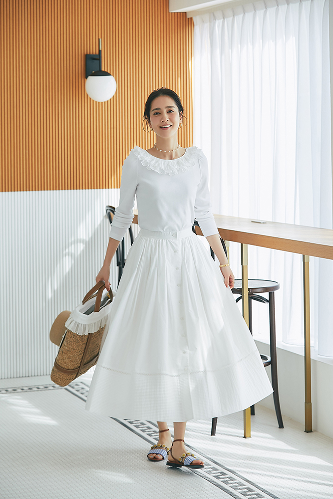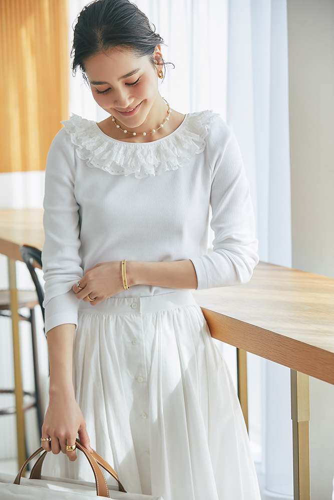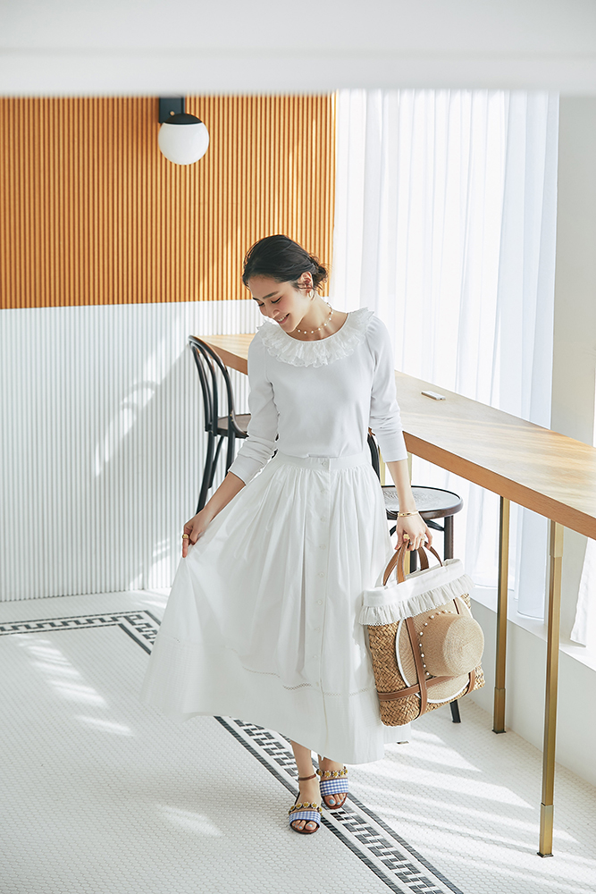 13 コットンフリルリブロンT(ホワイト) ¥25,300 / スカート 3月発売予定 / バッグ 3月発売予定