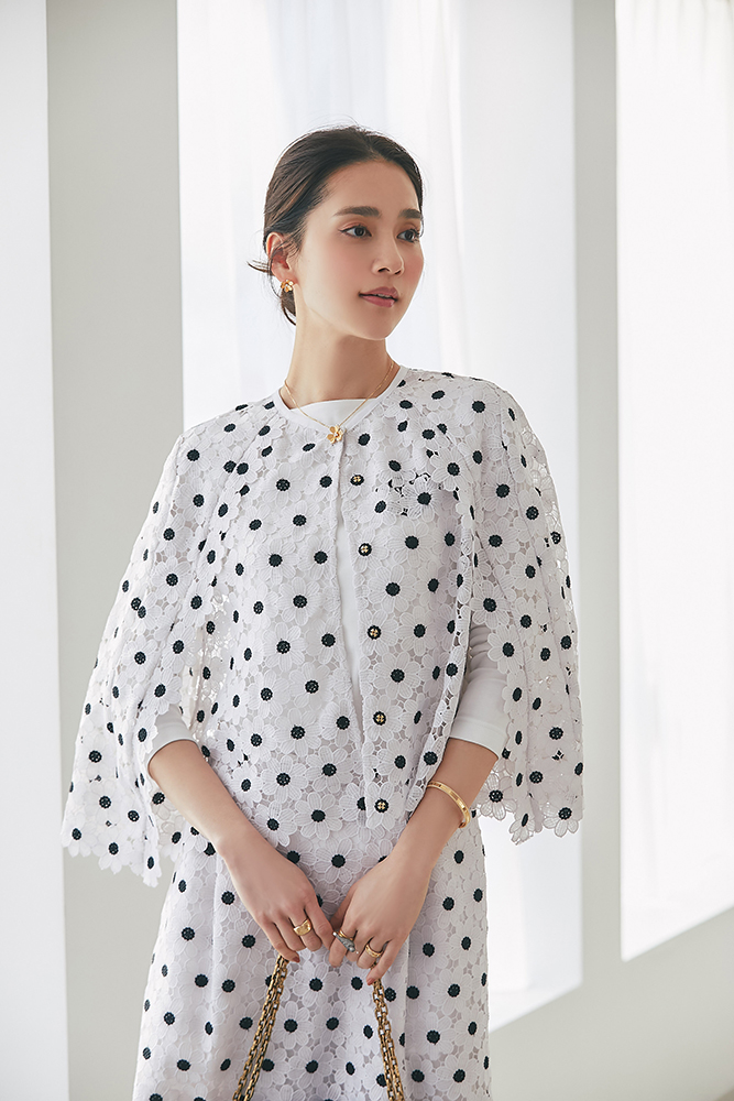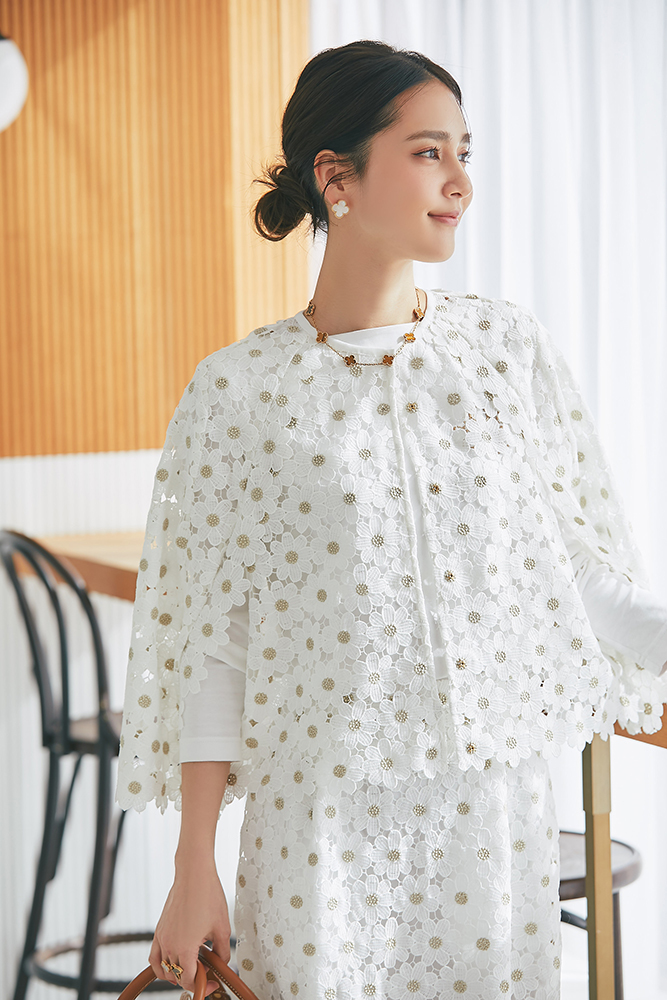 6 マーガレットレースポンチョ(ゴールド) ¥35,200 / SVT刺繍ロンT(ホワイト×ベージュ) ¥20,900 / マーガレットレースタイトスカート(ゴールド) ¥34,100 / バッグ 3月発売予定 / バッグチャーム 3月発売予定