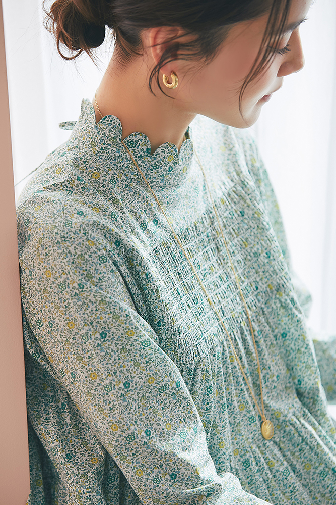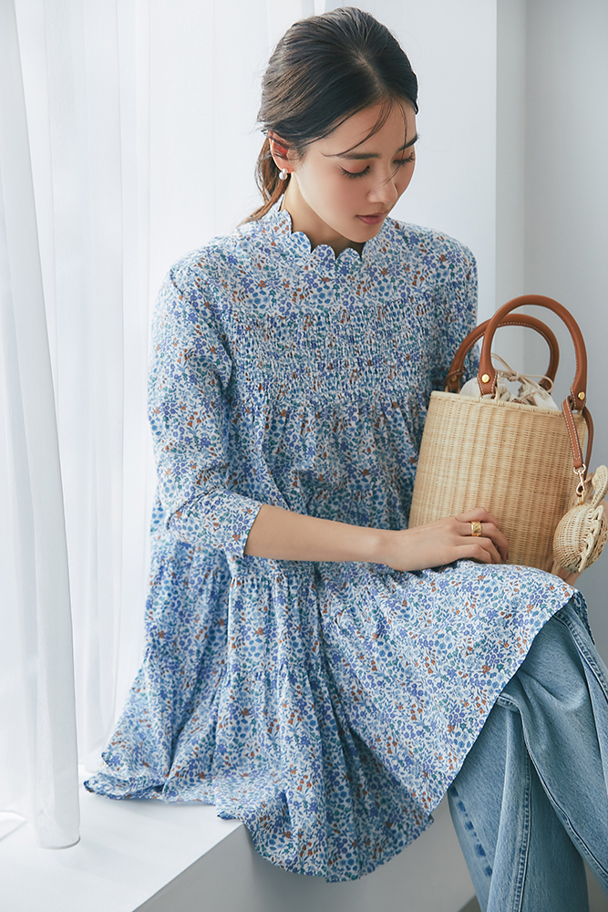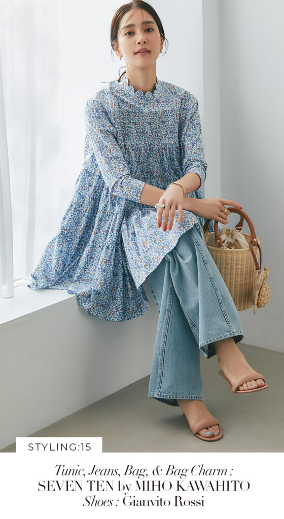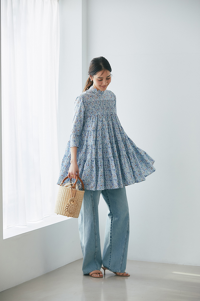 15 リバティシャーリングティアードチュニック(ブルー) ¥44,000 / デニム 3月発売予定 / バッグ 3月発売予定 / バッグチャーム 3月発売予定