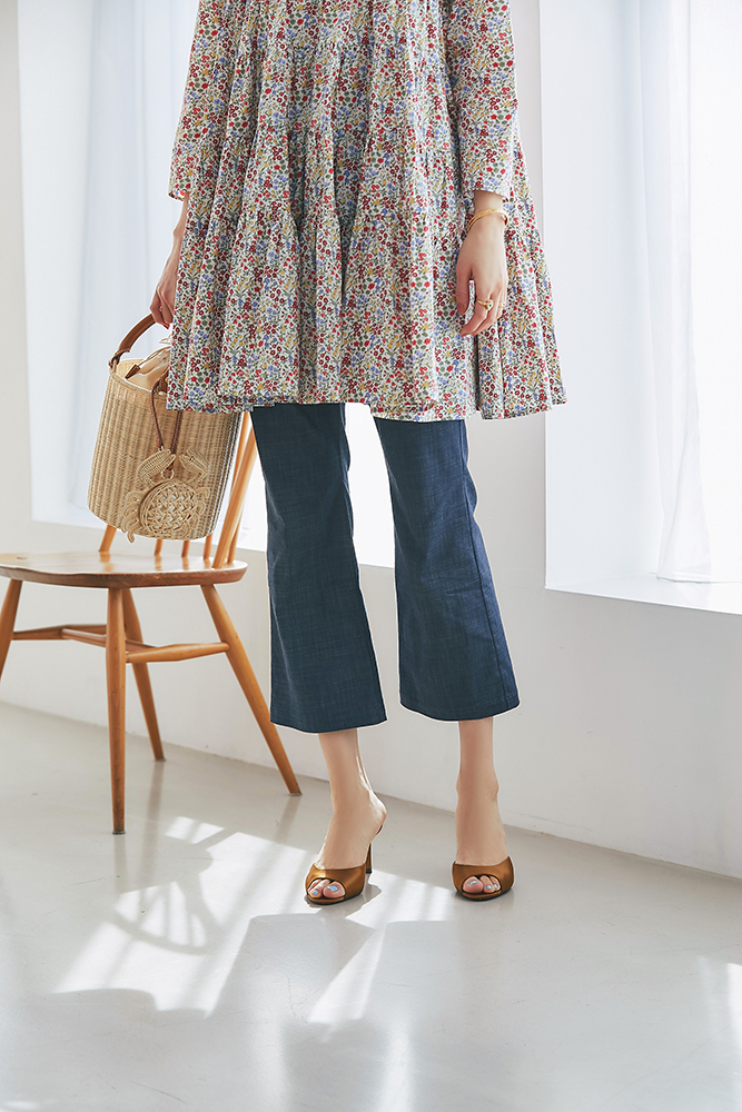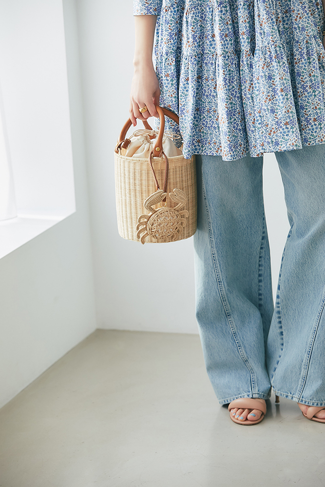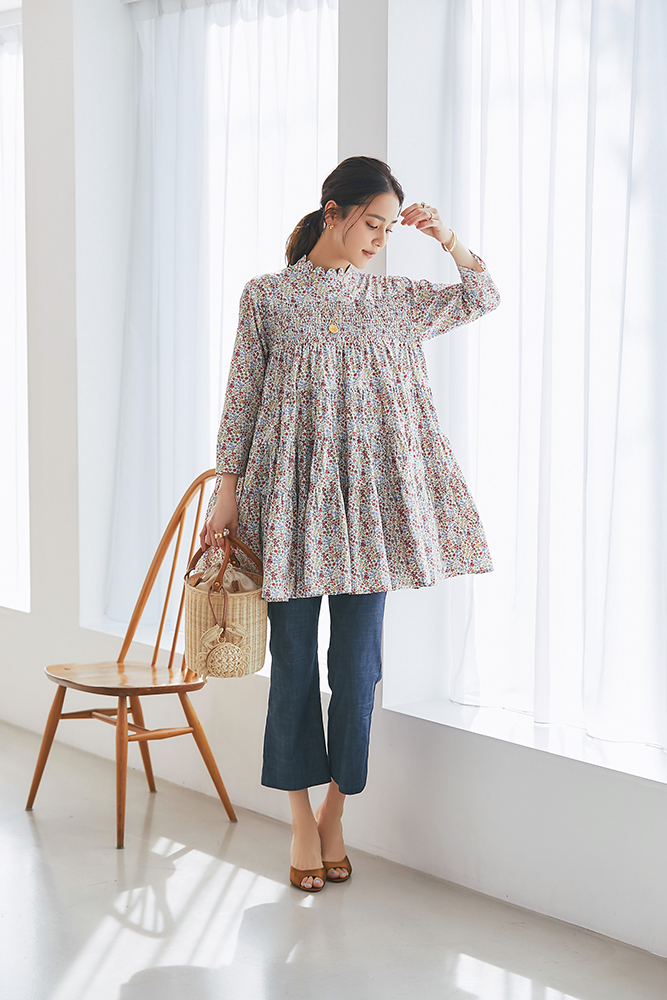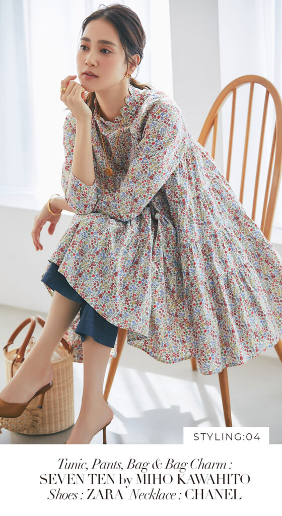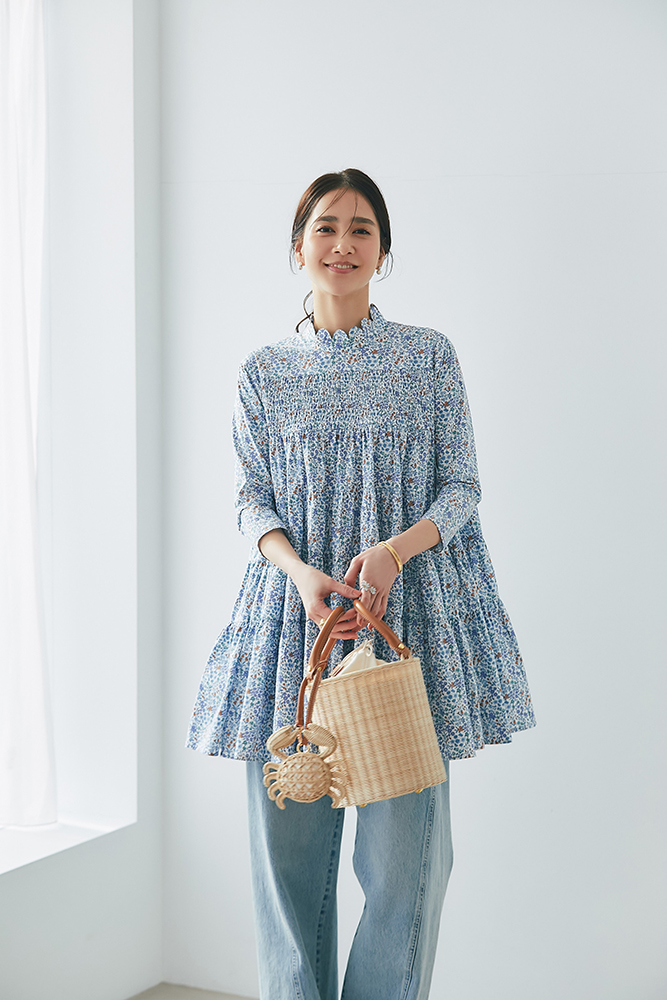 4 リバティシャーリングティアードチュニック(マルチ) ¥44,000 / スリムパンツ(デニム) ¥26,400 / バッグ 3月発売予定 / バッグチャーム 3月発売予定