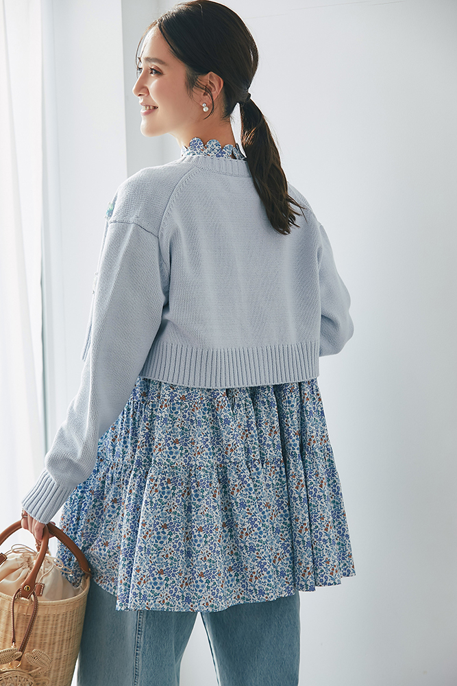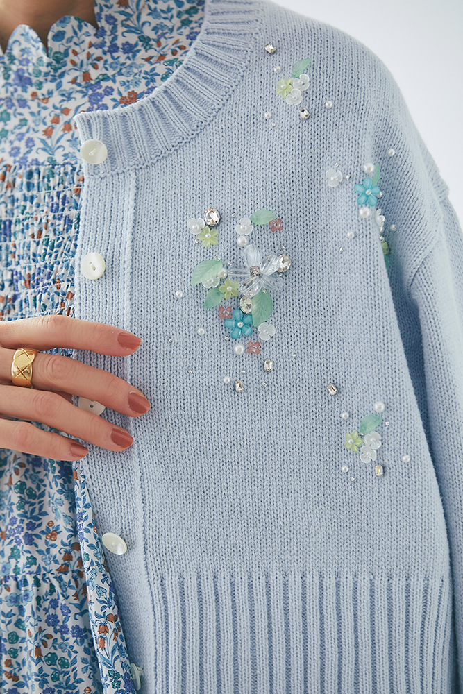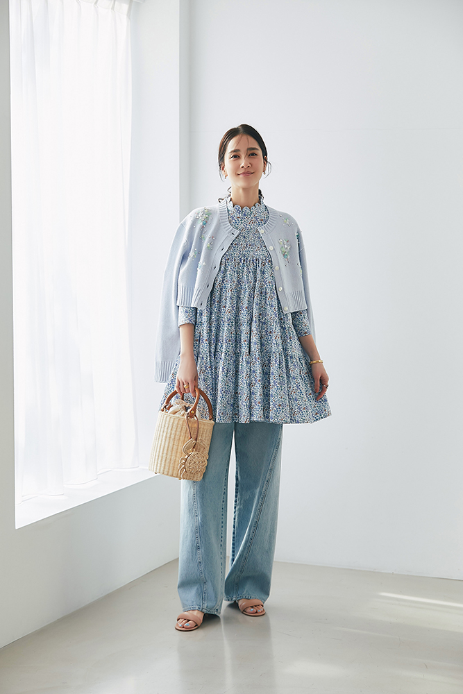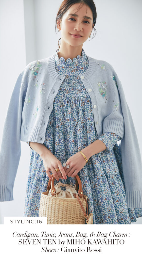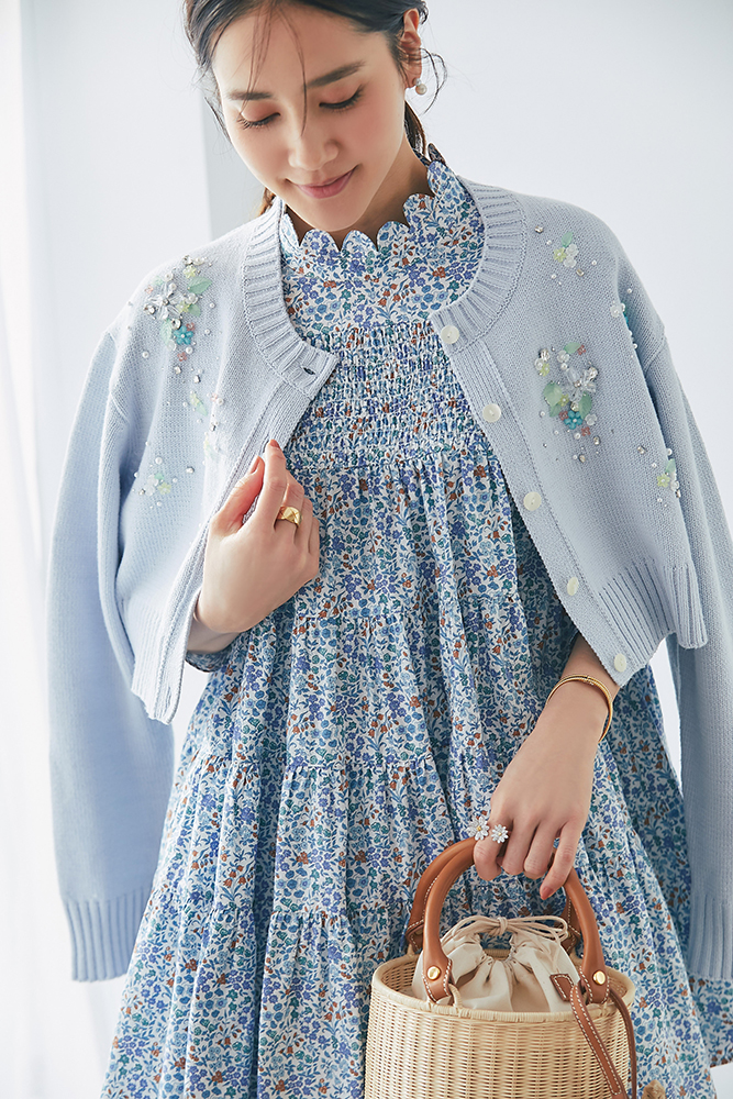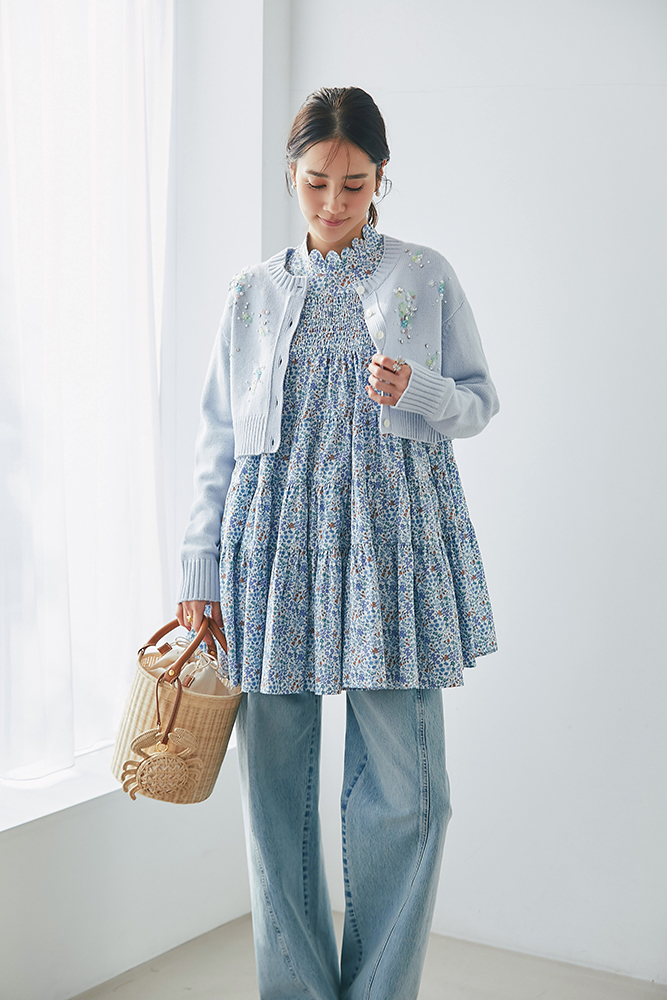 16 ビジューショートカーディガン(ライトブルー) ¥39,600 / リバティシャーリングティアードチュニック(ブルー) ¥44,000 / デニム 3月発売予定 / バッグ 3月発売予定 / バッグチャーム 3月発売予定
