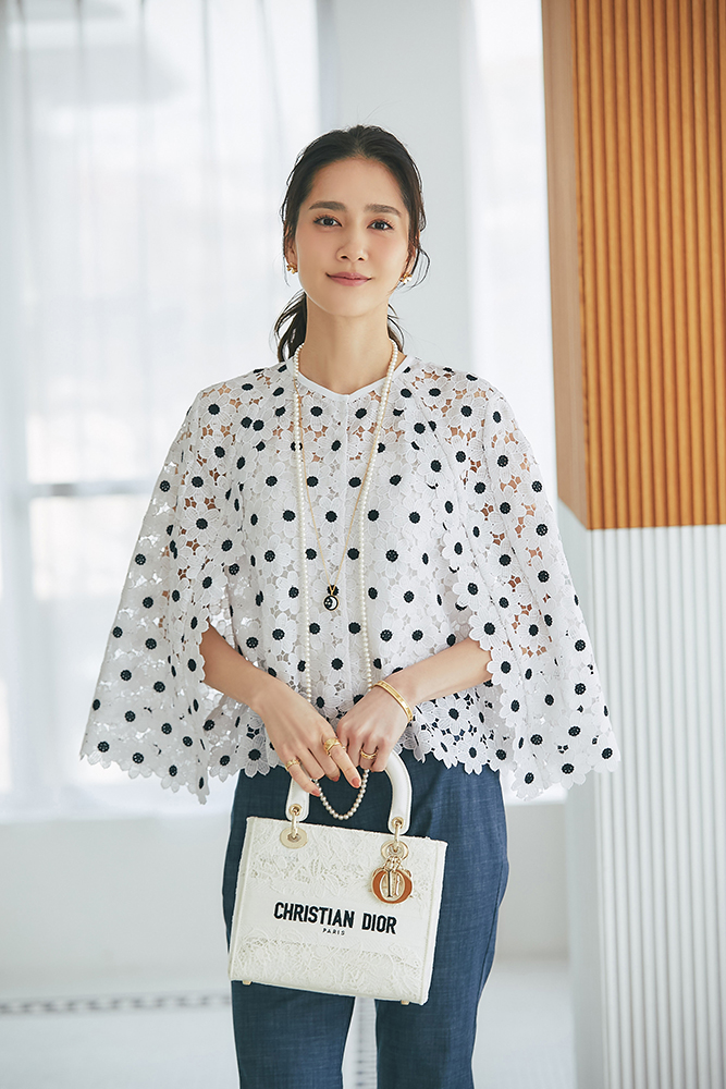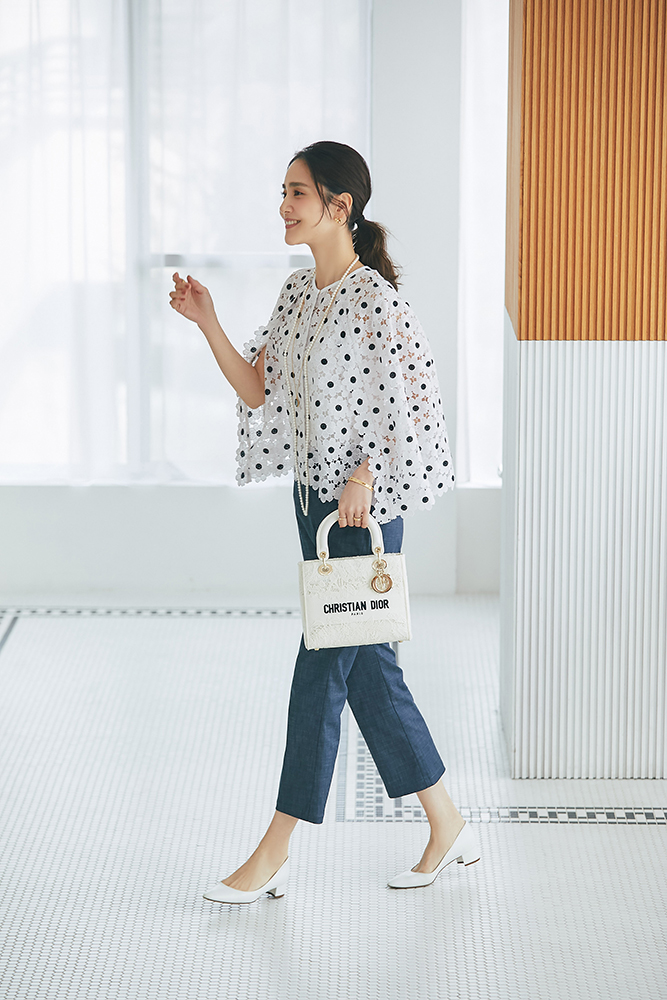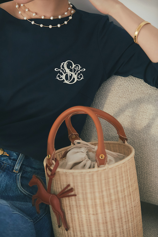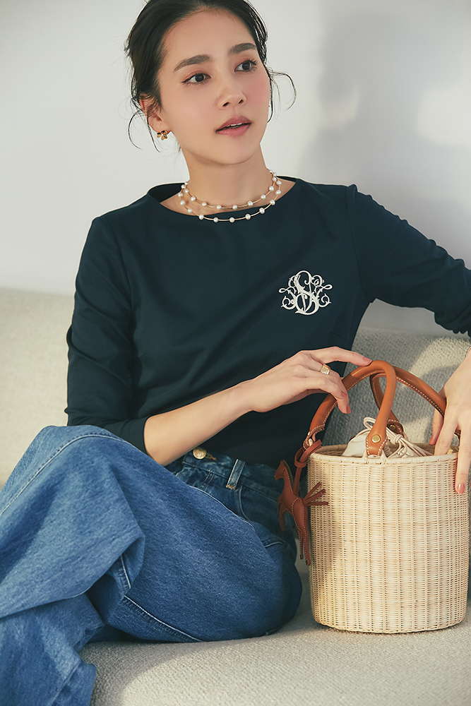 20 マーガレットレースポンチョ(ネイビー) ¥35,200 / SVT刺繍ロンT(ネイビー) ¥20,900 / デニム 3月発売予定 / バッグ 3月発売予定 / バッグチャーム 発売月未定
