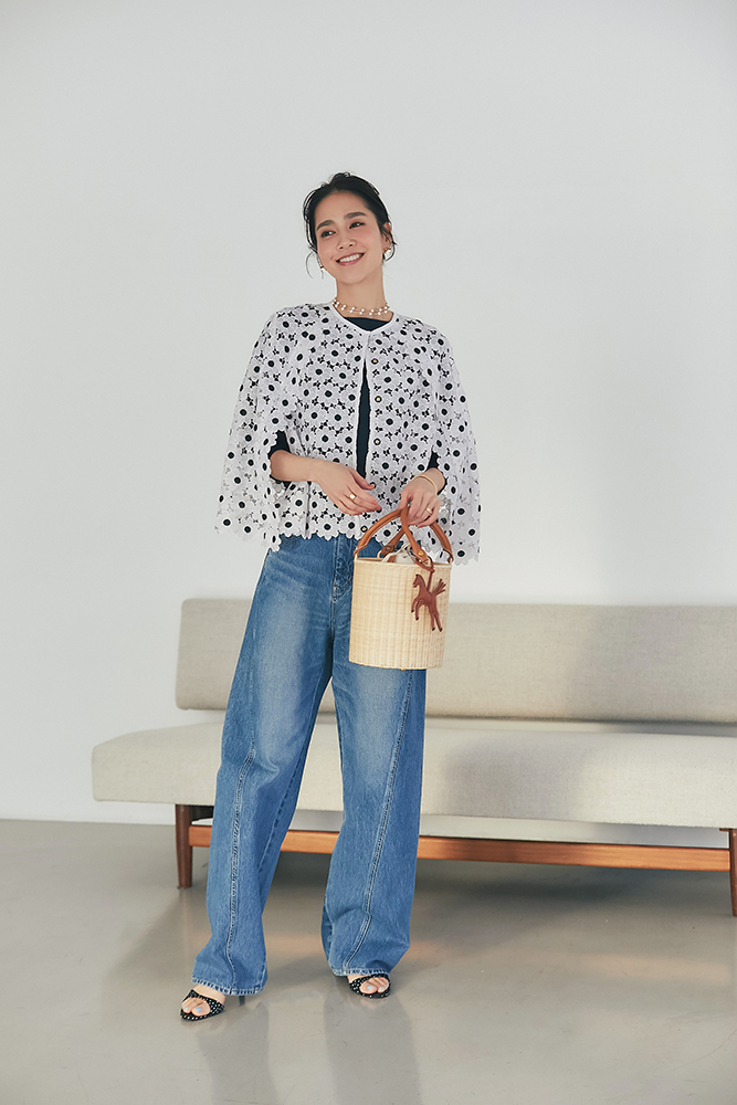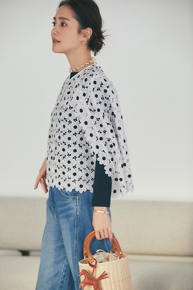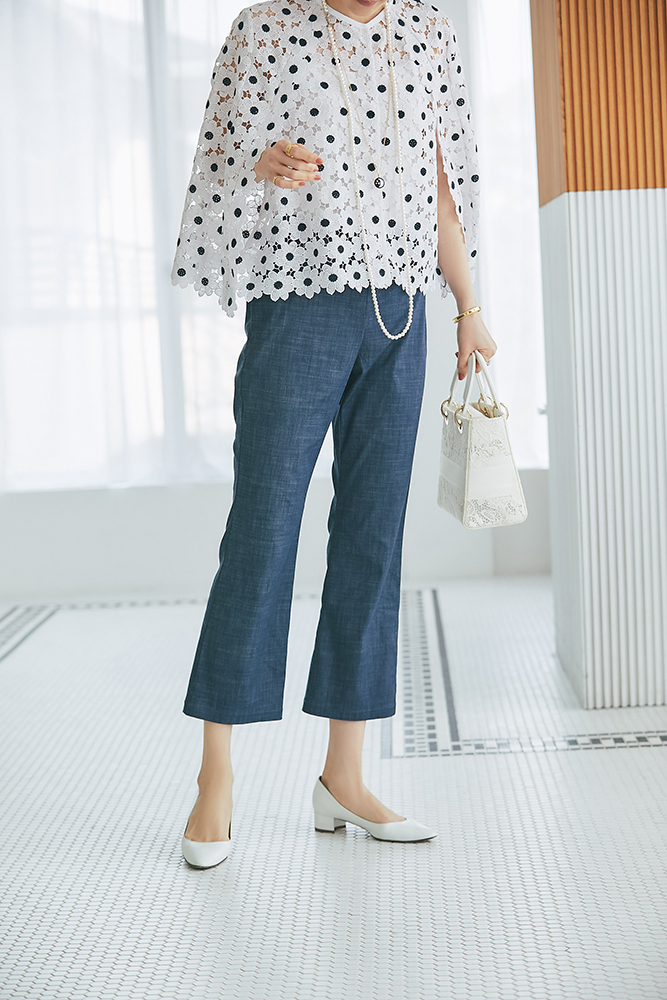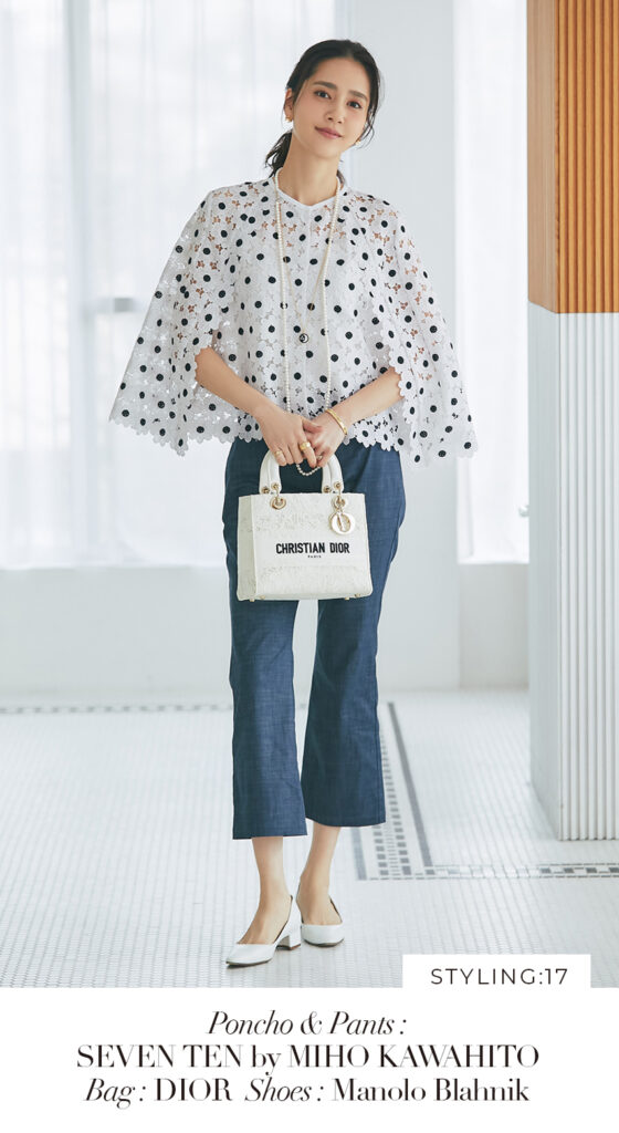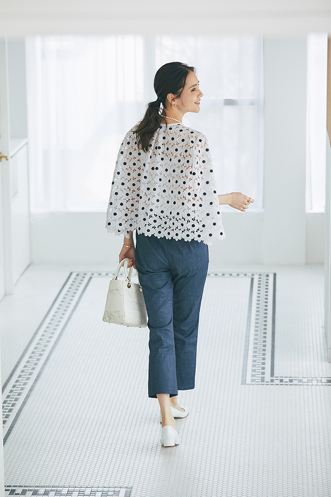 17 マーガレットレースポンチョ(ネイビー) ¥35,200 / スリムパンツ(デニム) ¥26,400