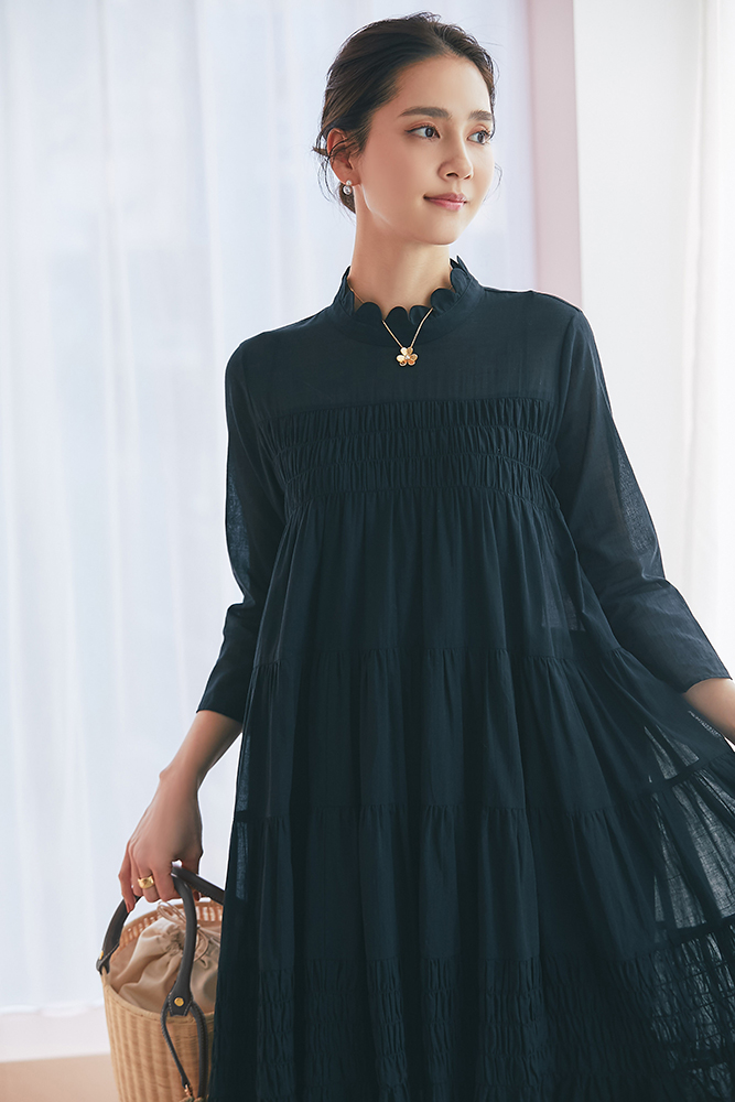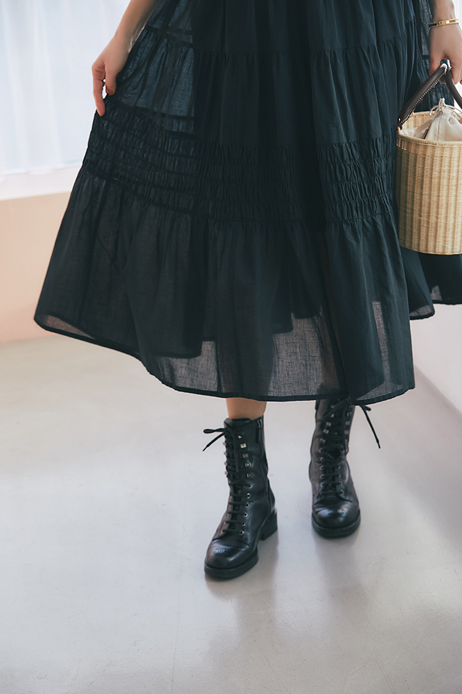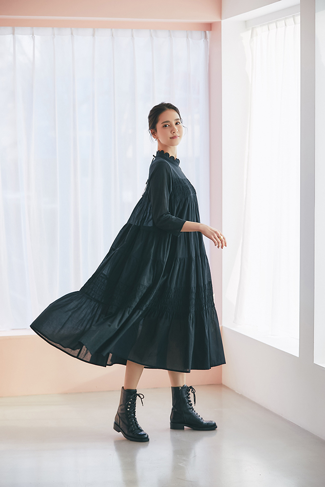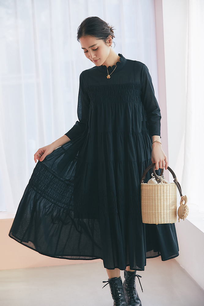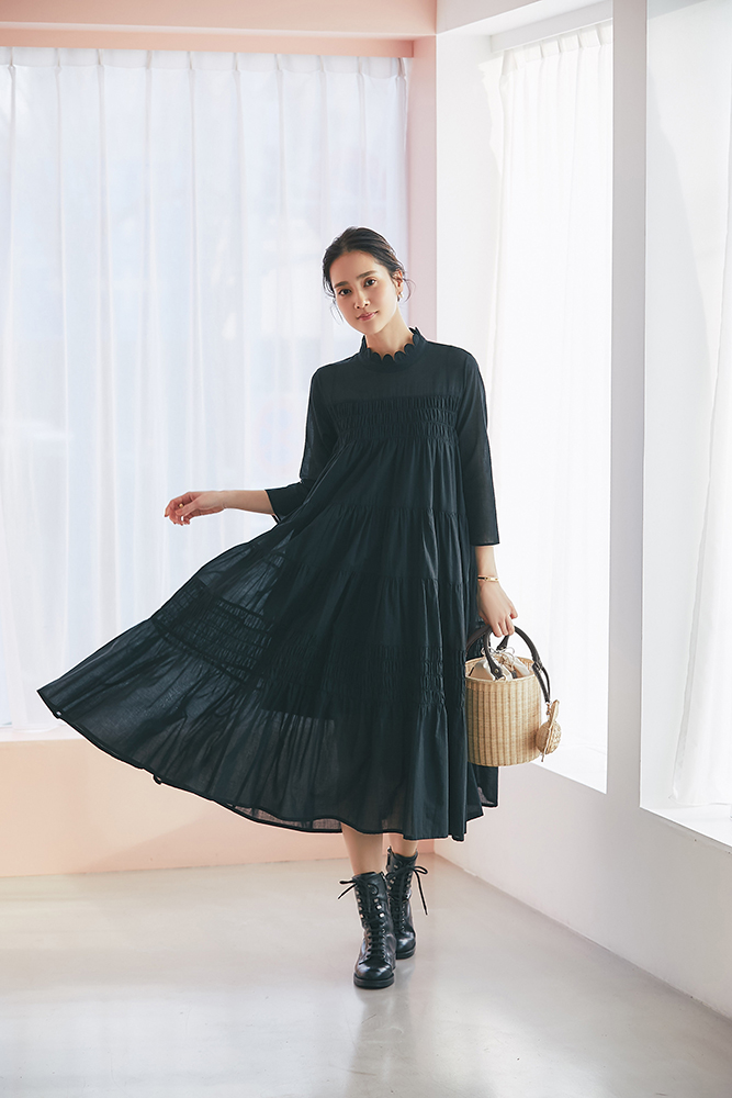 18 ドビーティアードロングワンピース(ブラック) ¥48,400 / バッグ 3月発売予定 / バッグチャーム 3月発売予定