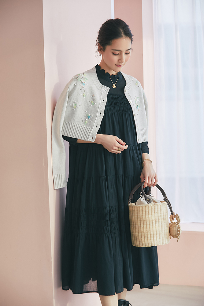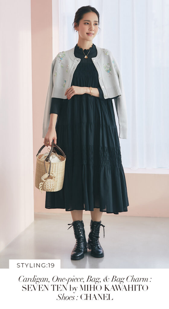 19 ビジューショートカーディガン(ライトグレー) ¥39,600 / ドビーティアードロングワンピース(ブラック) ¥48,400 / バッグ 3月発売予定 / バッグチャーム 3月発売予定
