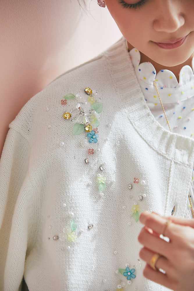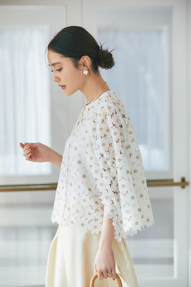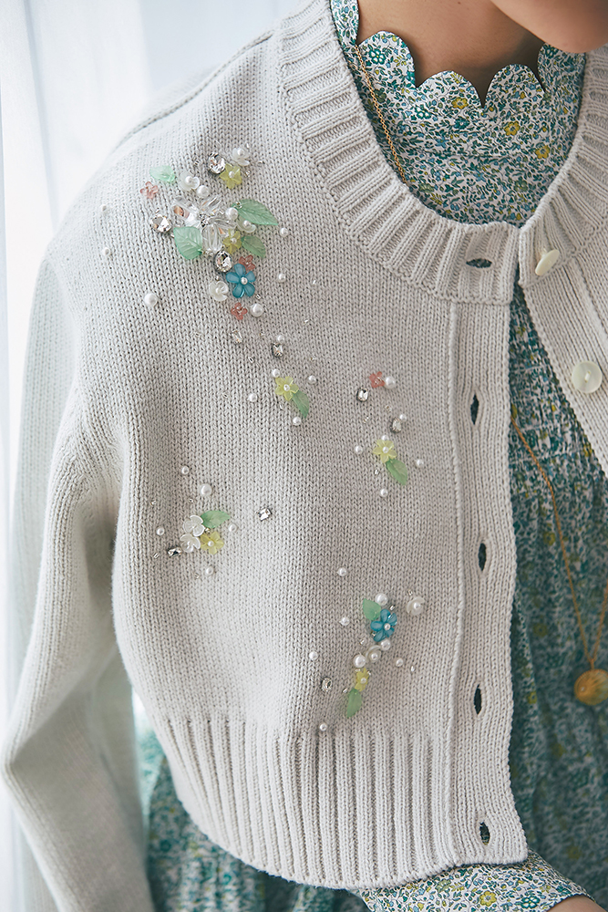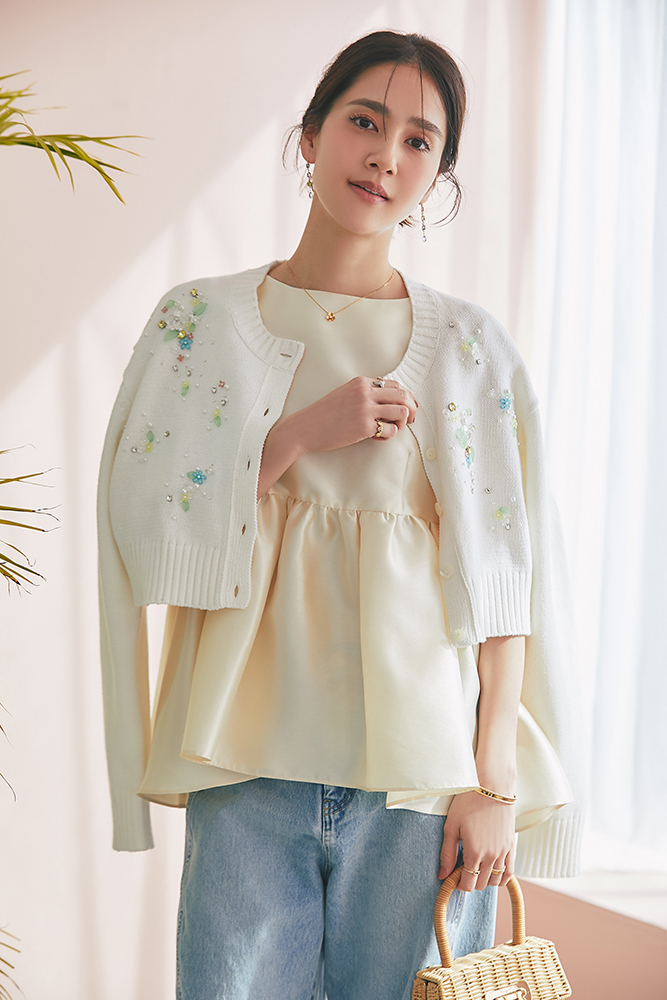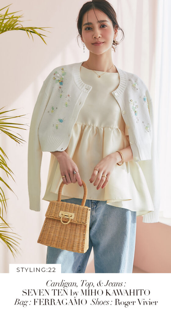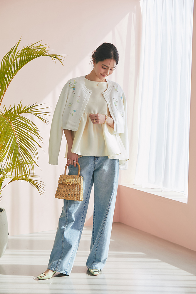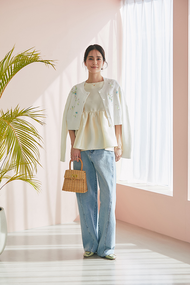 22 ビジューショートカーディガン(ホワイト) ¥39,600 / トップス 3月発売予定 / デニム 3月発売予定