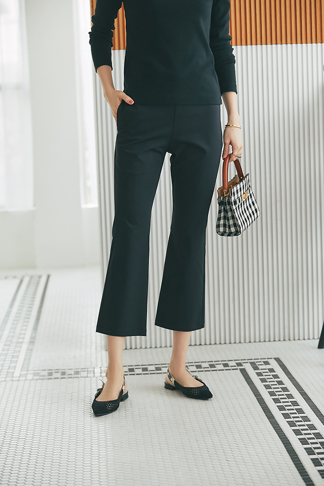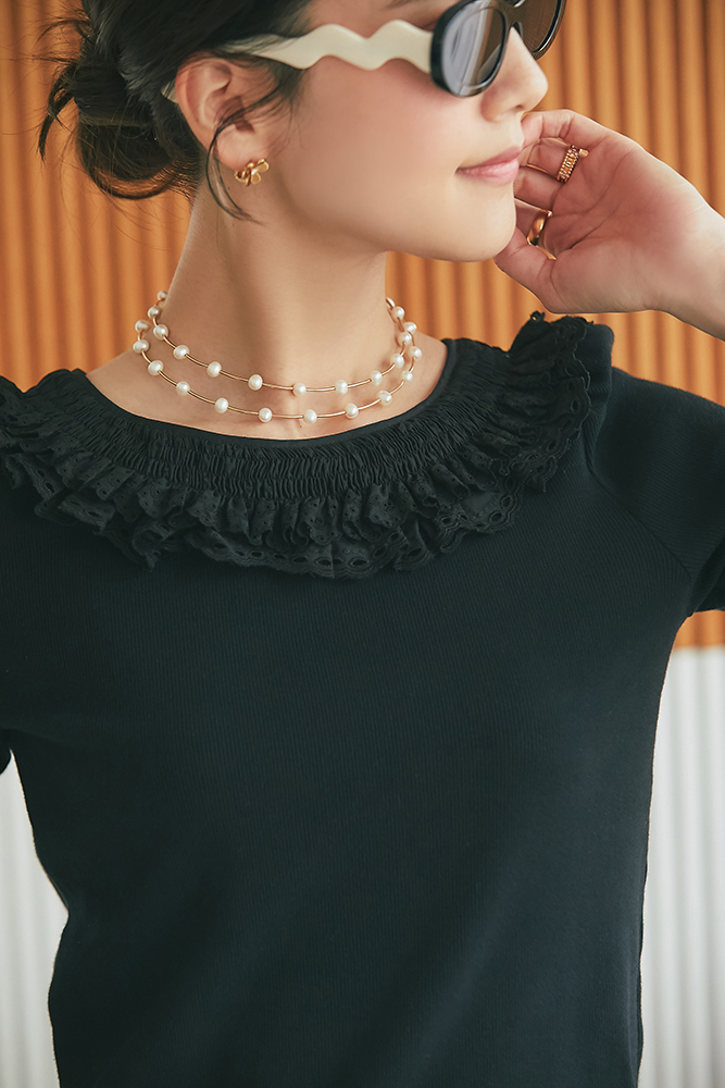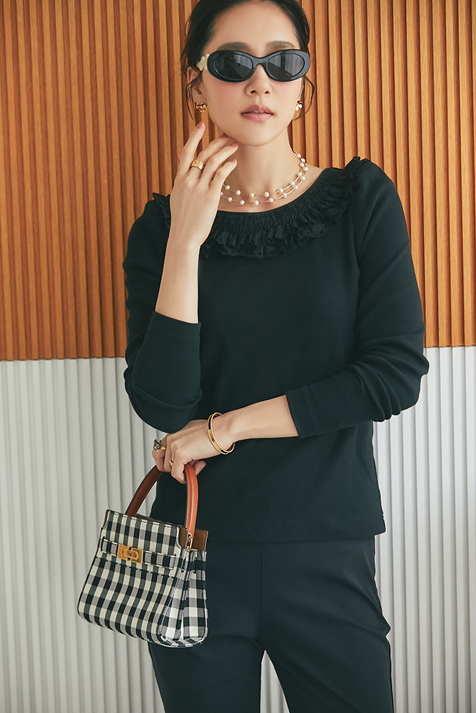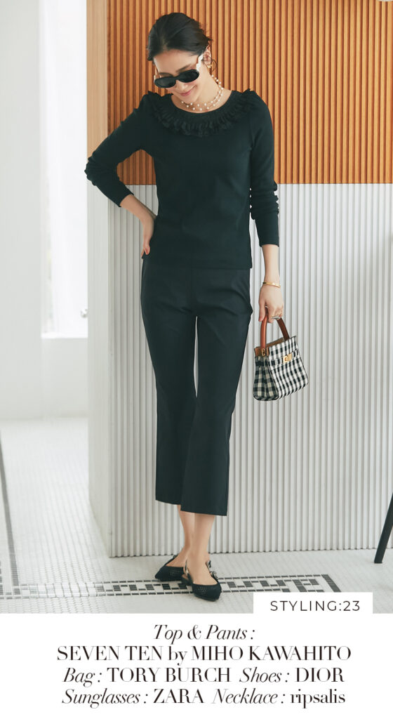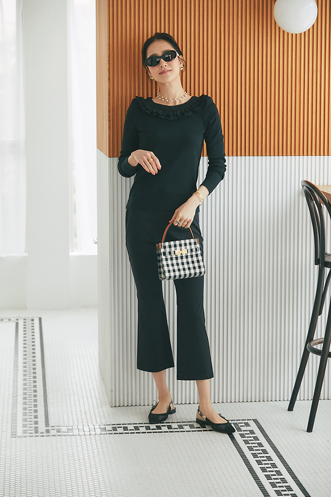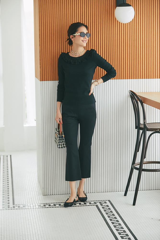 23 コットンフリルリブロンT(ブラック) ¥25,300 / スリムパンツ(ブラック) ¥26,400