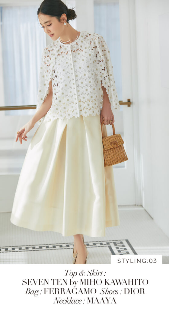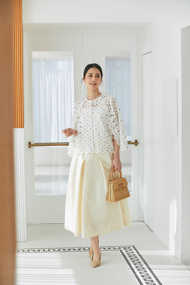3 マーガレットレースポンチョ(ゴールド) ¥35,200 / ミカドサテンフレアスカート(ペールイエロー) ¥33,000