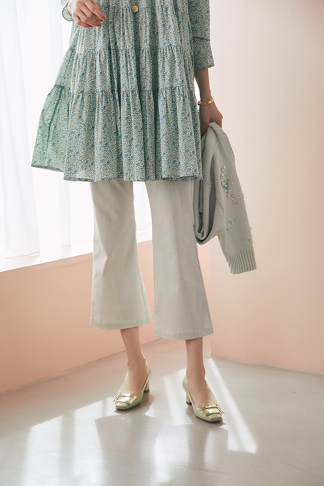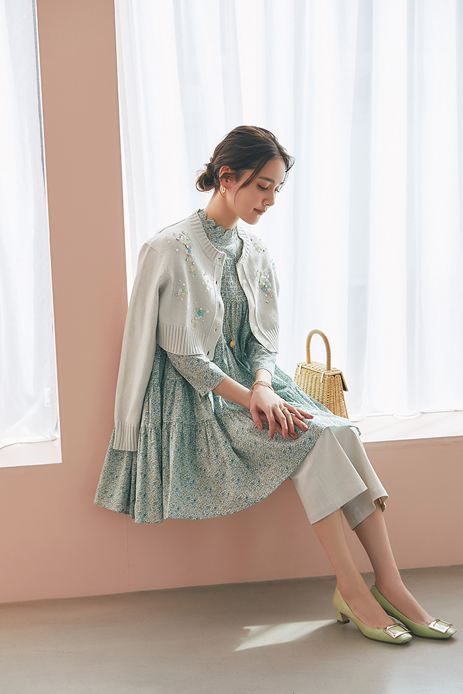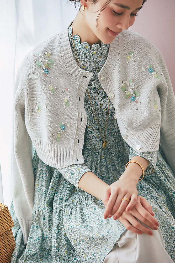 8 ビジューショートカーディガン(ライトグレー) ¥39,600 / リバティシャーリングティアードチュニック(グリーン) ¥44,000 / スリムパンツ(ベージュ) ¥26,400