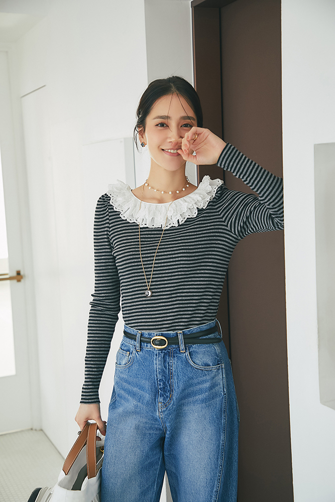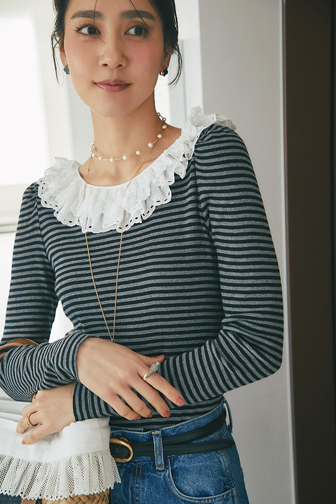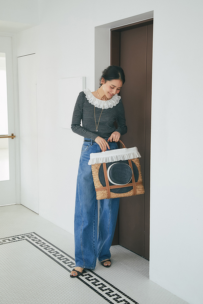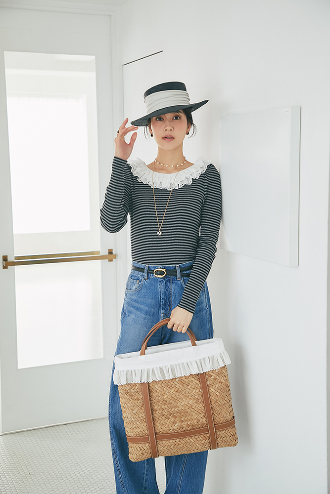 9 コットンフリルリブロンT(ボーダー) ¥25,300 / デニム 3月発売予定 / バッグ 3月発売予定