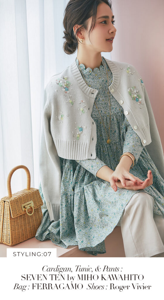 7 ビジューショートカーディガン(ライトグレー) ¥39,600 / リバティシャーリングティアードチュニック(グリーン) ¥44,000 / スリムパンツ(ベージュ) ¥26,400