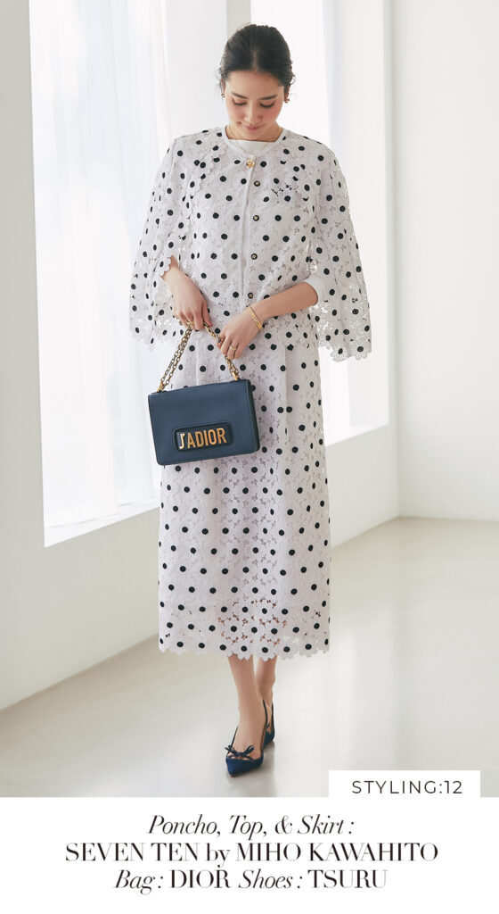 12 マーガレットレースポンチョ(ネイビー) ¥35,200 / SVT刺繍ロンT(ホワイト×ネイビー) ¥20,900 / マーガレットレースタイトスカート(ネイビー) ¥34,100