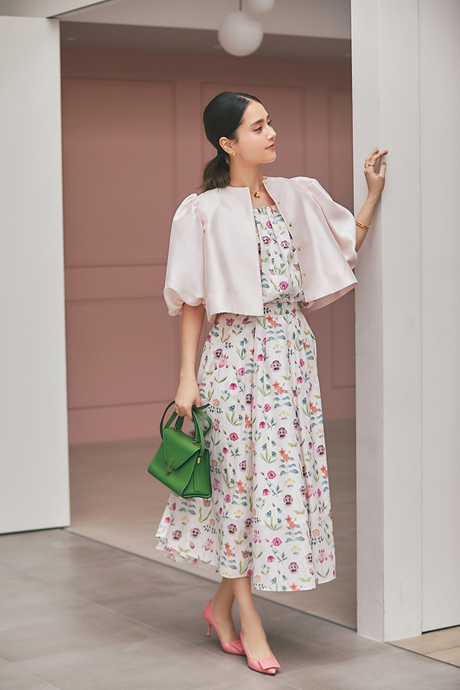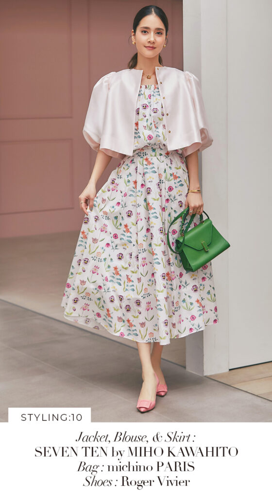 10 ミカドサテンショートジャケット(ペールピンク) ¥38,500 / リバティフローラルバルーンブラウス(ピンク) ¥37,400 / リバティフローラルタックスカート(ピンク) ¥39,600